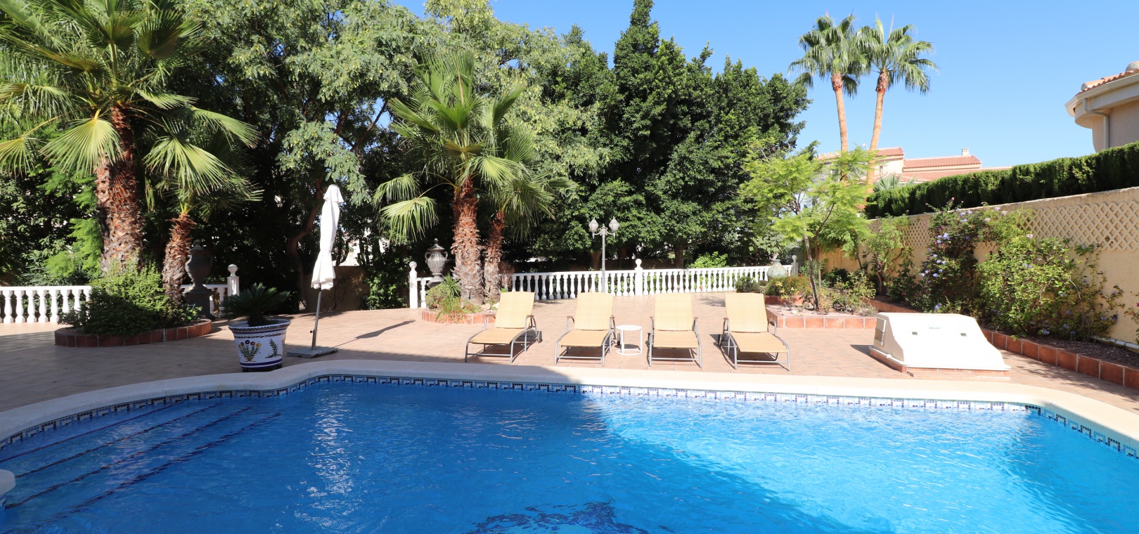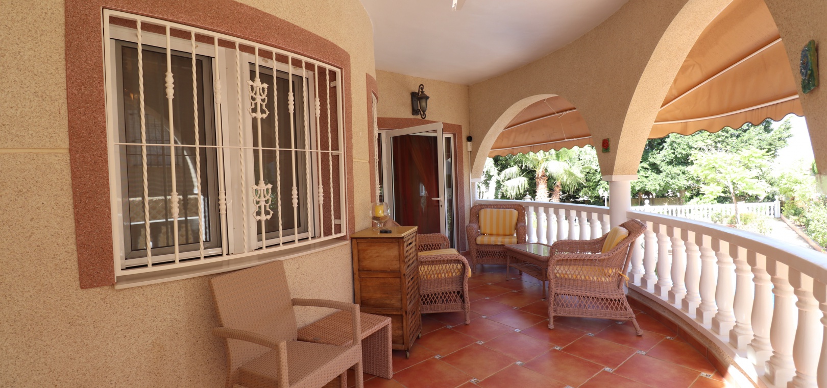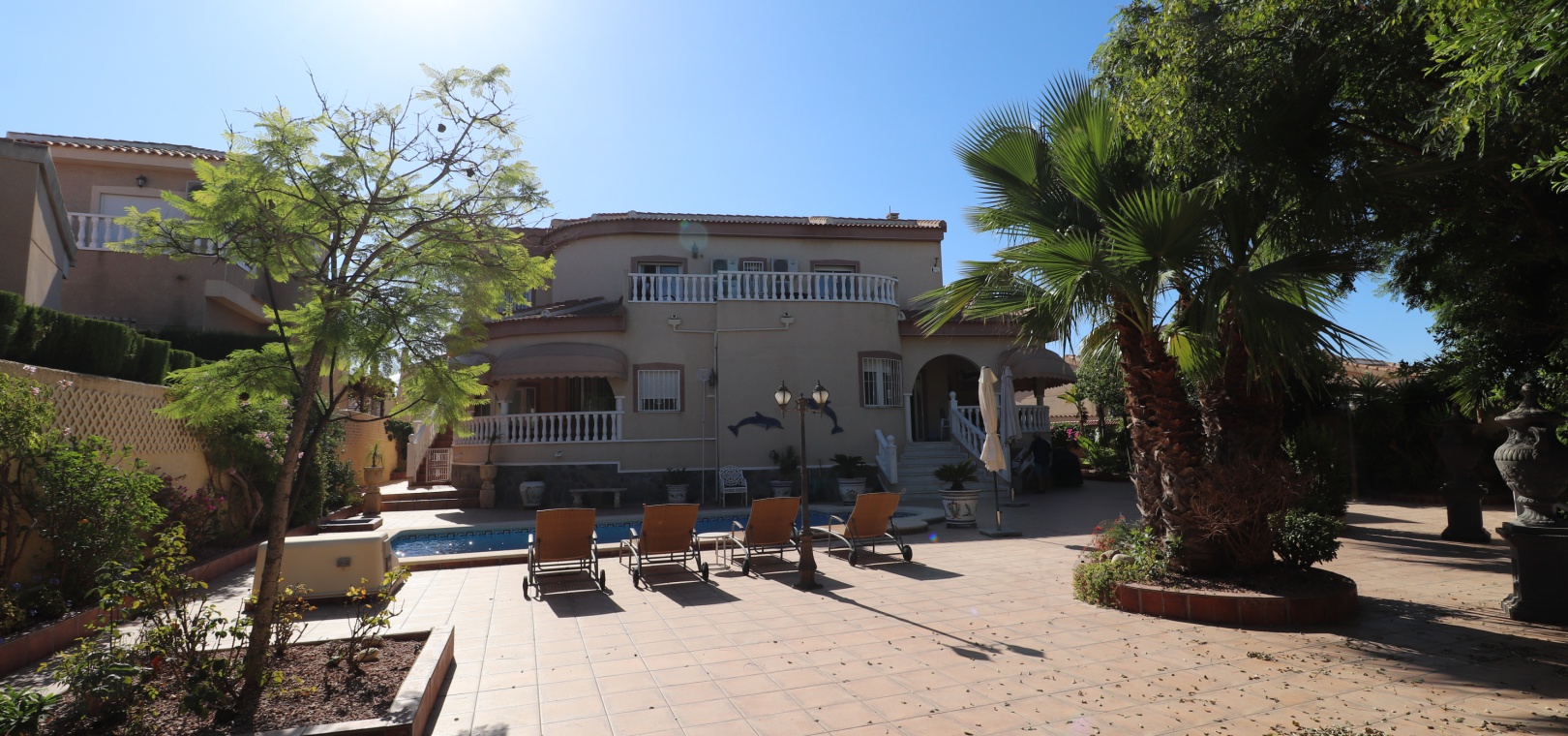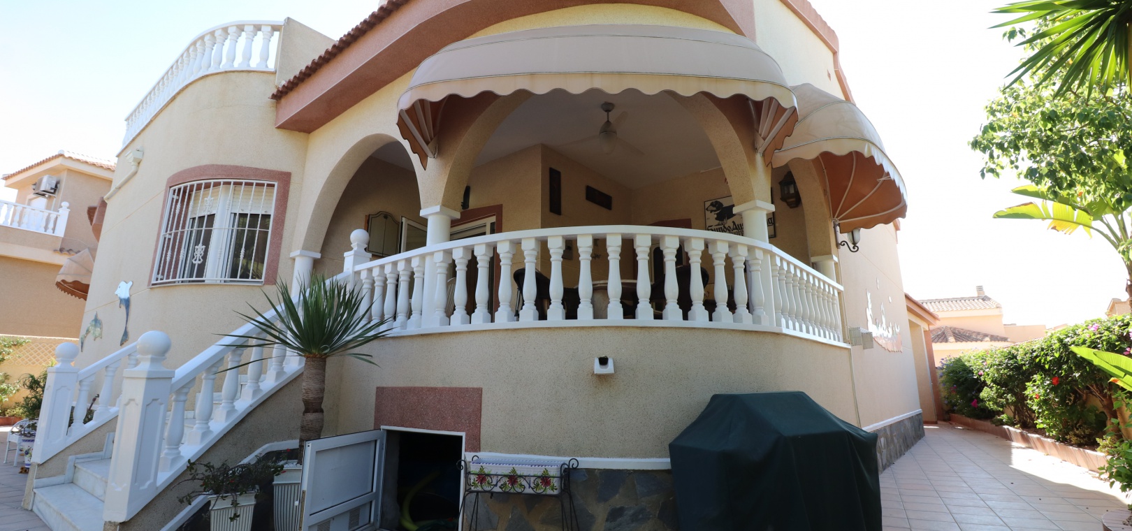This Beautiful & Traditional Four Bedroom Detached Villa in La Marquesa is located in a prominent position on a desirable golf course, between Rojales and Ciudad Quesada. Within a few minutes drive of the nearest amenities on the course itself, bars, restaurants, shops, supermarkets and more... Guardamar beach is also just a 10/15 minutes drive away. This extremely spacious property of some 234m2 comprises on the ground floor of a lovely entrance via the first covered terrace, great for eating al fresco; main family lounge/dining room; second living space, currently used as a TV room with access out to the second covered terrace, overlooking the private pool; a separate fully fitted kitchen with breakfast bar and direct access out to the terrace; one double master bedroom with en suite corner bath and shower room; and a cloakroom. External stairs from the terrace leads to the first floor, which has two independent rooms, both with access to a Jack & Jill shower room; and an office... Outside set across this fantastic 800m2 plot is a beautifully landscaped garden, mainly tiled with a good variety of plants and trees throughout, ample off road parking, to include a permanent car port, plenty of outdoor dining room, sunbathing space, 10 x 4 swimming pool and an outside toilet, a true garden to enjoy the Spanish lifestyle! Extras included are fitted wardrobes, air conditioning throughout, grills, ceiling fans, separate utility room, central heating, electric gates and storage room... Great property for a great price!
