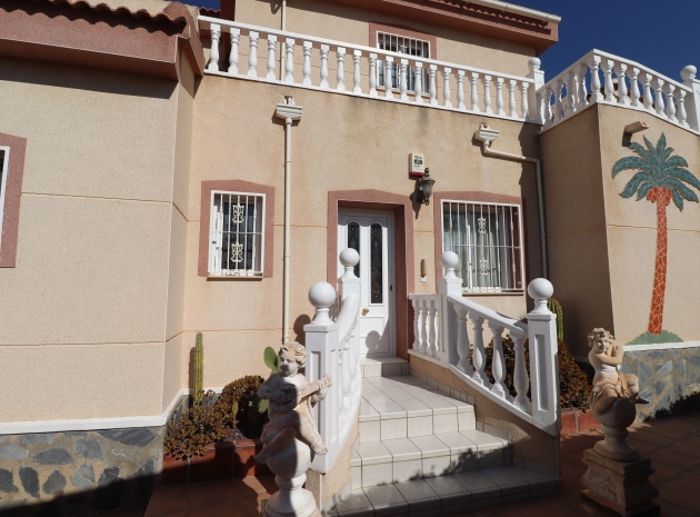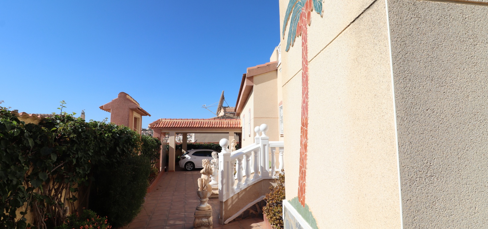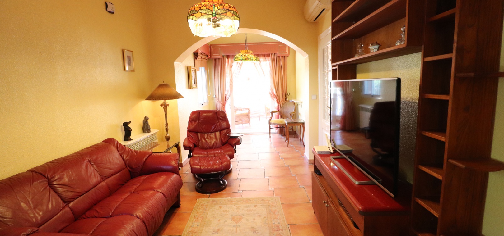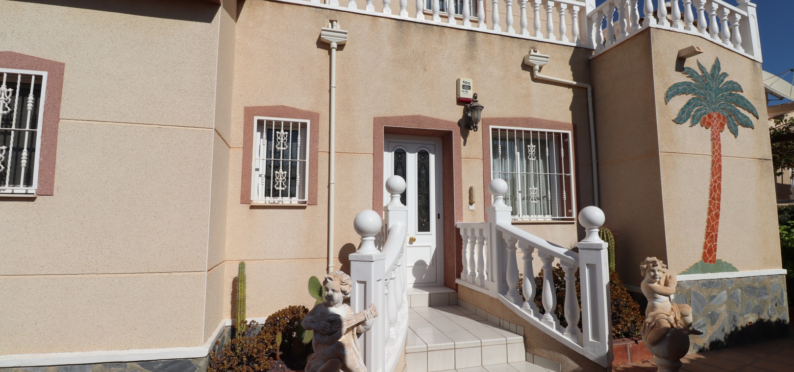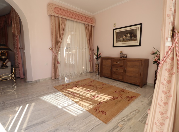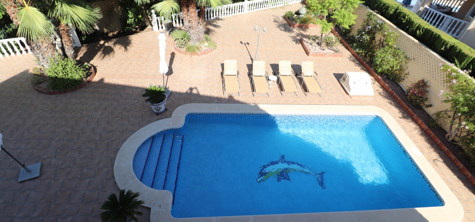 This Beautiful & Traditional Four Bedroom Detached Villa in La Marquesa is located in a prominent position on a desirable golf course, between Rojales and Ciudad Quesada. Within a few minutes drive of the nearest amenities on the course itself, bars, restaurants, shops, supermarkets and more... Guardamar beach is also just a 10/15 minutes drive away. This extremely spacious property of some 234m2 comprises on the ground floor of a lovely entrance via the first covered terrace, great for eating al fresco; main family lounge/dining room; second living space, currently used as a TV room with access out to the second covered terrace, overlooking the private pool; a separate fully fitted kitchen with breakfast bar and direct access out to the terrace; one double master bedroom with en suite corner bath and shower room; and a cloakroom. External stairs from the terrace leads to the first floor, which has two independent rooms, both with access to a Jack & Jill shower room; and an office... Outside set across this fantastic 800m2 plot is a beautifully landscaped garden, mainly tiled with a good variety of plants and trees throughout, ample off road parking, to include a permanent car port, plenty of outdoor dining room, sunbathing space, 10 x 4 swimming pool and an outside toilet, a true garden to enjoy the Spanish lifestyle! Extras included are fitted wardrobes, air conditioning throughout, grills, ceiling fans, separate utility room, central heating, electric gates and storage room... Great property for a great price!