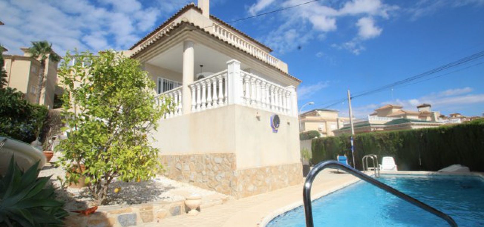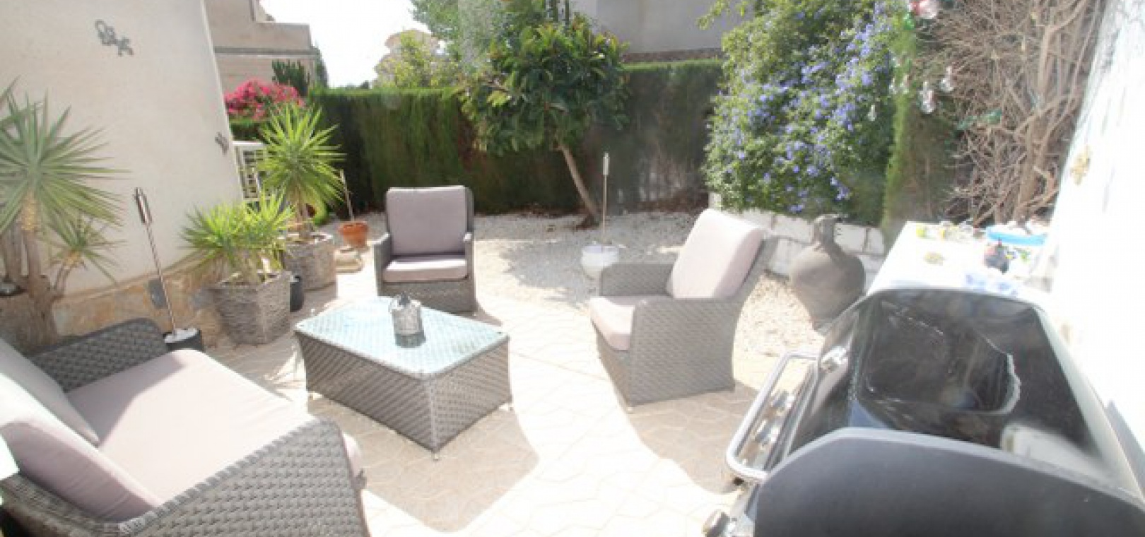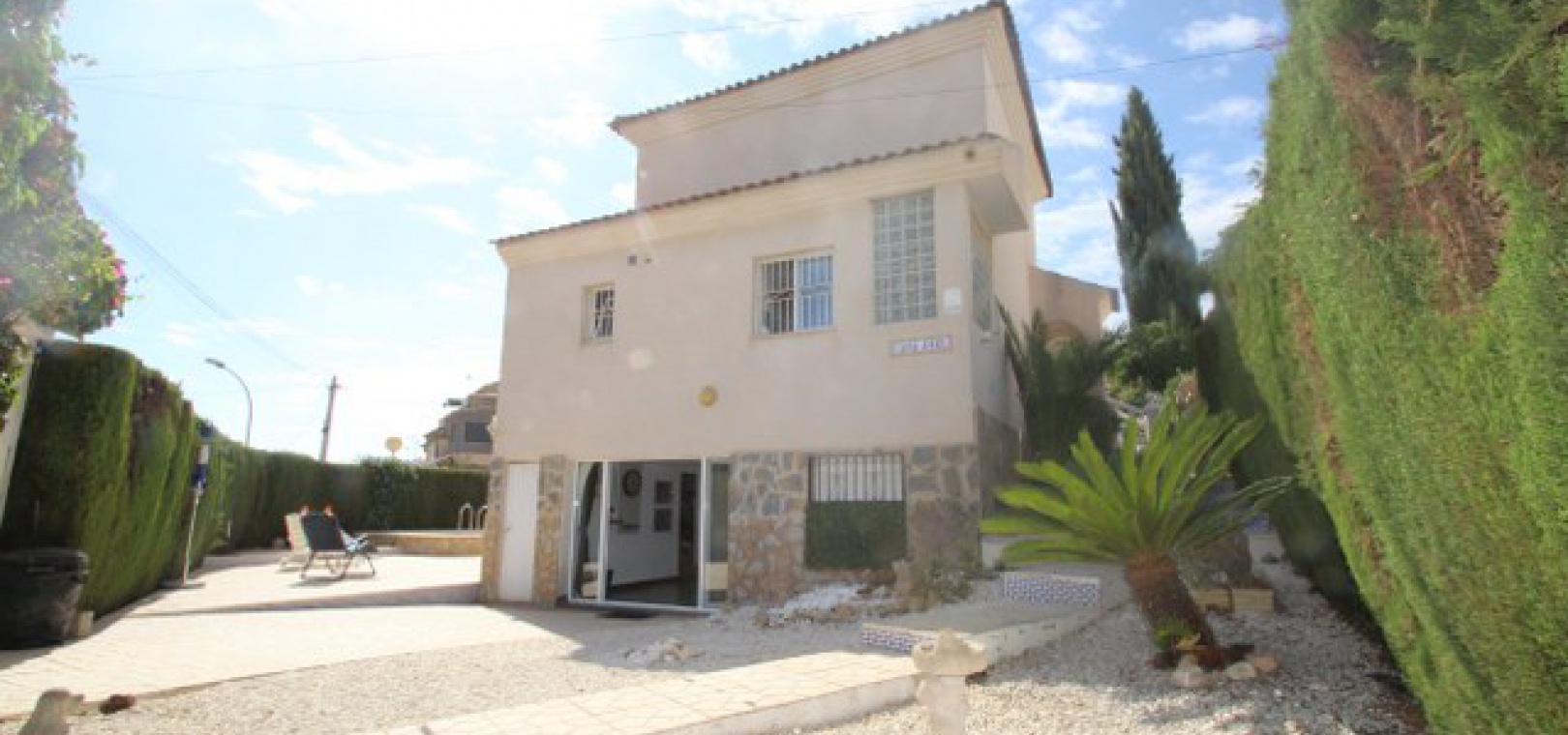 A 2/3 bed 2.5 bath detached villa with a private swimming pool on a large corner plot located in El Galan, Villamartin, Costa Blanca.