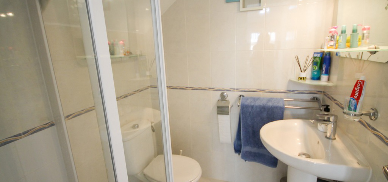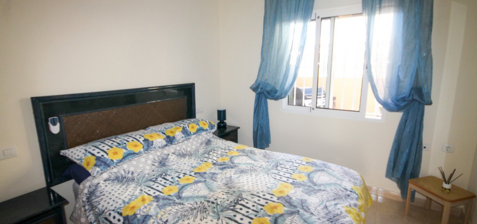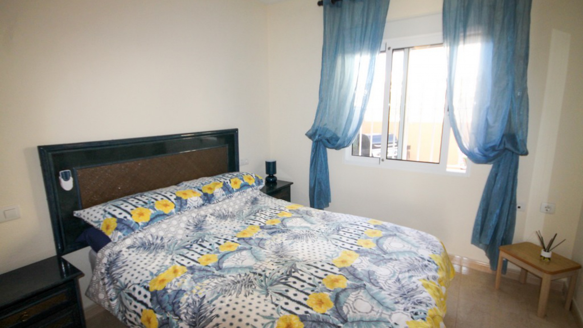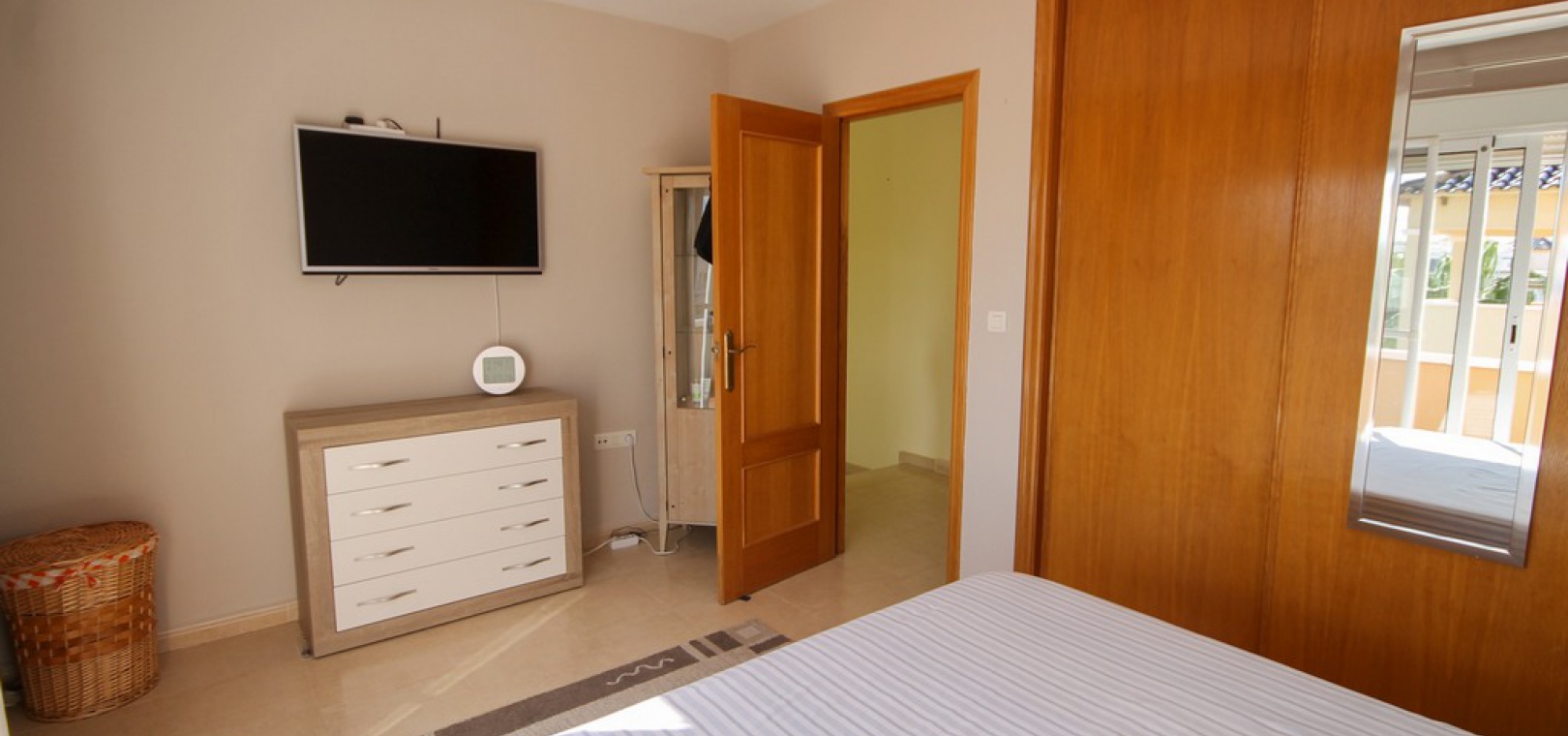On the first floor there is a modern shower room and two double bedrooms, both with fitted wardrobes. The maib bedroom is particularly spacious with patio doors onto a private terrace with some lovely distant views of the salt lake, the sea and towards La Manga.