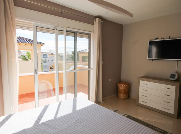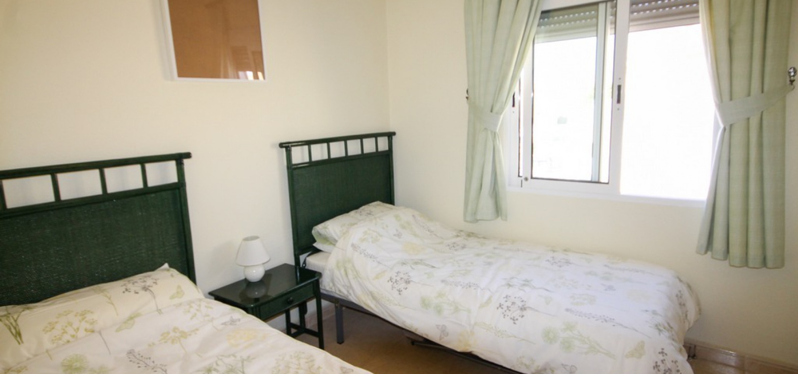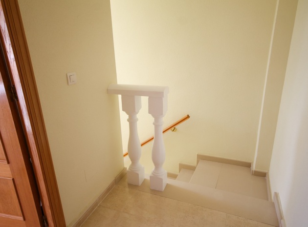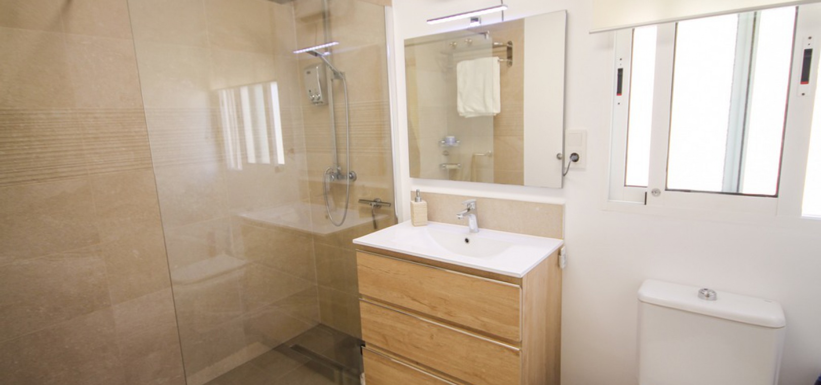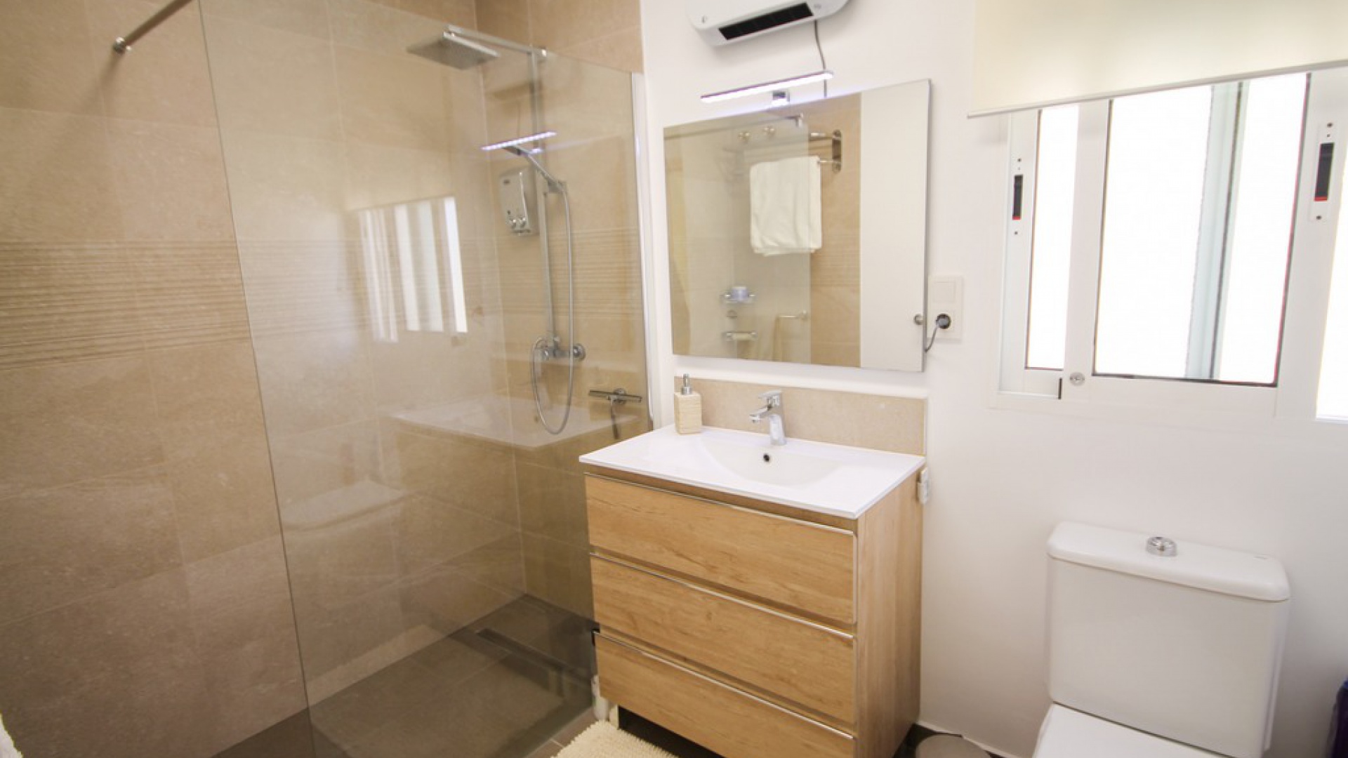 On the first floor there is a modern shower room and two double bedrooms, both with fitted wardrobes. The maib bedroom is particularly spacious with patio doors onto a private terrace with some lovely distant views of the salt lake, the sea and towards La Manga.