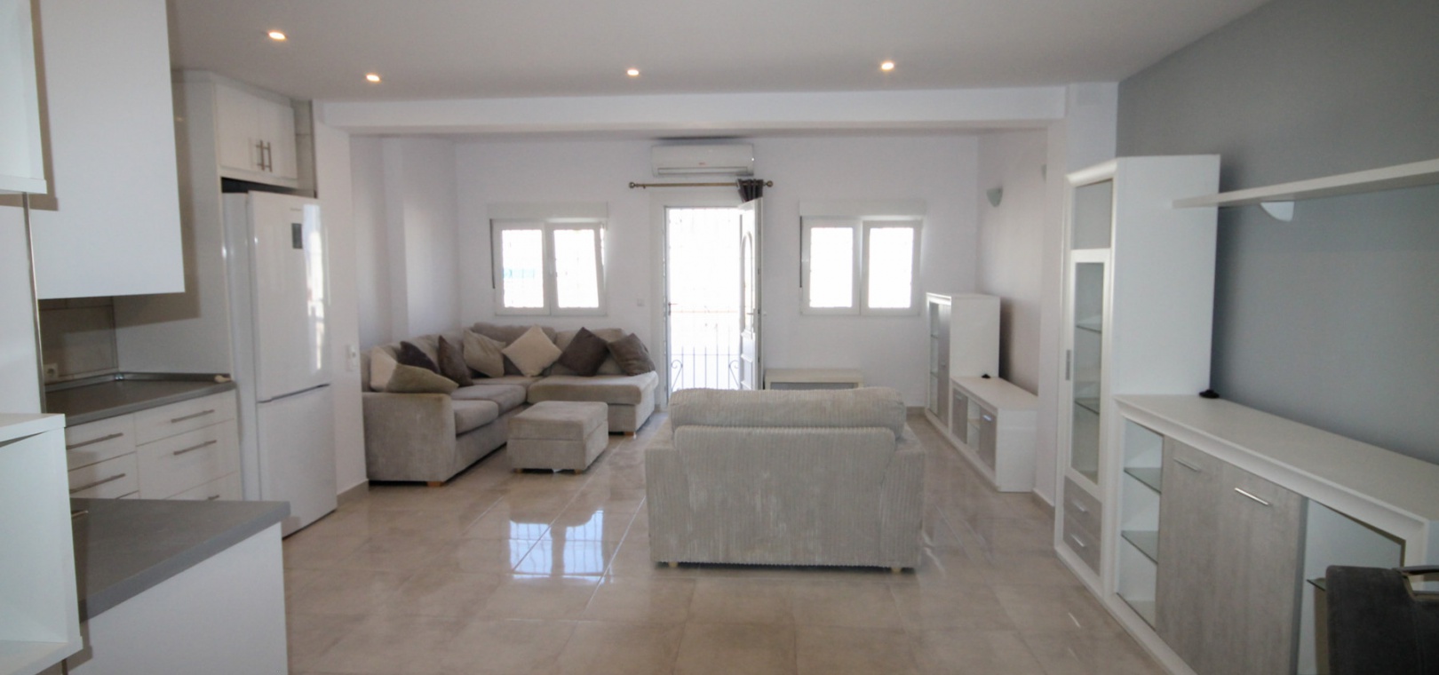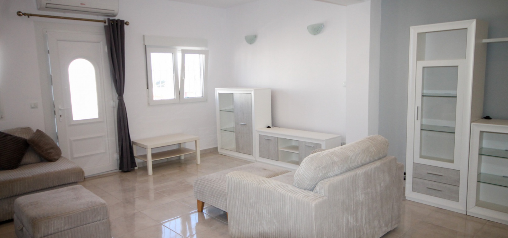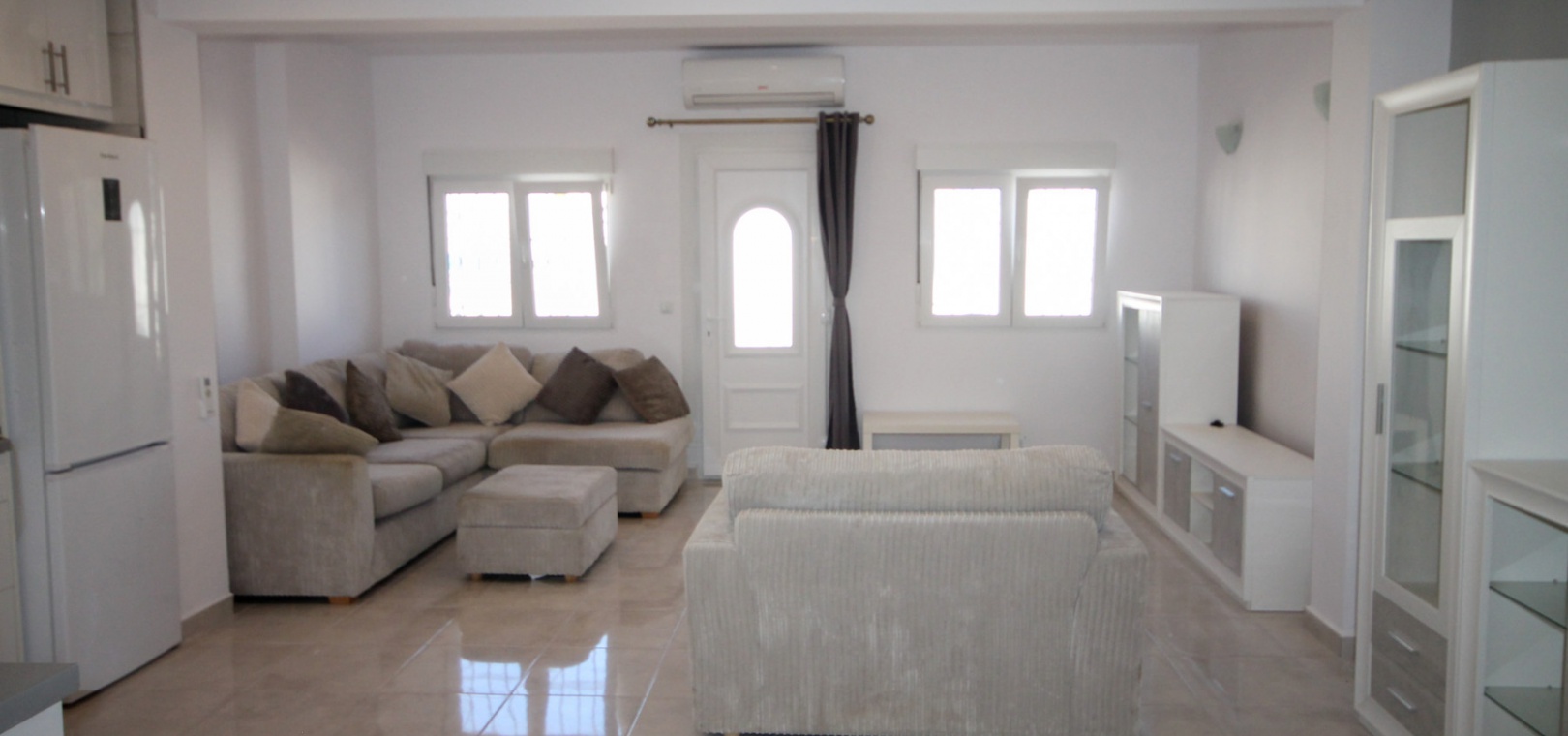 Lounge/diner with & hot and cold A/C, open plan newly fitted kitchen, 1 x main bedroom with new fitted wardrobes,a newly fitted en suite shower room and a door accessing the rear patio with access up to the large pribate rooftop solarium & 1 x single bedroom with access to a private rear patio area.On the solarium there is a sun awning, barbeque and storage and enjoys lovely views across woodland in one direction, and distant views towards the salt lake and sea in the other.Some added extras are new floor tiles, upgraded electrics, new kitchen, new shower room, new internal doors, false ceiling with spotlights, smooth walls, upvc double glazed windows and doors, fly screens, air conditioning and a new drainage system.