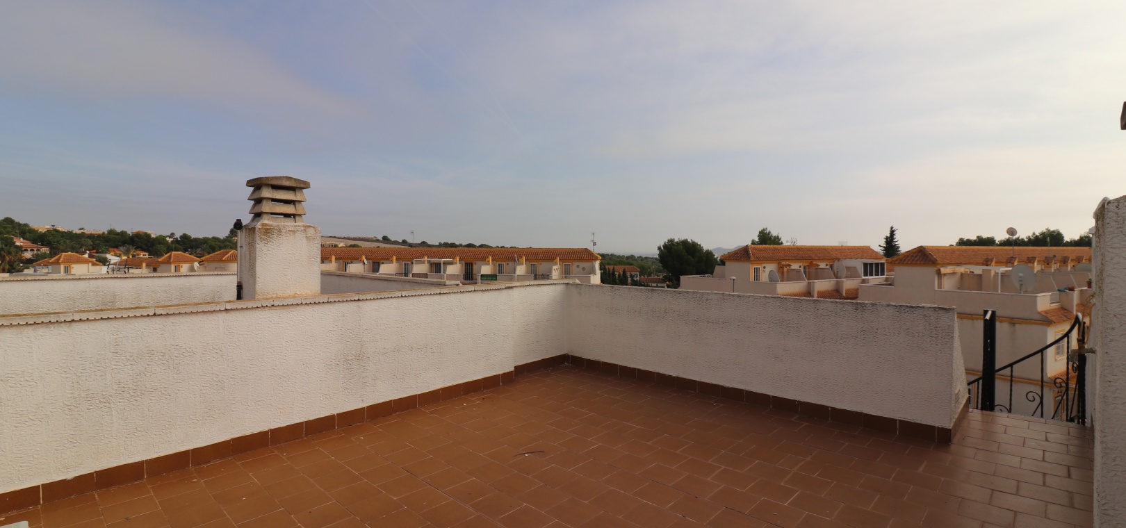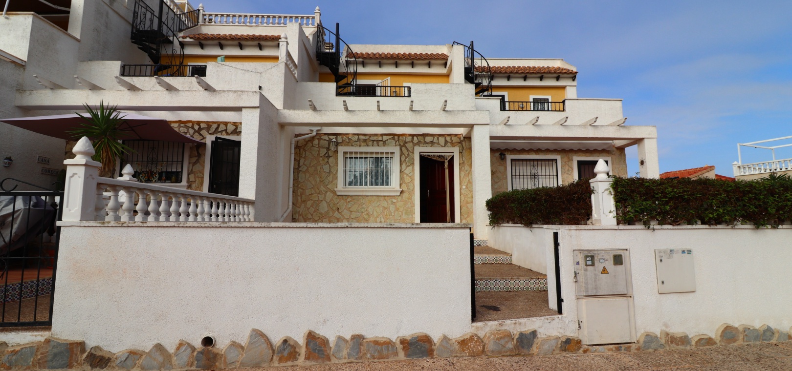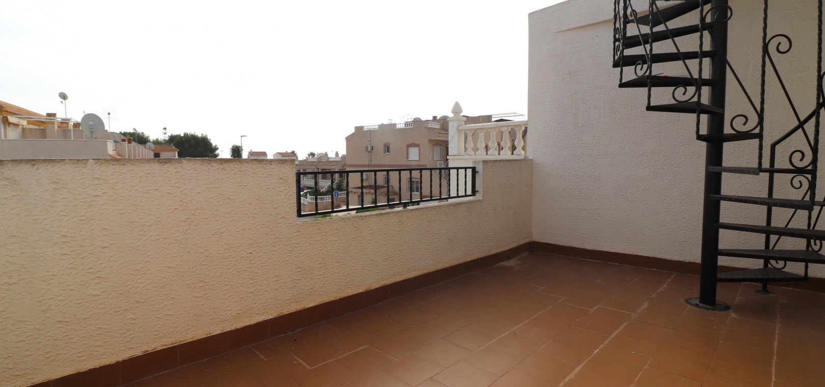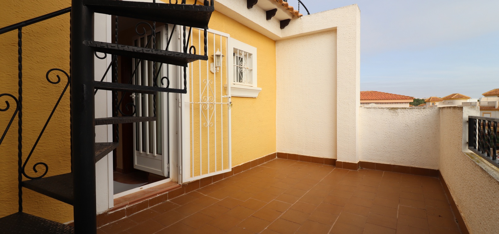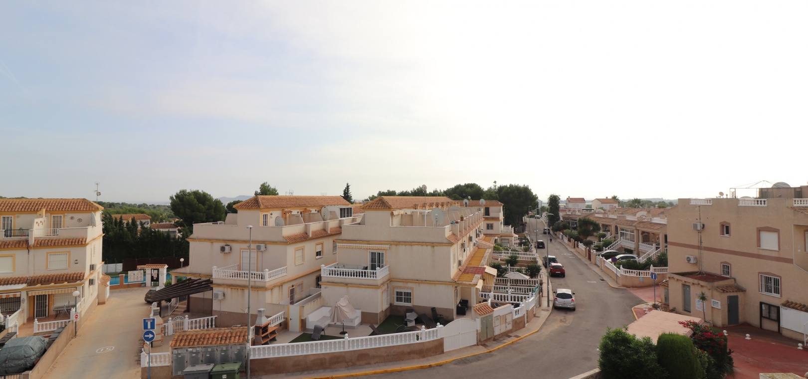 This East Facing, Three Bedroom, Townhouse in Montemar, a popular residential area of Algorfa, which is a couple of minutes drive along with the 5* La Finca Golf, Hotel & Spa Resort that can be accessed 5-10 minutes on foot. The major towns of Almoradi, Quesada and Benijofar are just 5 minutes by car and the nearest beach at Guardamar approx 15 minutes. The property comprises: lounge/dining room with feature beamed ceiling and stairs leading to the first floor; separate fitted kitchen with door leading out to a rear patio; double bedroom; shower room. The first floor comprises of two further double bedrooms, master with built-in wardrobes and air con unit, plus there is a family bathroom. External stairs lead up to the private solarium where you can enjoy a view to the mountain. The front garden is gravelled and tiled and the property benefits from the use of a communal pool. An ideal holiday home.