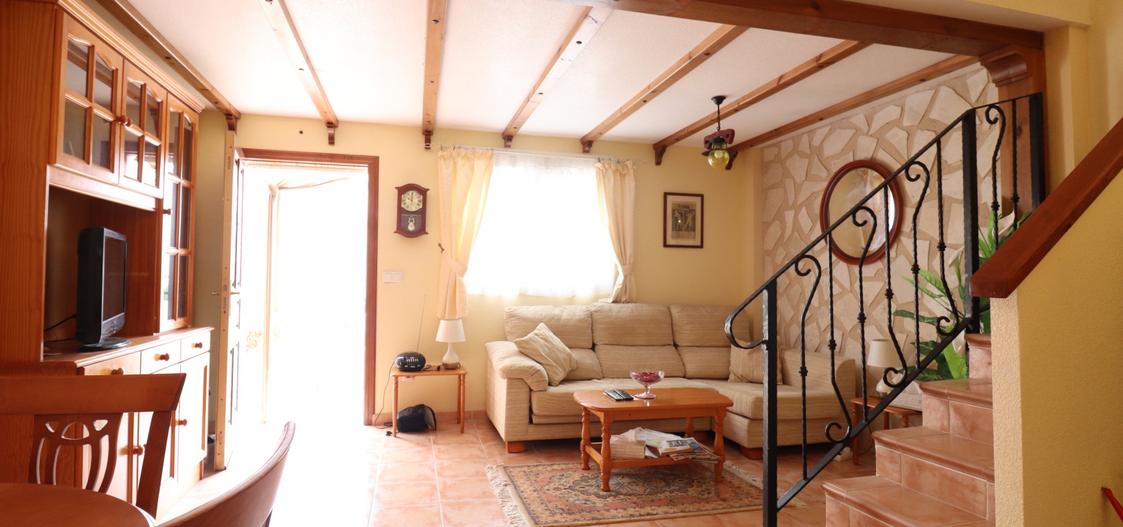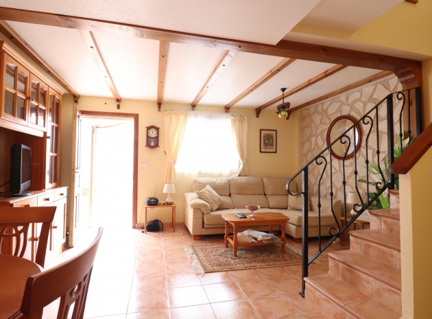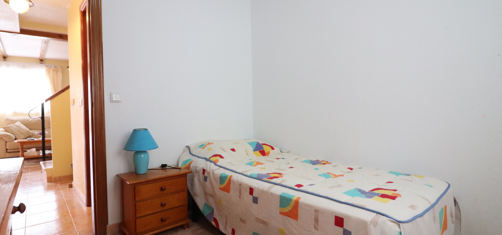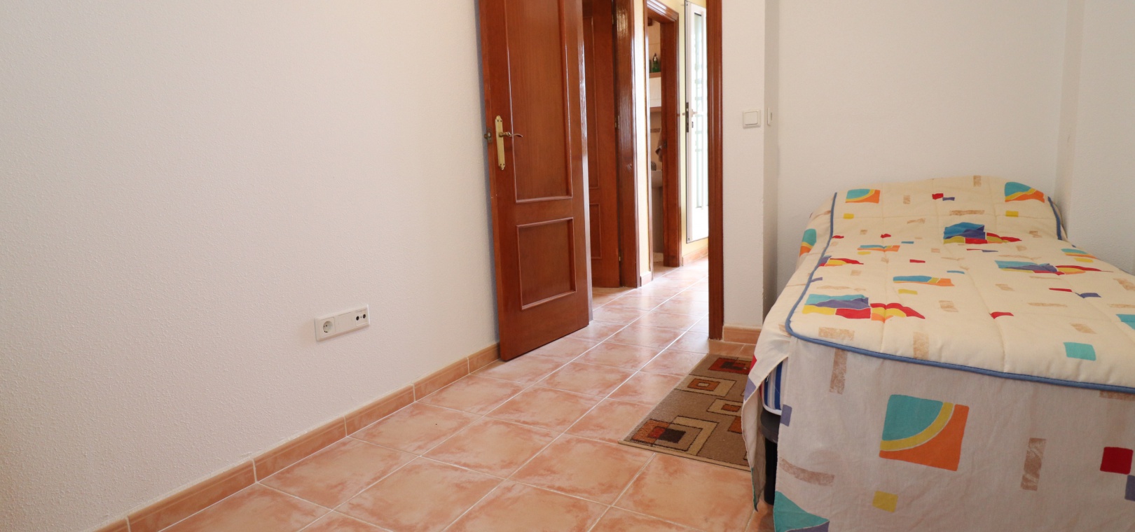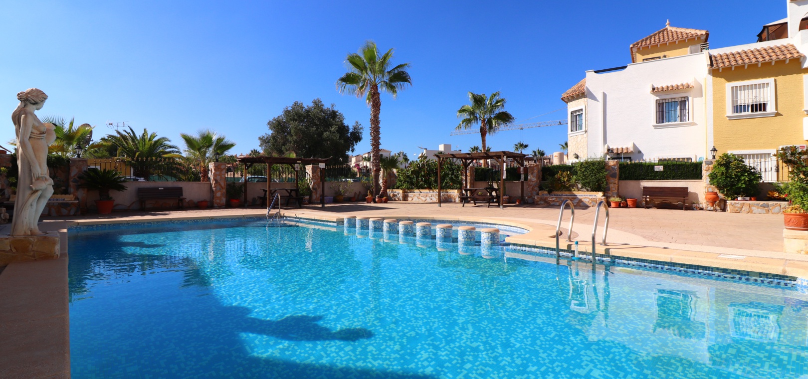 This East Facing, Three Bedroom, Townhouse in Montemar, a popular residential area of Algorfa, which is a couple of minutes drive along with the 5* La Finca Golf, Hotel & Spa Resort that can be accessed 5-10 minutes on foot. The major towns of Almoradi, Quesada and Benijofar are just 5 minutes by car and the nearest beach at Guardamar approx 15 minutes. The property comprises: lounge/dining room with feature beamed ceiling and stairs leading to the first floor; separate fitted kitchen with door leading out to a rear patio; double bedroom; shower room. The first floor comprises of two further double bedrooms, master with built-in wardrobes and air con unit, plus there is a family bathroom. External stairs lead up to the private solarium where you can enjoy a view to the mountain. The front garden is gravelled and tiled and the property benefits from the use of a communal pool. An ideal holiday home.