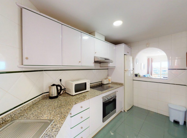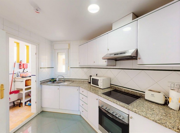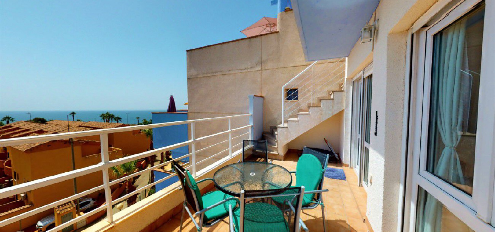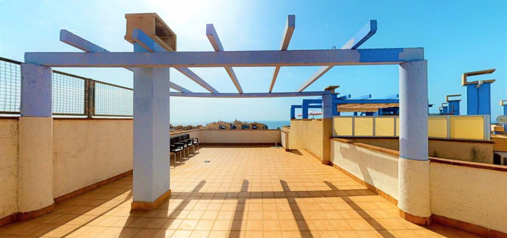 Lounge/diner with doors to the balcony, open plan fully fitted kitchen, separate utility area, 2 x double bedrooms both with fitted wardrobes, 1 x newly fitted shower room, large private rooftop solarium, communal swimming pool, underground parking space & store room, bar, jacuzzi, tennis courts, outdoor gym, children's playground, as well as well-kept green areas & fabulous views of the sea & much more.