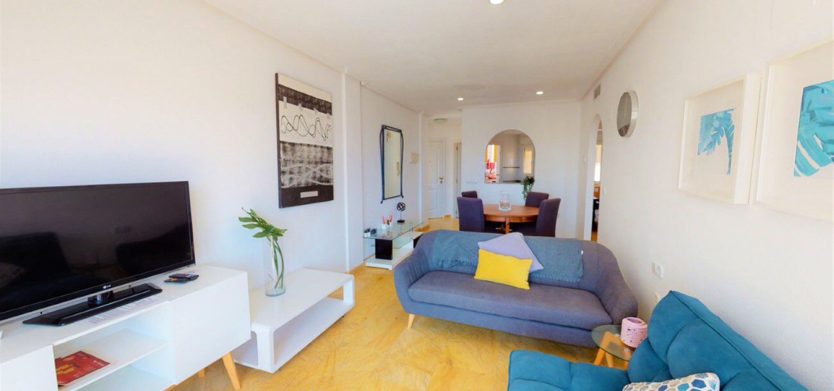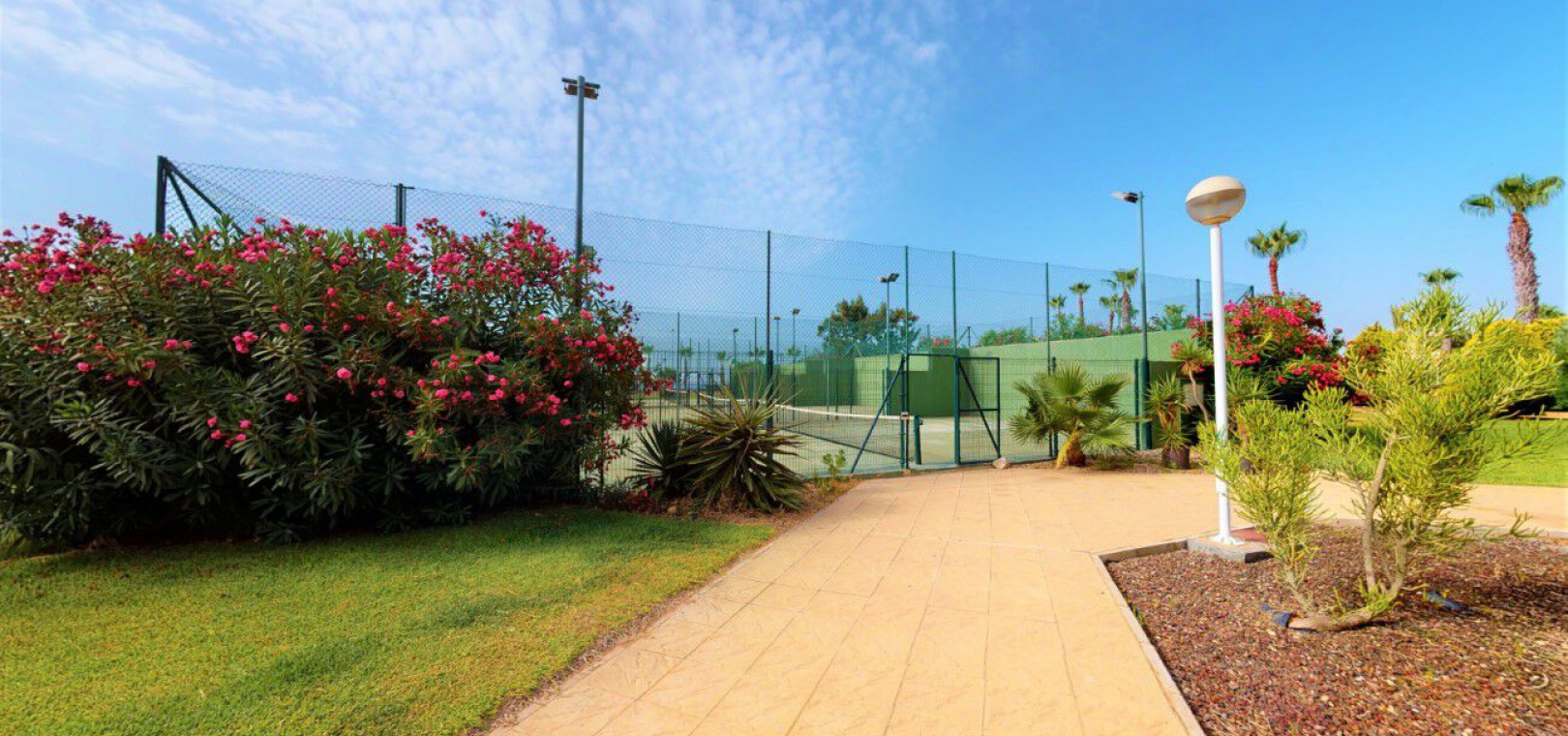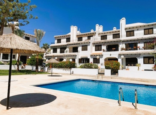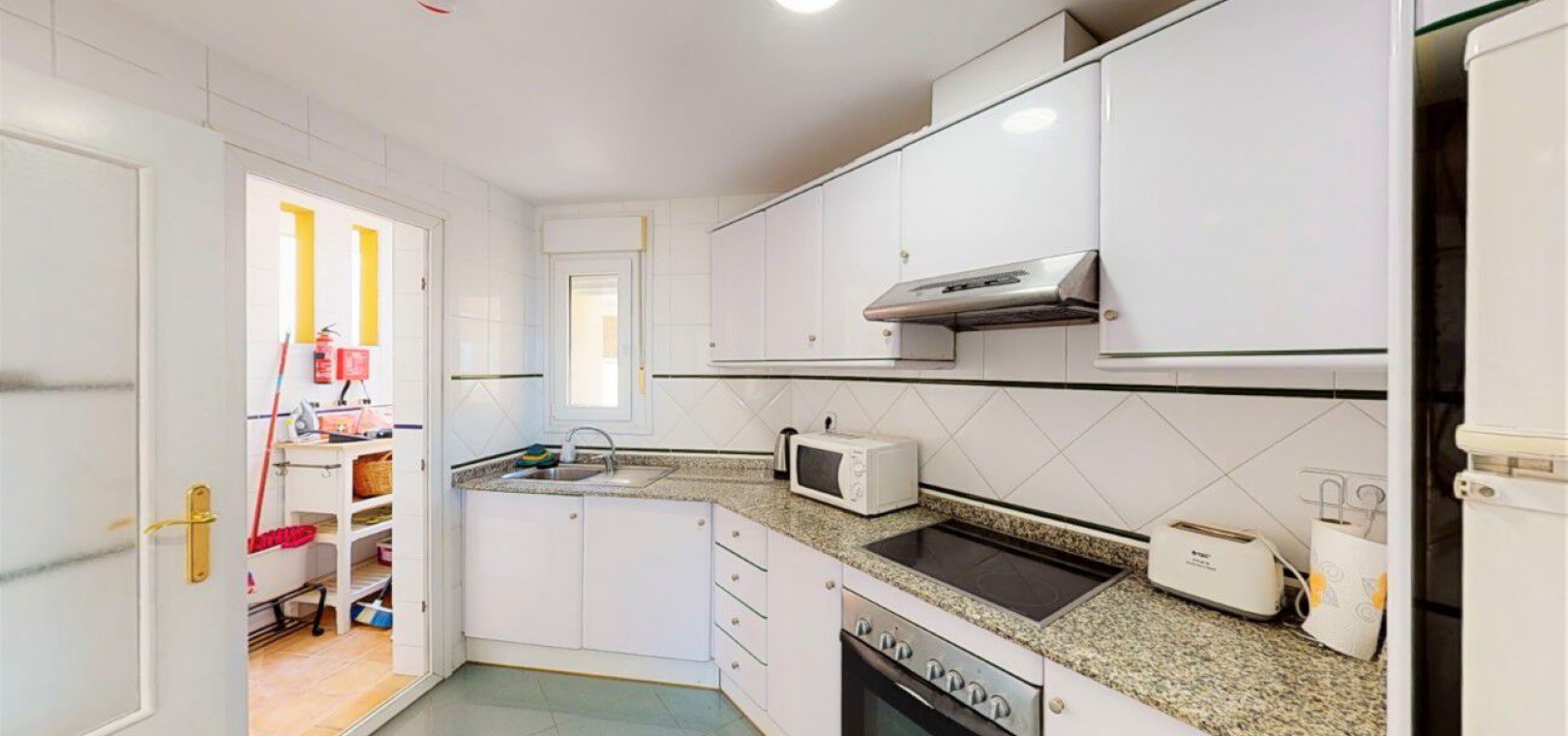 Lounge/diner with doors to the balcony, open plan fully fitted kitchen, separate utility area, 2 x double bedrooms both with fitted wardrobes, 1 x newly fitted shower room, large private rooftop solarium, communal swimming pool, underground parking space & store room, bar, jacuzzi, tennis courts, outdoor gym, children's playground, as well as well-kept green areas & fabulous views of the sea & much more.