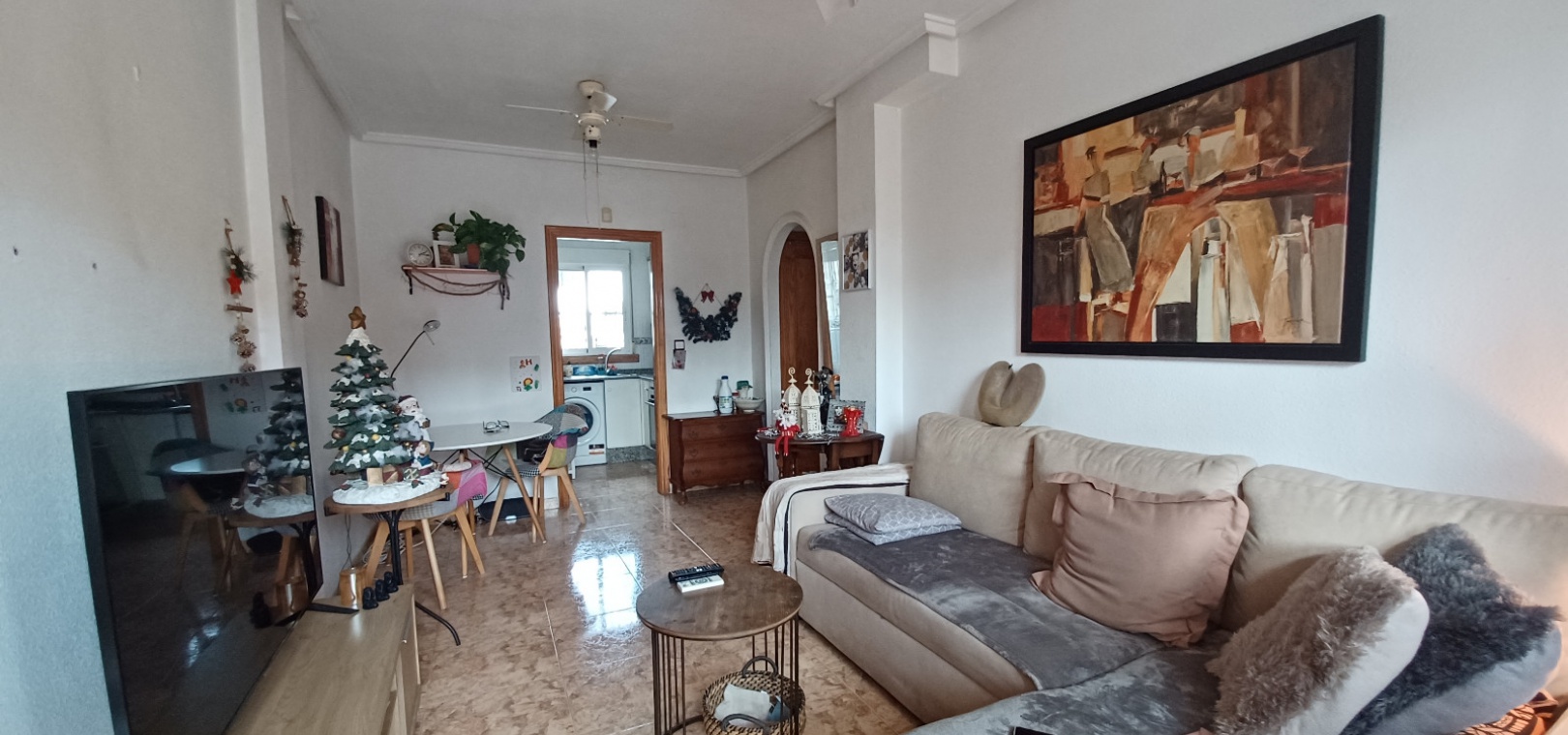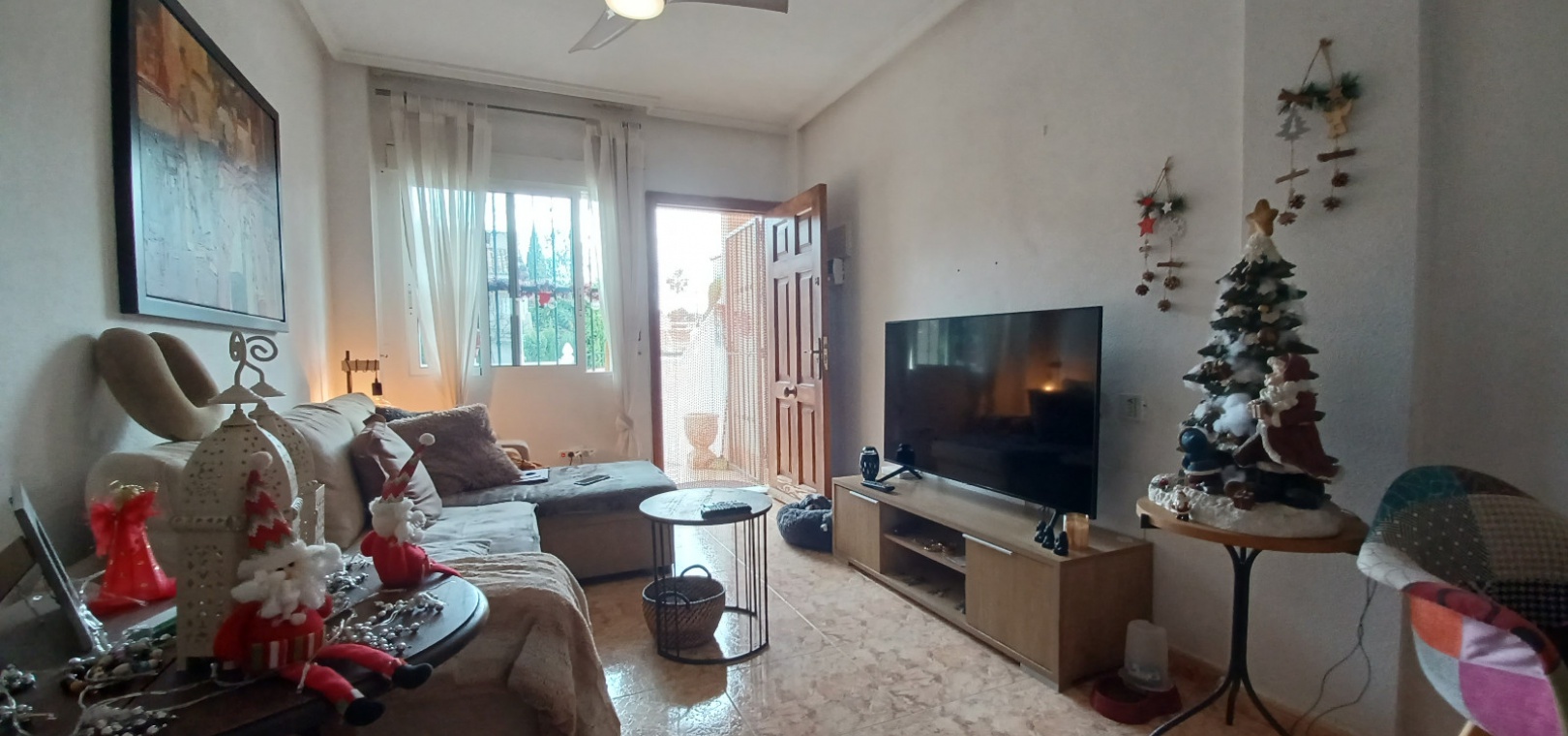Lounge/diner with ceiling fans, separate fully fitted kitchen, 1 x double bedroom with fitted wardrobes & ceiling fan, 1 x twin bedroom with a ceiling fan, 1 x family shower room, front terrace, front garden, communal swimming pool & much more.