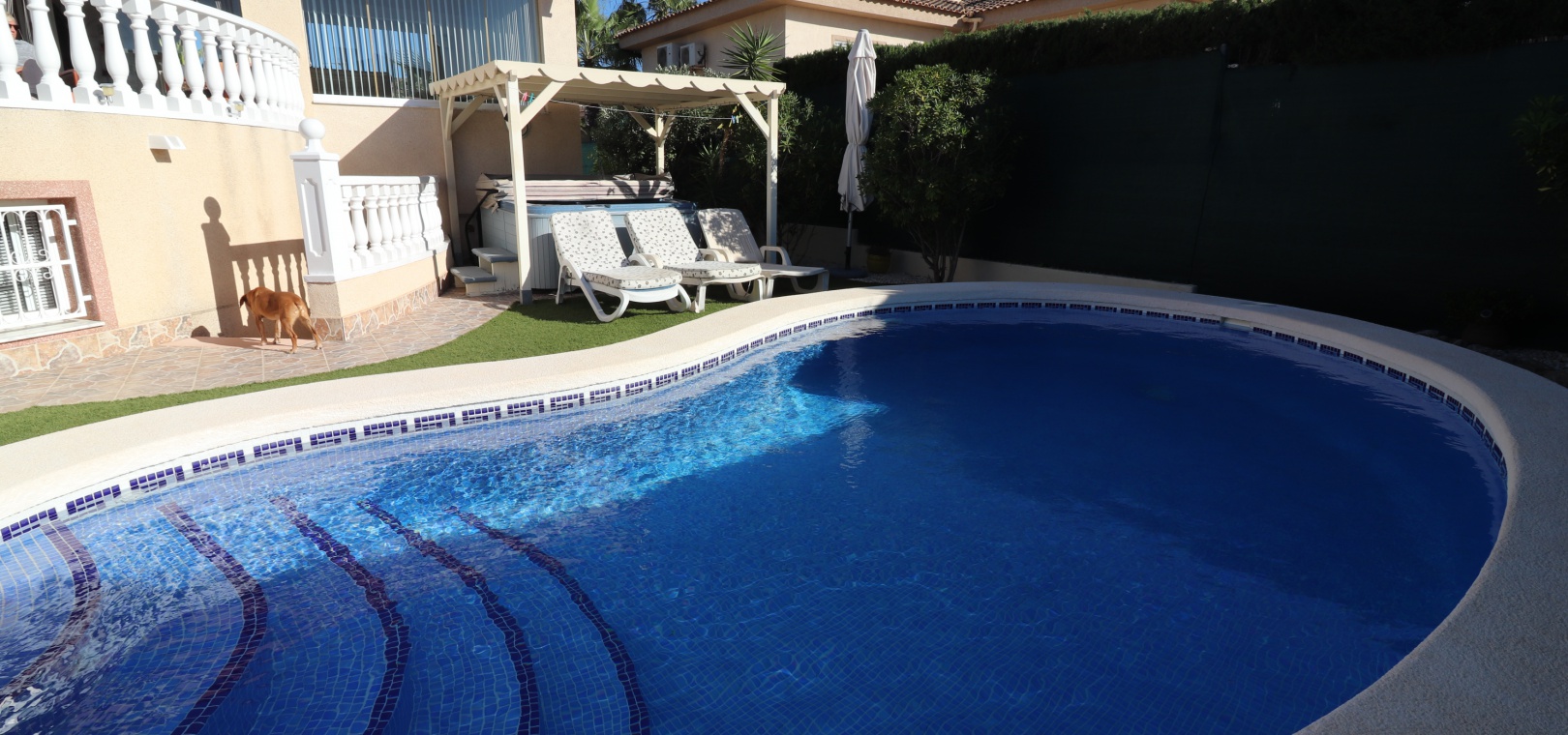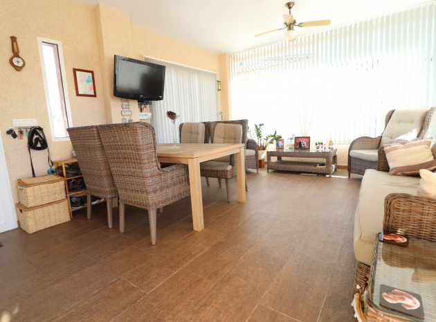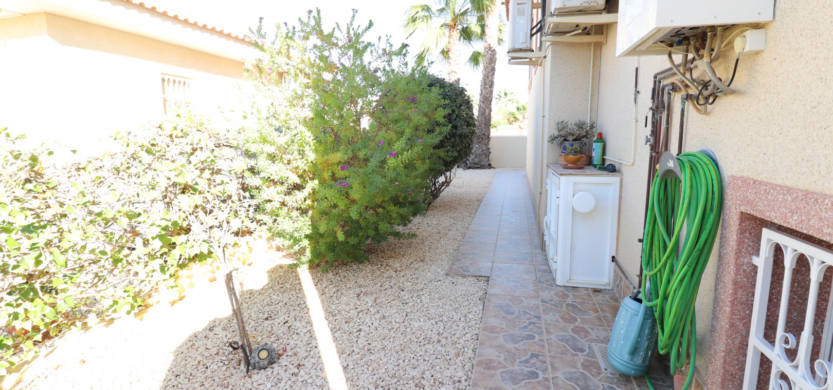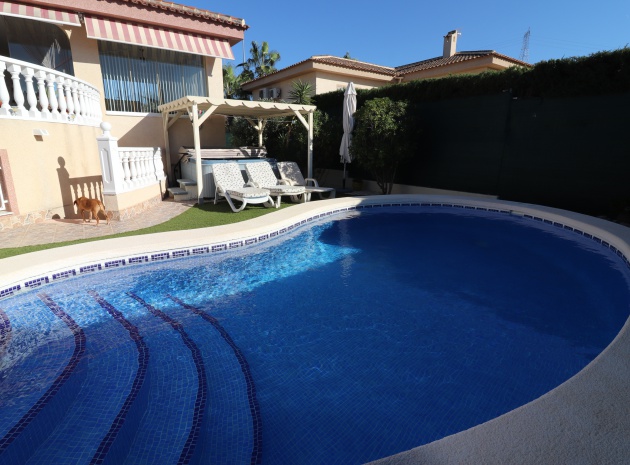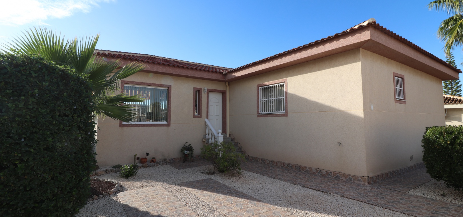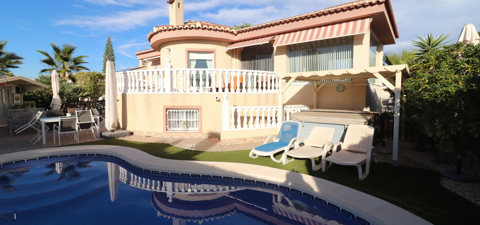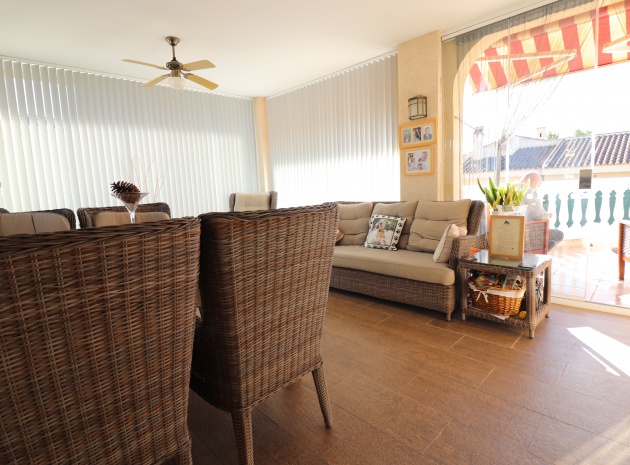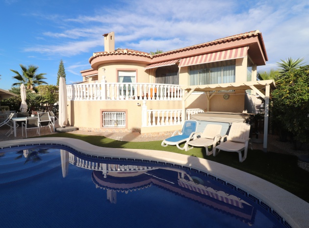 This Five Bedroom Detached Villa in Benimar II is located within the centre of this pretty and popular urbanization, between Benijofar and Rojales. Siuated within 5 minutes of local amenities and facilities, which are at an abundance in this area. Whilst the nearest beaches are at Guardamar del Segura in approx a 10 minute drive! This superb property of some 170m2, comprises on the main floor of an open plan fully fitted kitchen; spacious lounge/dining room with access out to either the glazed and covered terrace, an ideal winter room or the open surrounding terrace, overlooking the private swimming pool, gardens and beyond to the mountains; three double bedrooms, the master with en suite bathroom, and feature bathtub; and a family shower room. The separate annex in the Under Build is accessed externally, comprising of an open plan kitchenette; living/dining room; two bedrooms; and a shower room. Outside is a desirable garden, fully landscaped with tiled, graveled and artificial grassed areas, beautiful plants & trees, a private swimming pool, off road parking, outside kitchen/BBQ area and of course room to sunbathe, relax, entertain and more... Extras are to include under floor heating in the main living area + bathrooms, gas fireplace, natural gas central heating, fitted wardrobes, air conditioning, grills, etc... Great property, great price and with many many extras included, this is one seriously not to be missed!