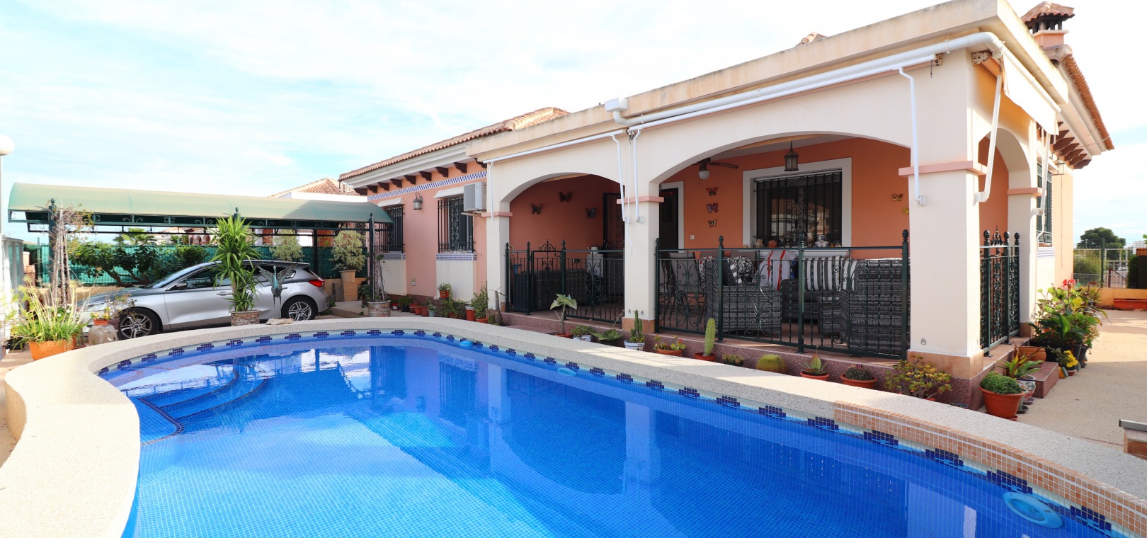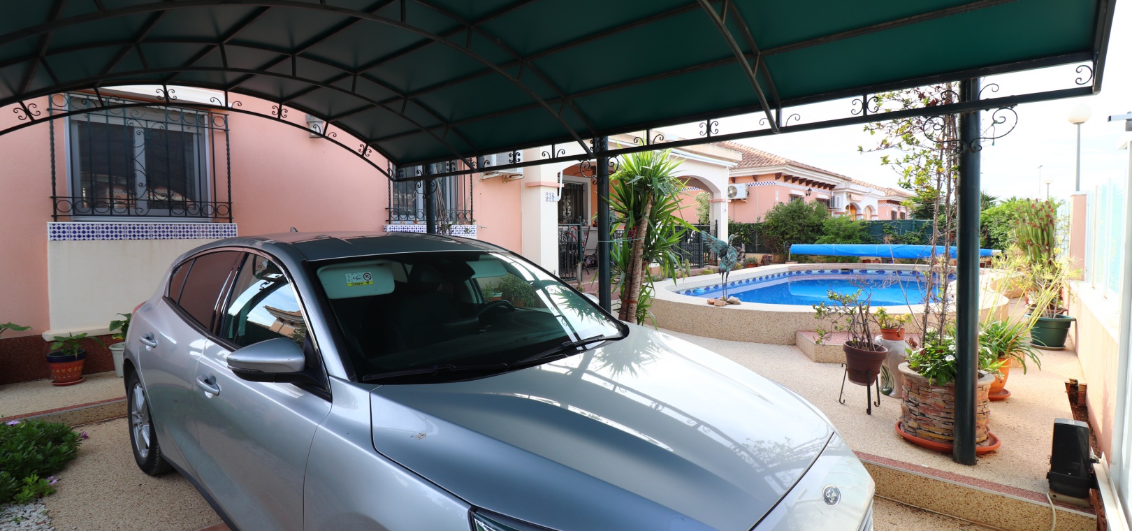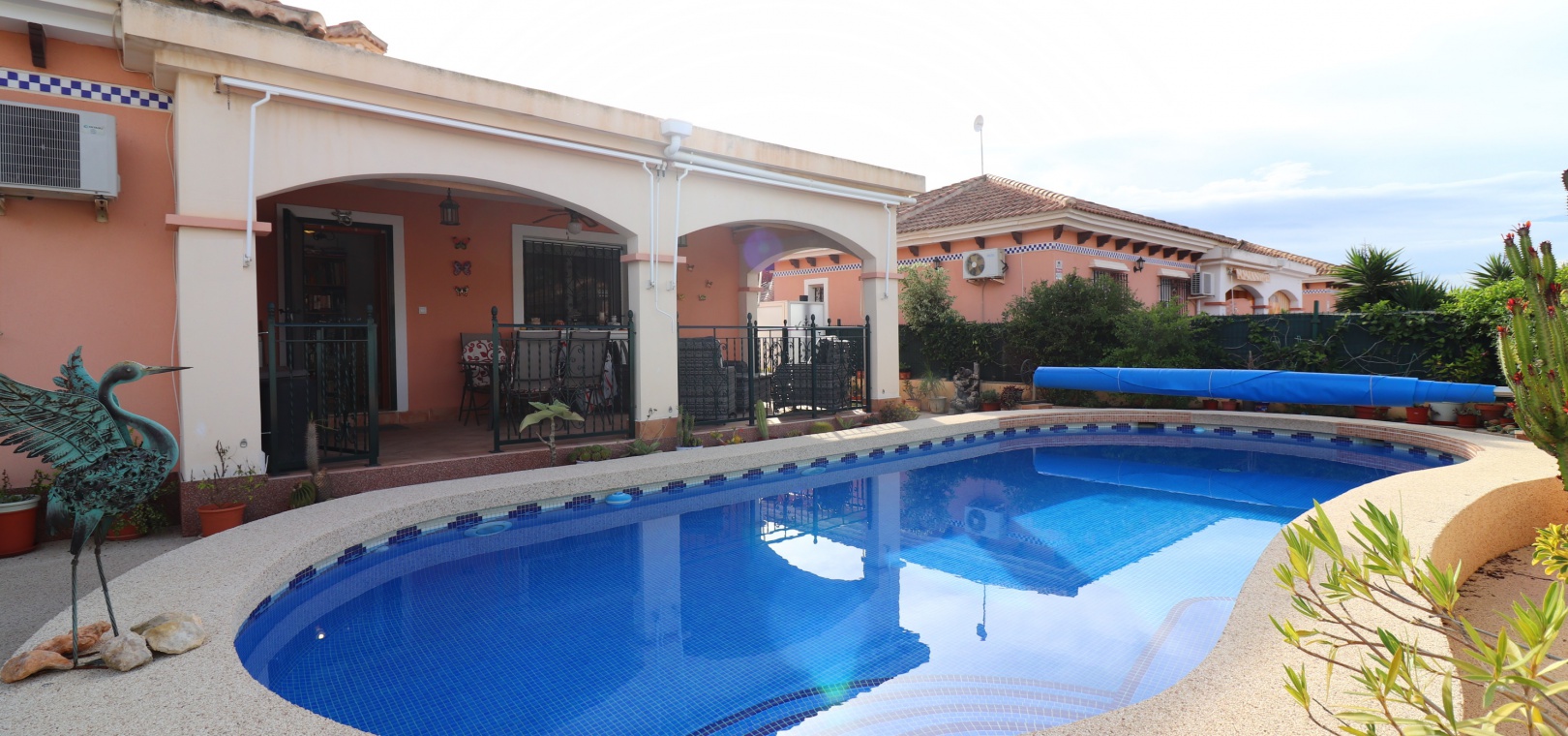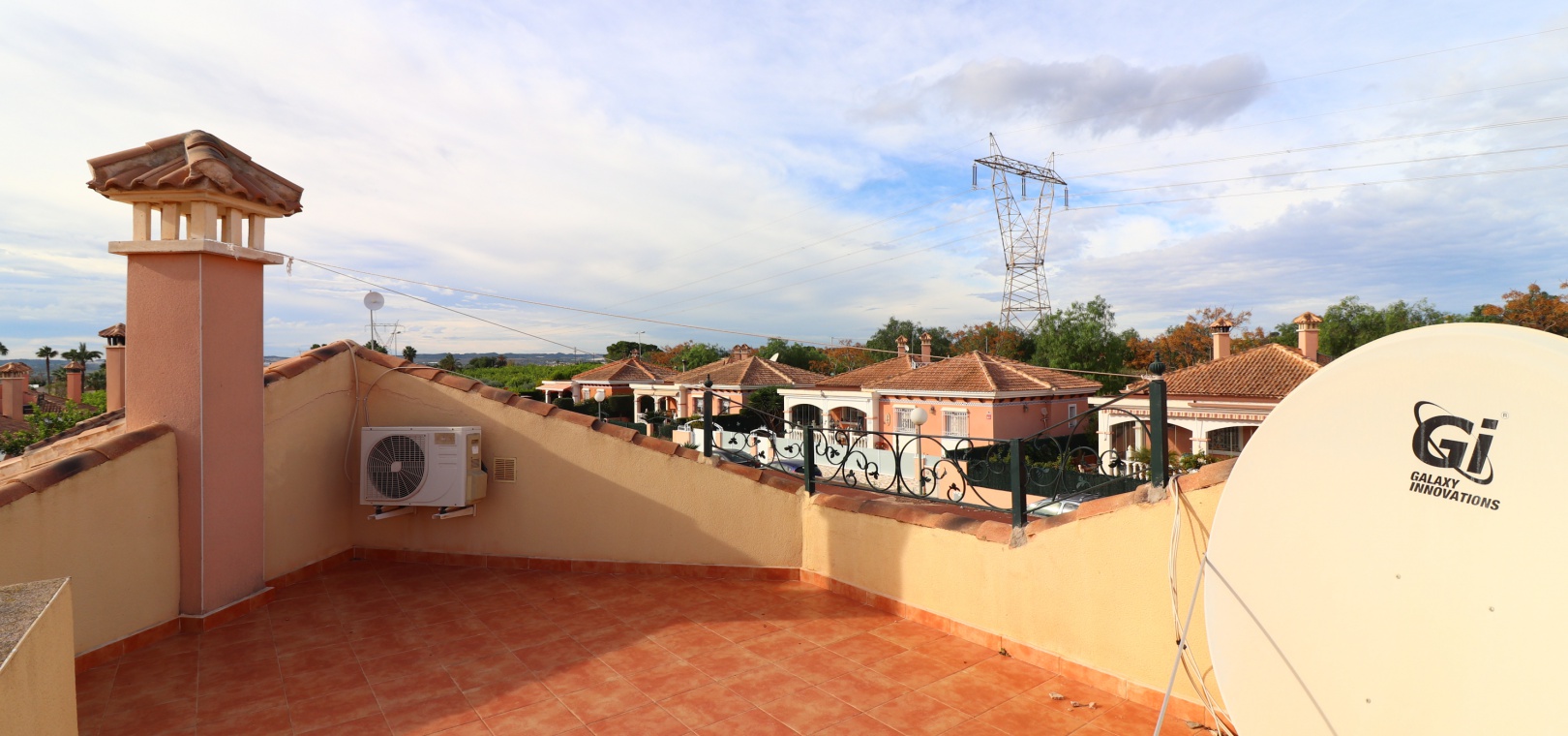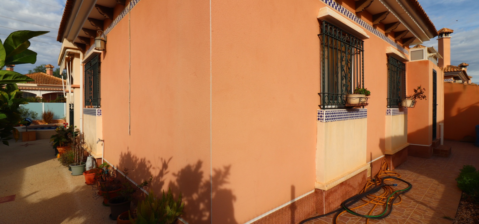 This Exclusive West Facing, Three Bedroom Detached Villa in La Herrada is located on a lovely, quiet Urbanization just outside the town centre of Los Montesinos. Situated on the urb itself is a local bar and restaurant, and main brand supermarket, within many more amenities and facilities in the town centre. This fabulous property has been updated in areas comprising of a large separate fully fitted kitchen, with has been modernized + a breakfast hatch + access to the internal courtyard & utility area; family sized lounge/dining room; three double bedrooms, the master with en suite shower room; and a family bathroom. Outside is fully landscaped with stone carpet, graveled and tiled areas, a swimming pool, off road parking under the car port and of course ample room to dine and entertain al fresco. There is a desirable covered terrace of a superb size, which benefits from overlooking the private pool and gardens, a perfect extended living space! From the rear separate utility, are external stairs to the private roof top solarium, with countryside & distant salt lake views. Many extras are included with this wonderful opportunity, such as fitted wardrobes, air conditioning in some rooms, grills, log burner, fly nets and more... Simply wow!