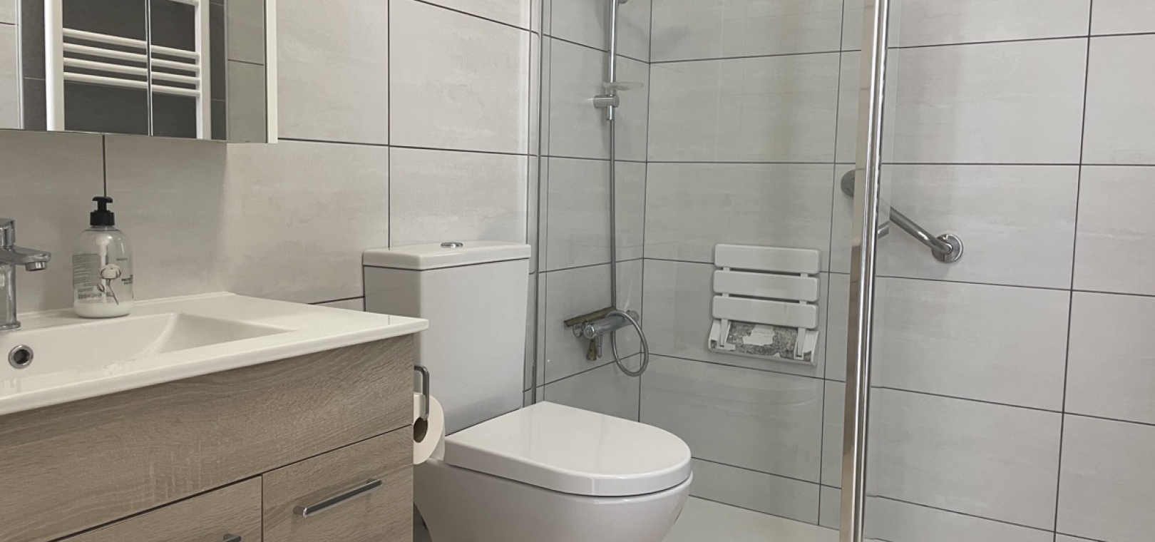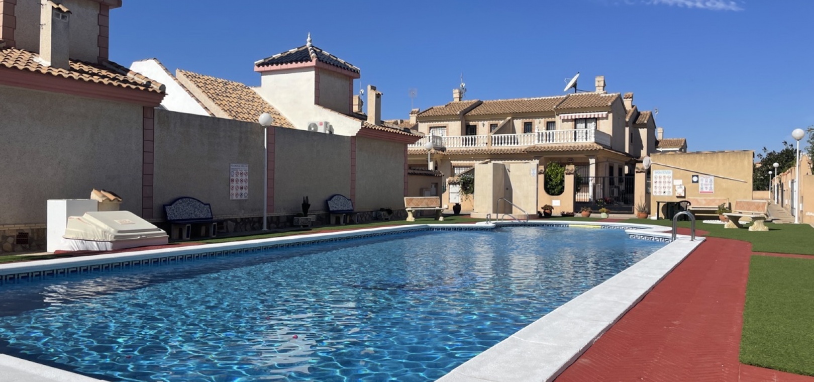 The communal pool with seating area is located behind the property in the centre of this small complex.