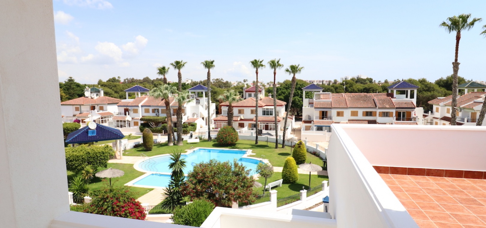 A South facing 2 bed 1 bath top floor apartment with views to the communal swimming pool located in Res. Riomar, Mil Palmeras, Costa Blanca.