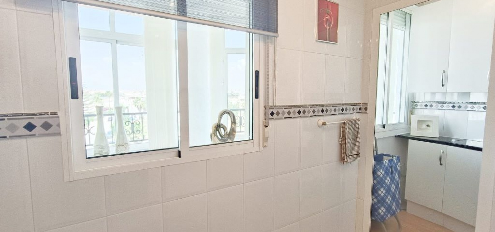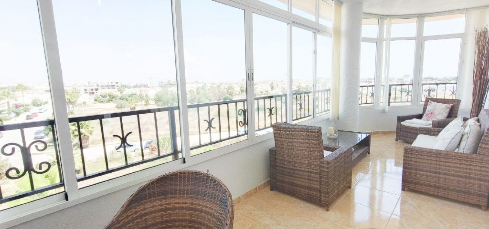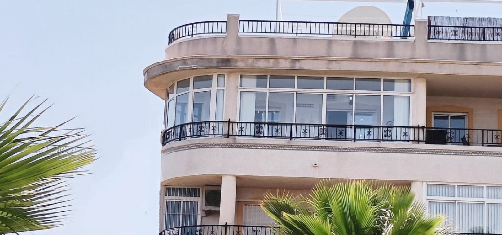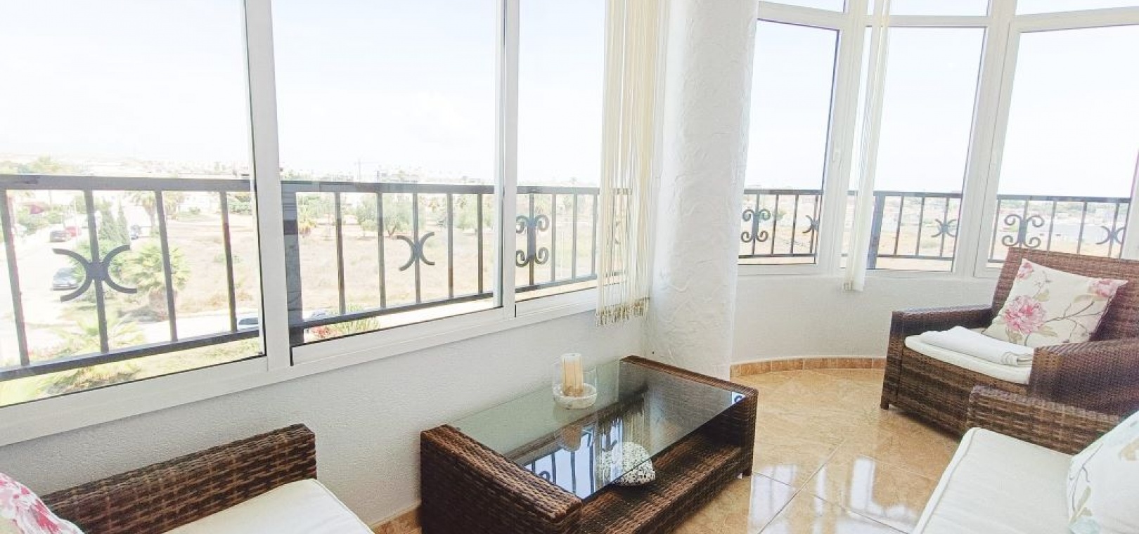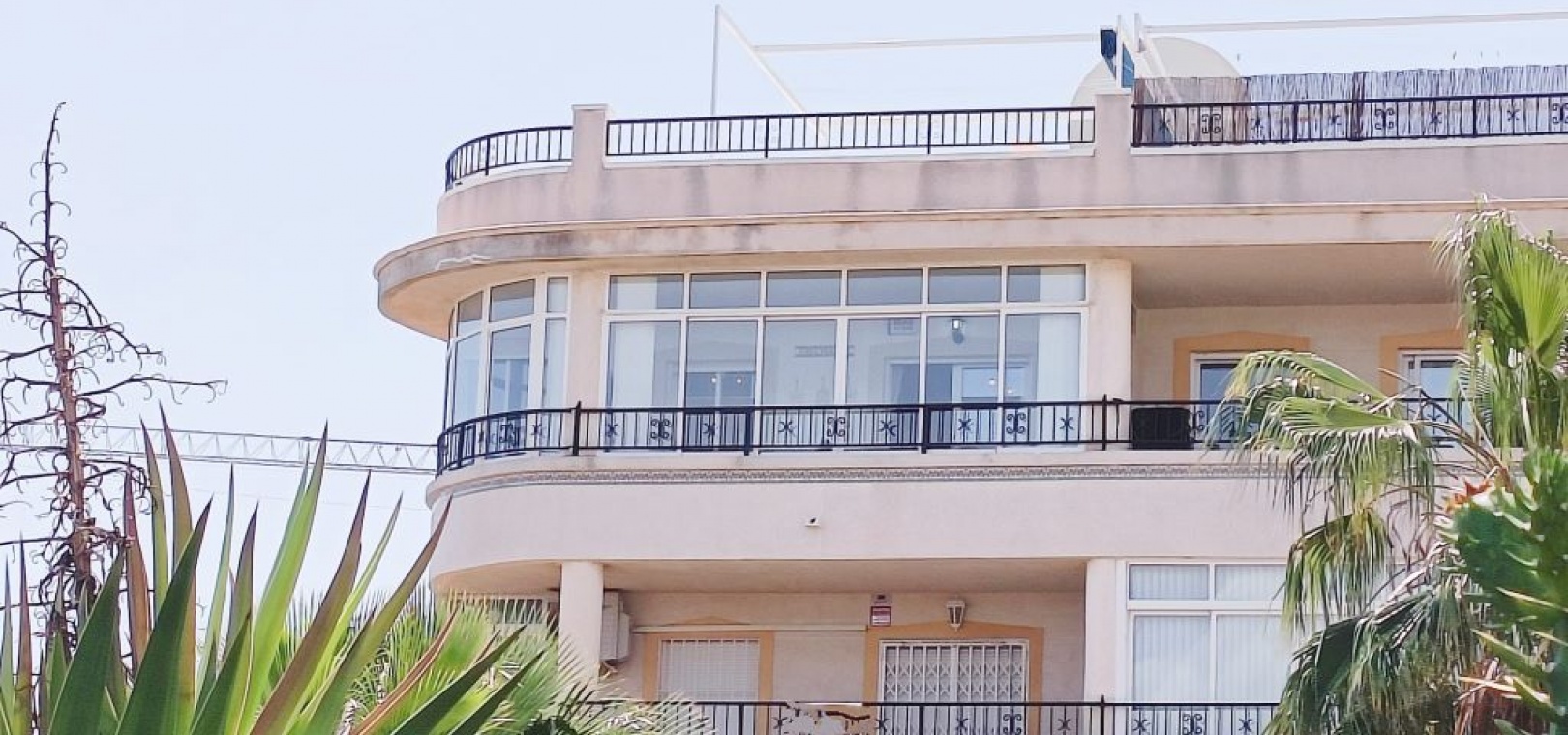 A 3 bed 1 bath top floor corner apartment with a large private rooftop solarium located in Res. La Mirada, Playa Flamenca, Costa Blanca.
