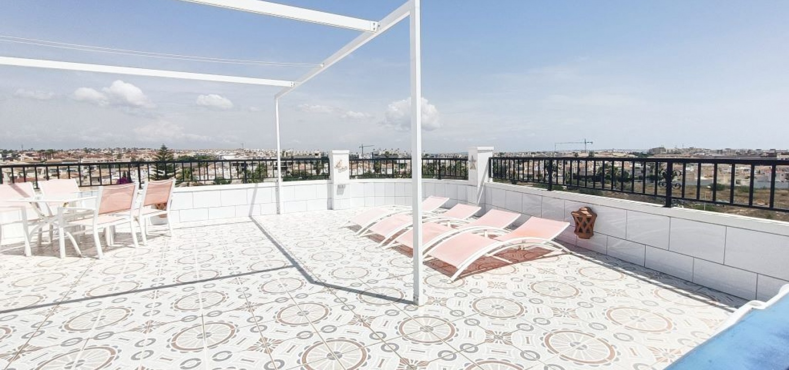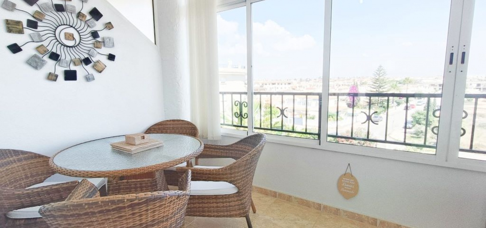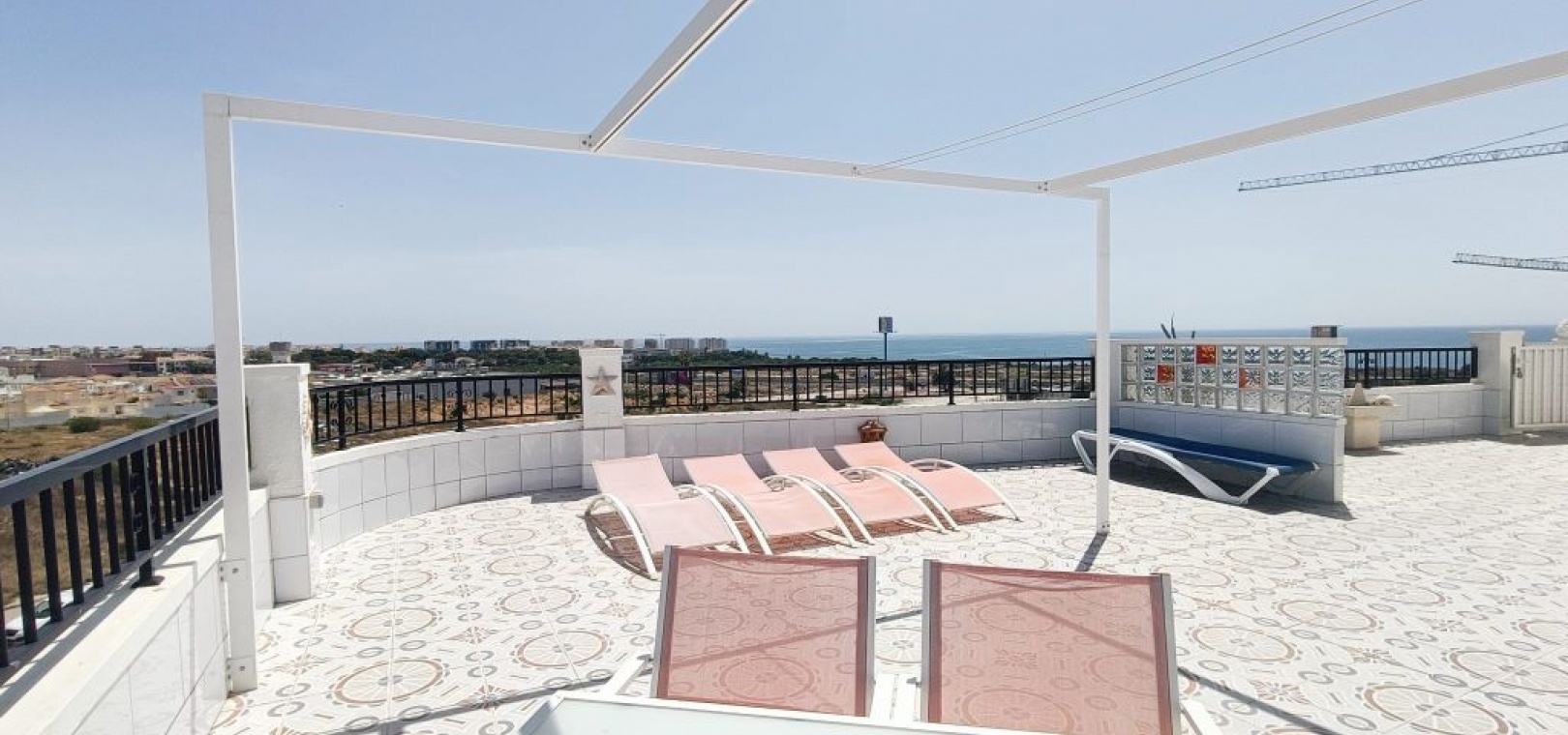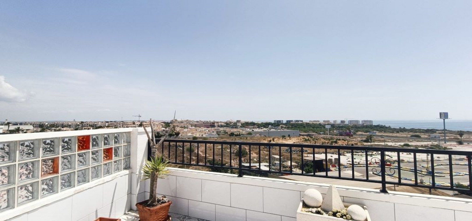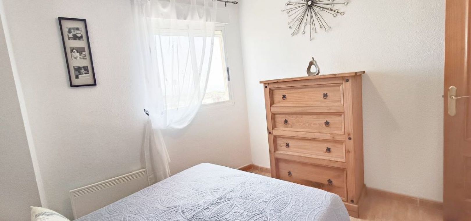 A 3 bed 1 bath top floor corner apartment with a large private rooftop solarium located in Res. La Mirada, Playa Flamenca, Costa Blanca.