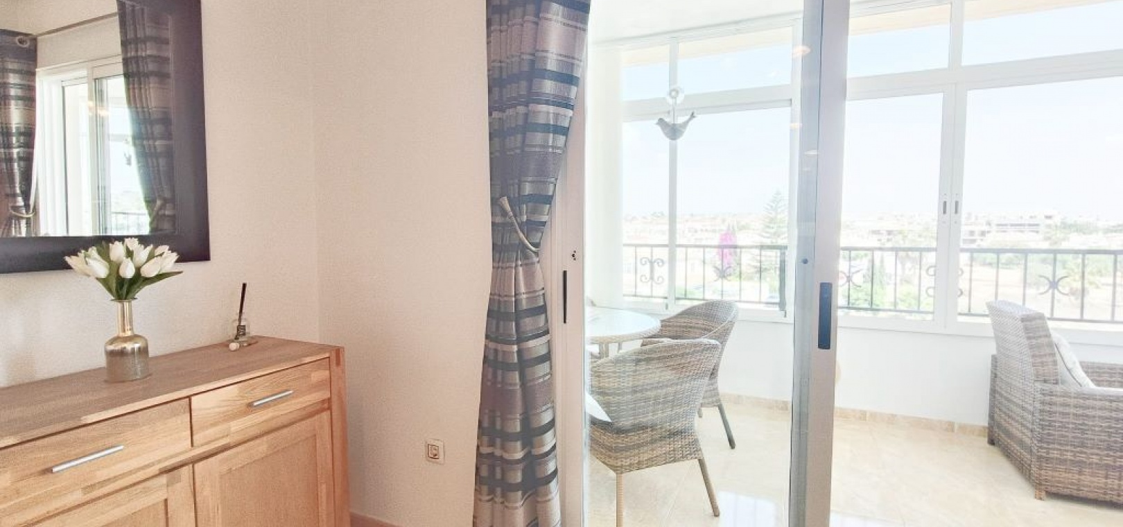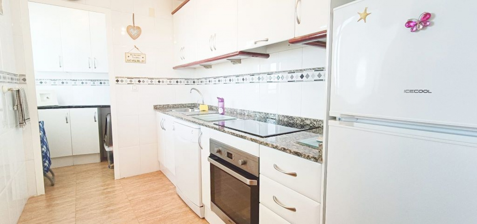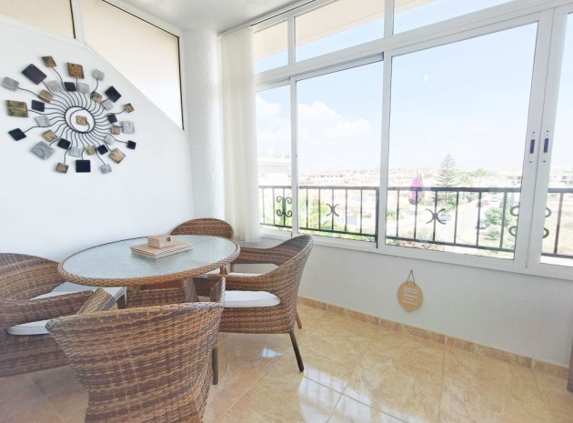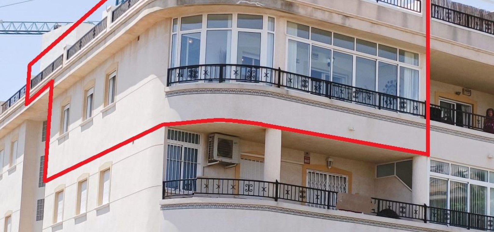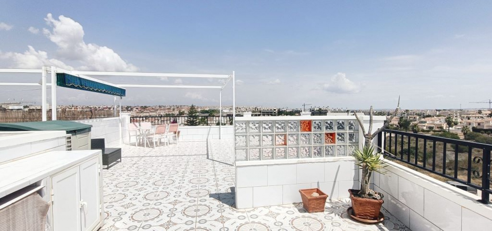 A 3 bed 1 bath top floor corner apartment with a large private rooftop solarium located in Res. La Mirada, Playa Flamenca, Costa Blanca.