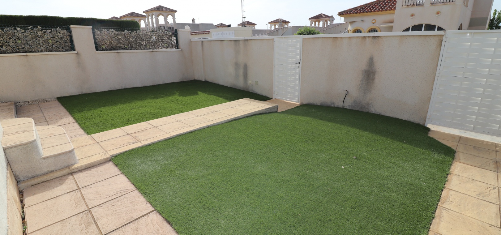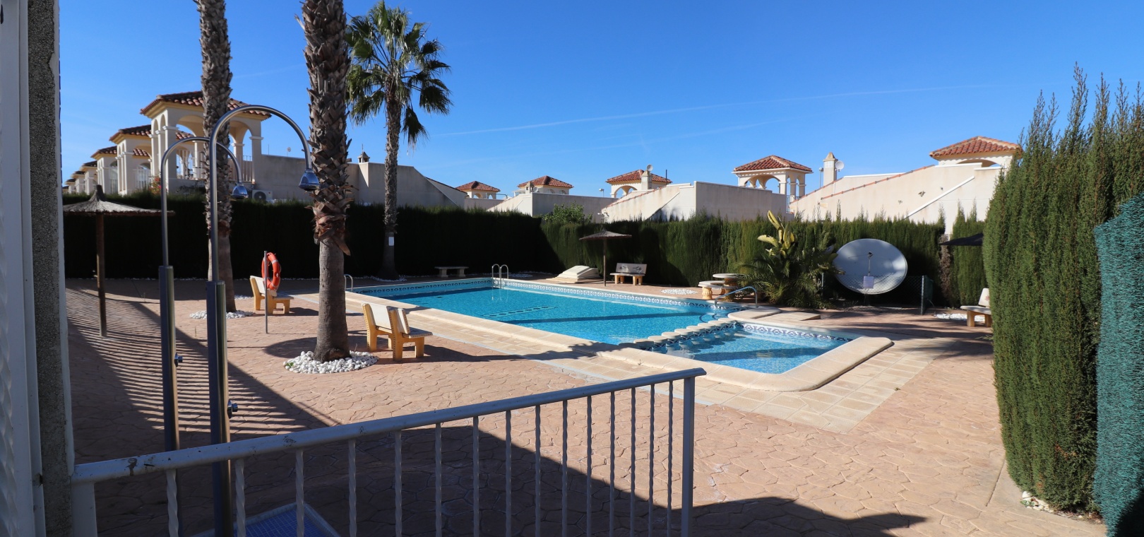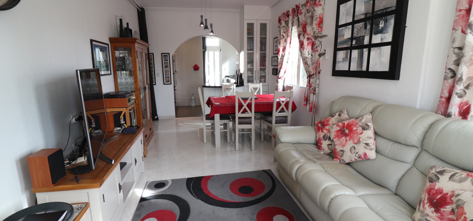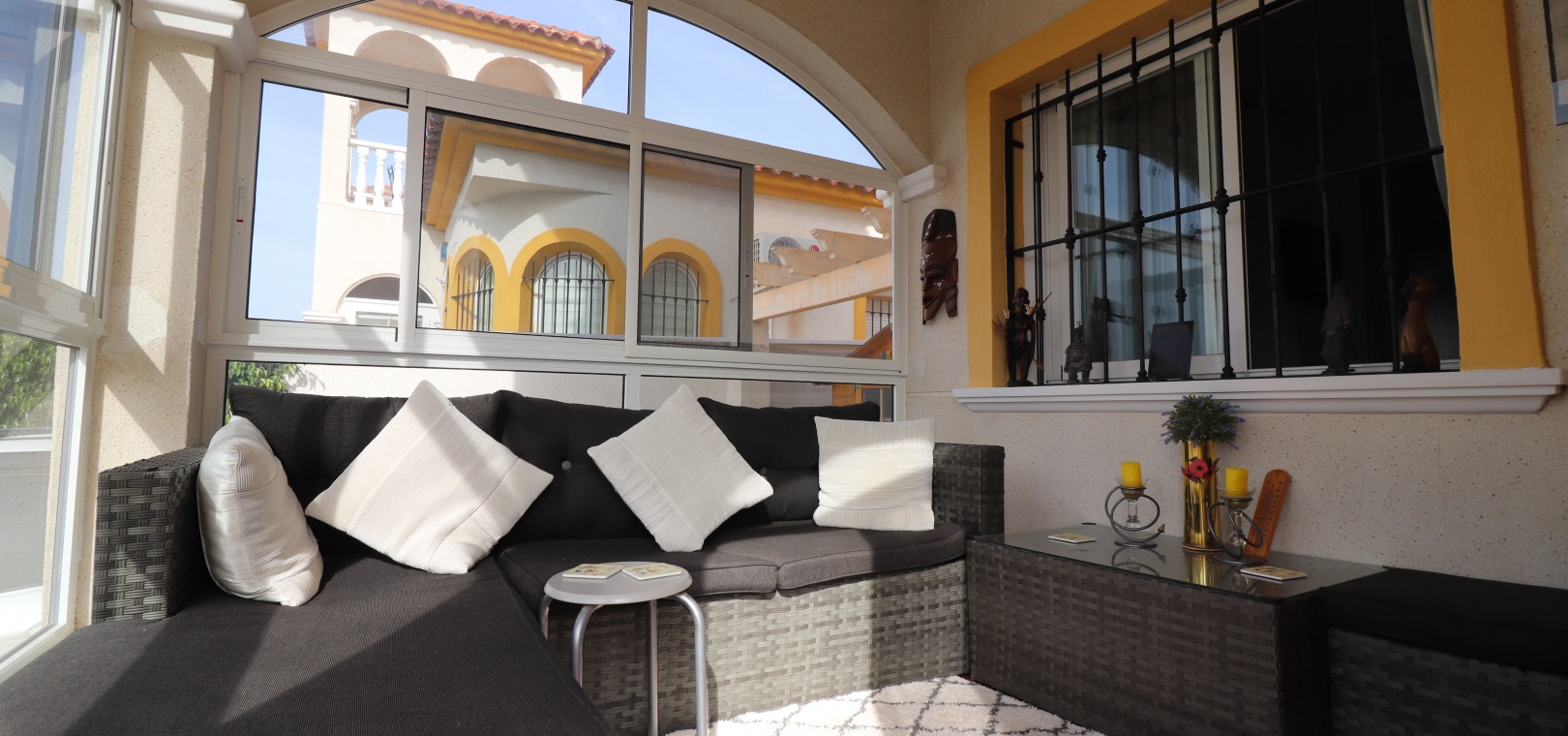 This Desirable, Updated, Three Bedroom Detached Villa in Benimar II is located in a popular urbanization, very close to the commercial centre of Benimar itself, between Benijofar and Rojales. Situated almost in front of the communal swimming pool, within a stones throw, a couple of minutes walk to many amenities, to include a wide array of bars, restaurants, shops and supermarkets. The beautiful beaches of Guardamar del Segura are also only a 10 minute drive away! This fabulous popular ‘Carla’ style property comprises of a modernized and extended. great size, open plan fully fitted kitchen, with a rear door to the back terrace and patio area; spacious lounge/dining room, very bright and light, leading to the front, covered, sunny and glazed in terrace, an ideal winter room, overlooking the front garden; three double bedrooms, the master with updated & modern walk in shower room; and the same quality family shower room... Outside is a landscaped, tiled and artificial grassed garden with ample space to relax and entertain, plenty of room to dine outdoors, plus off road parking. External stairs from the rear of the property lead to the spacious sun drenched solarium, a great space for the whole family, BBQ’s and more, including a turret, which has been closed in and extended, for additional living space. Extras are to include fitted wardrobes, air conditioning throughout, ceiling fans in the bedrooms, grills, storeroom under the solarium stairs and more... Great opportunity!!!