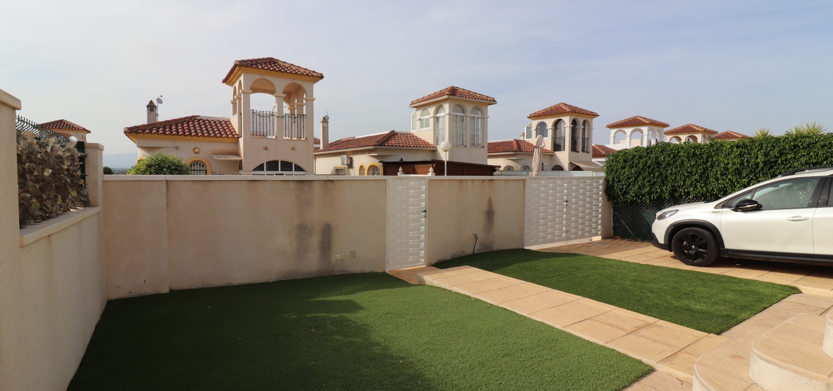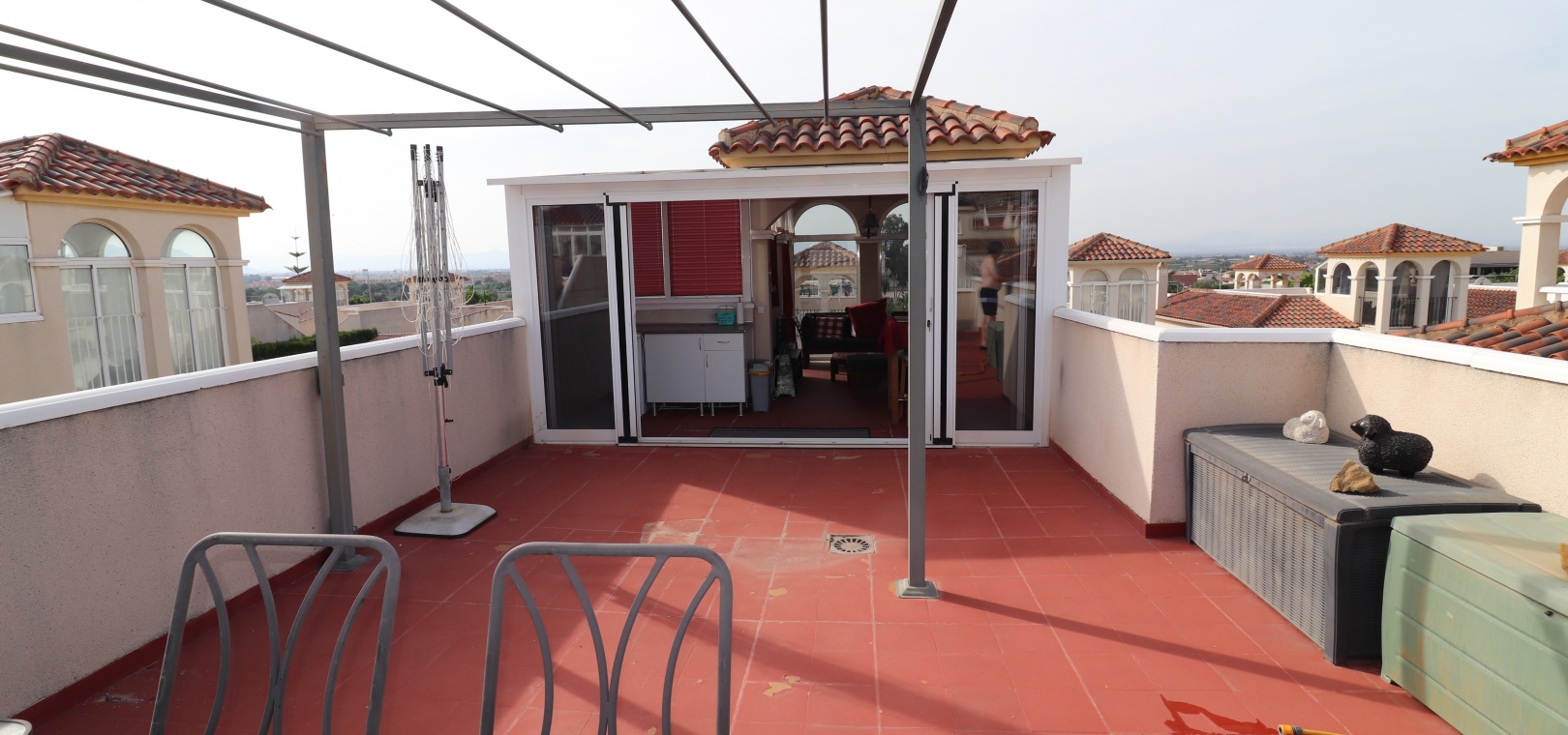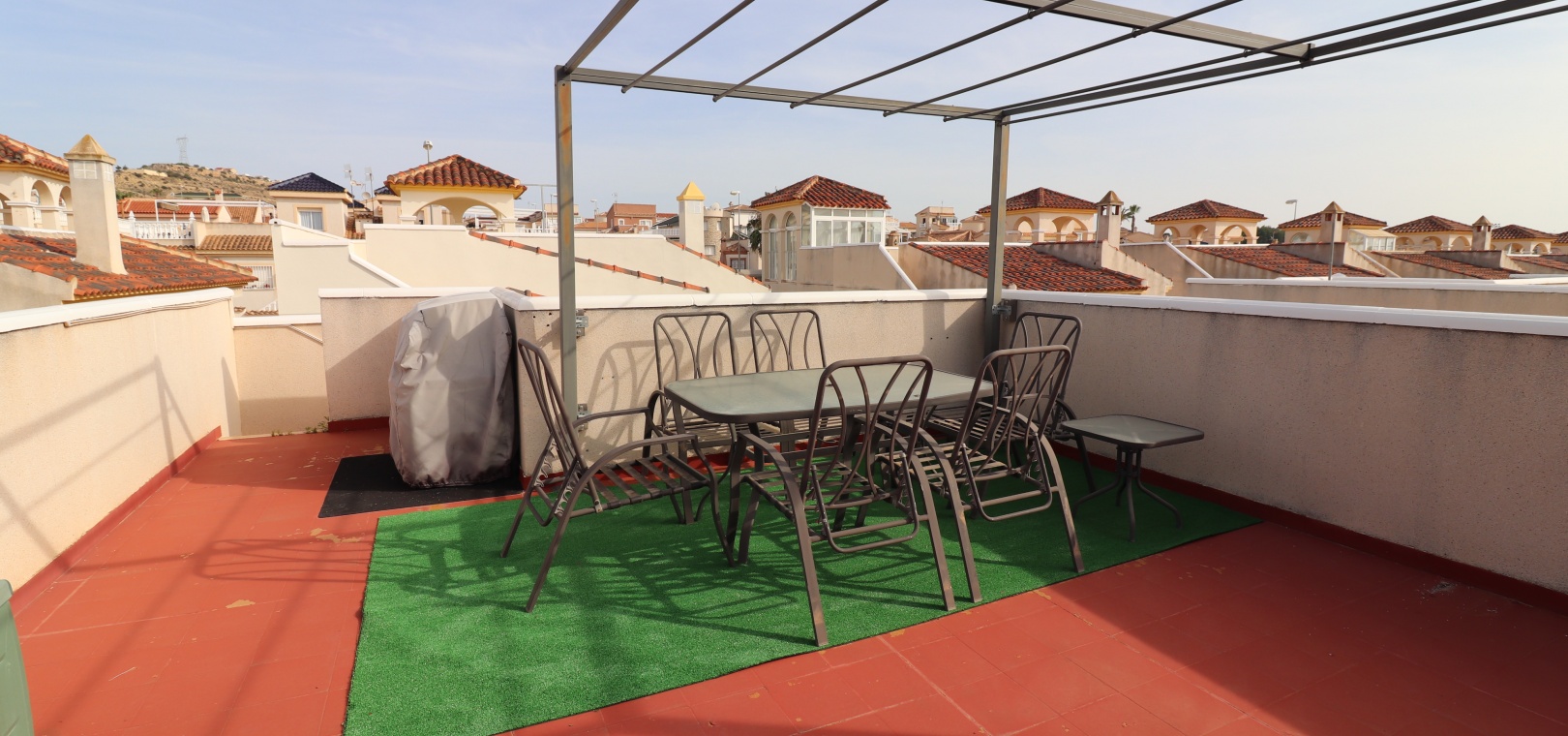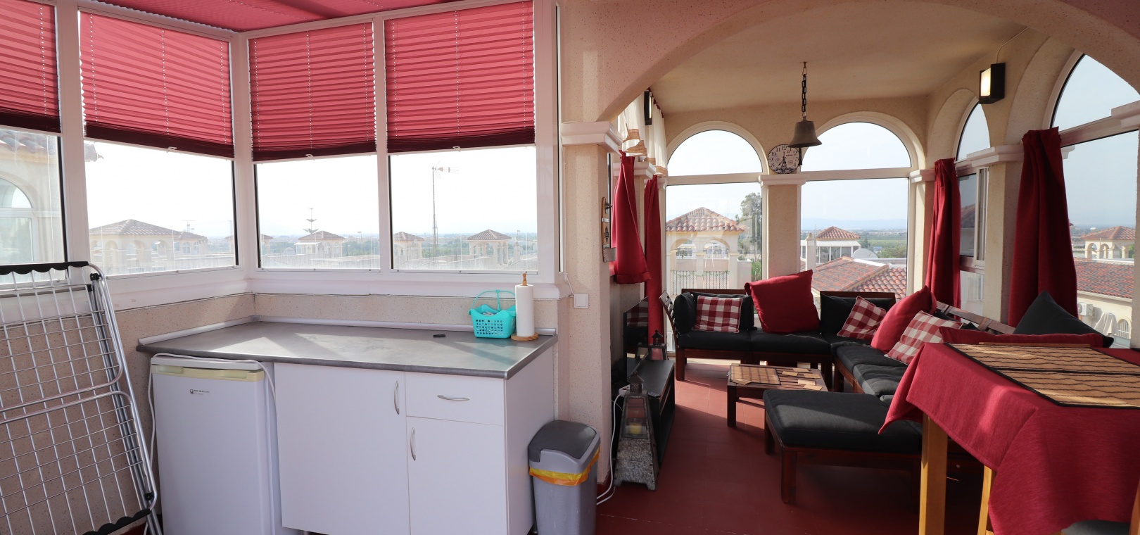 This Desirable, Updated, Three Bedroom Detached Villa in Benimar II is located in a popular urbanization, very close to the commercial centre of Benimar itself, between Benijofar and Rojales. Situated almost in front of the communal swimming pool, within a stones throw, a couple of minutes walk to many amenities, to include a wide array of bars, restaurants, shops and supermarkets. The beautiful beaches of Guardamar del Segura are also only a 10 minute drive away! This fabulous popular ‘Carla’ style property comprises of a modernized and extended. great size, open plan fully fitted kitchen, with a rear door to the back terrace and patio area; spacious lounge/dining room, very bright and light, leading to the front, covered, sunny and glazed in terrace, an ideal winter room, overlooking the front garden; three double bedrooms, the master with updated & modern walk in shower room; and the same quality family shower room... Outside is a landscaped, tiled and artificial grassed garden with ample space to relax and entertain, plenty of room to dine outdoors, plus off road parking. External stairs from the rear of the property lead to the spacious sun drenched solarium, a great space for the whole family, BBQ’s and more, including a turret, which has been closed in and extended, for additional living space. Extras are to include fitted wardrobes, air conditioning throughout, ceiling fans in the bedrooms, grills, storeroom under the solarium stairs and more... Great opportunity!!!
