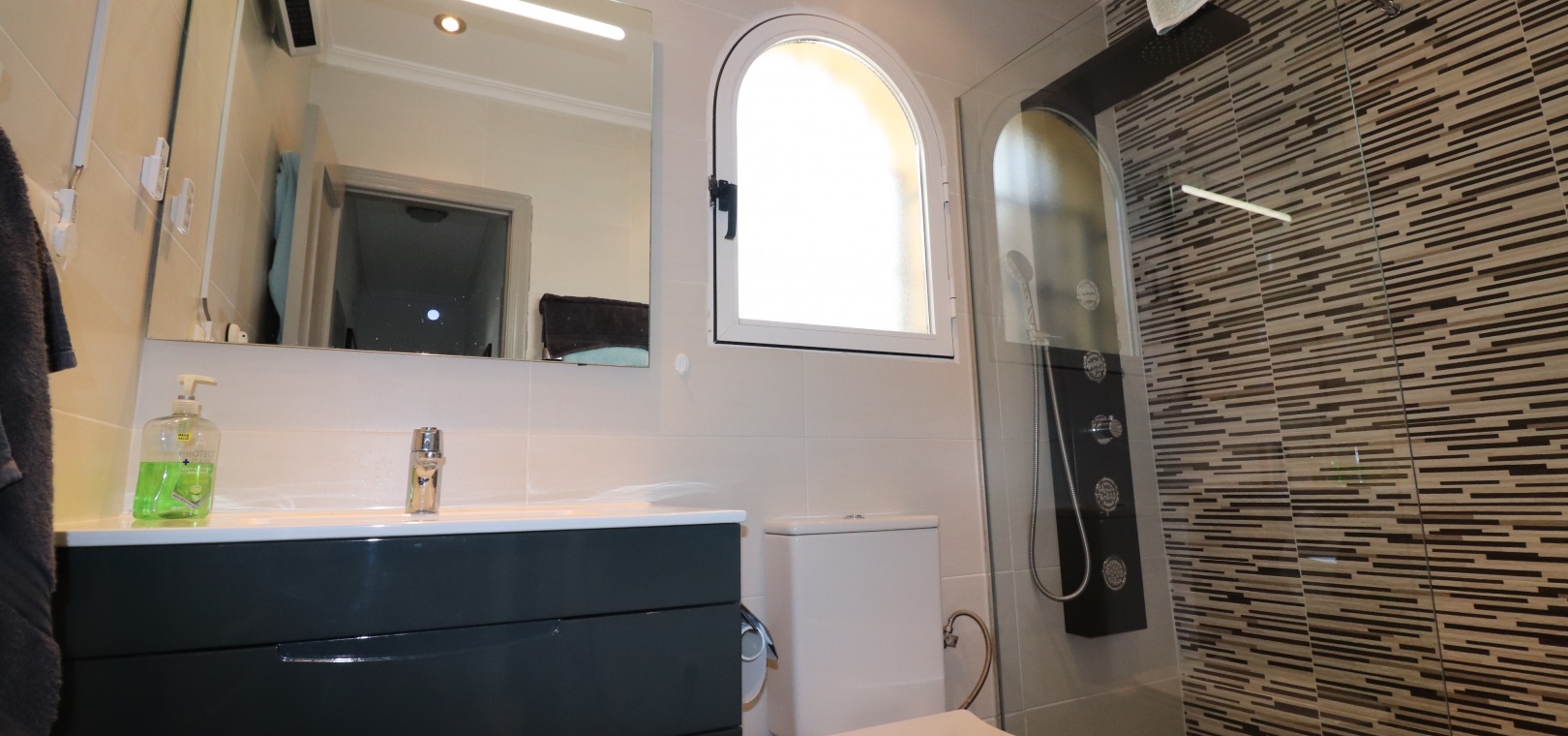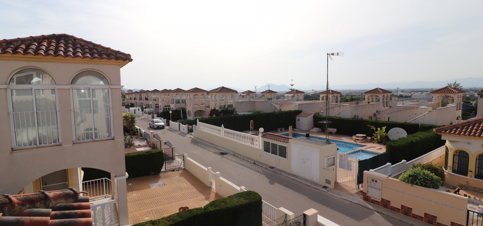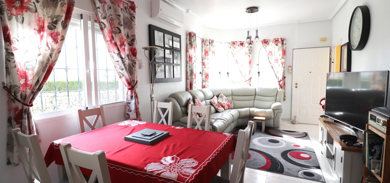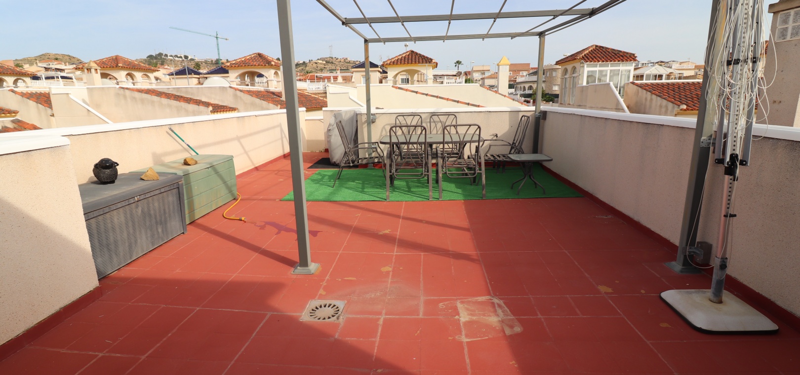 This Desirable, Updated, Three Bedroom Detached Villa in Benimar II is located in a popular urbanization, very close to the commercial centre of Benimar itself, between Benijofar and Rojales. Situated almost in front of the communal swimming pool, within a stones throw, a couple of minutes walk to many amenities, to include a wide array of bars, restaurants, shops and supermarkets. The beautiful beaches of Guardamar del Segura are also only a 10 minute drive away! This fabulous popular ‘Carla’ style property comprises of a modernized and extended. great size, open plan fully fitted kitchen, with a rear door to the back terrace and patio area; spacious lounge/dining room, very bright and light, leading to the front, covered, sunny and glazed in terrace, an ideal winter room, overlooking the front garden; three double bedrooms, the master with updated & modern walk in shower room; and the same quality family shower room... Outside is a landscaped, tiled and artificial grassed garden with ample space to relax and entertain, plenty of room to dine outdoors, plus off road parking. External stairs from the rear of the property lead to the spacious sun drenched solarium, a great space for the whole family, BBQ’s and more, including a turret, which has been closed in and extended, for additional living space. Extras are to include fitted wardrobes, air conditioning throughout, ceiling fans in the bedrooms, grills, storeroom under the solarium stairs and more... Great opportunity!!!