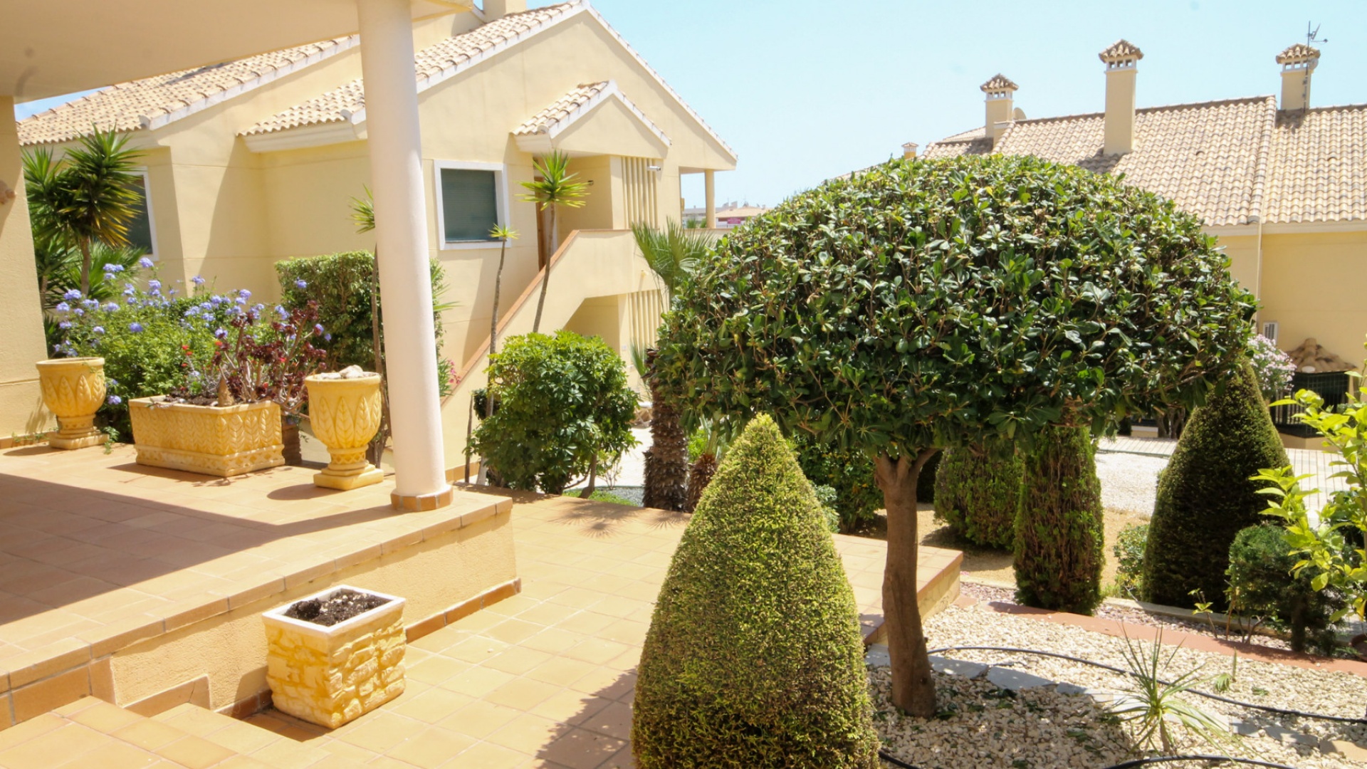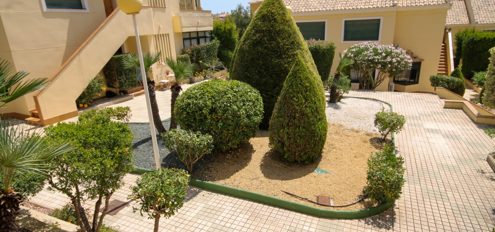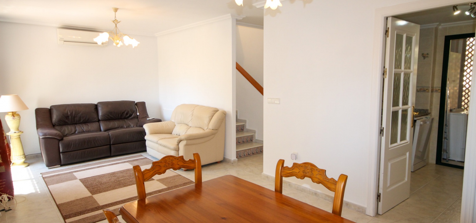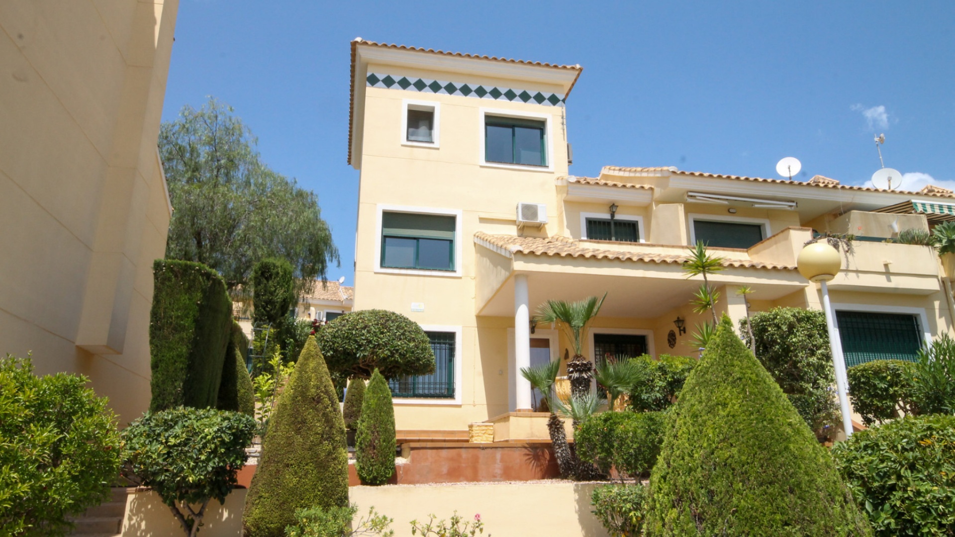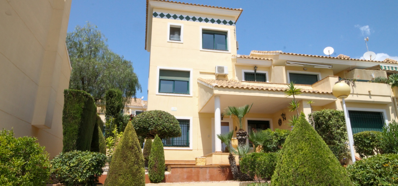 A 3 bed 3 bath semi detached house with views towards the communal gardens located in Lomas de Campoamor, Campoamor Golf Course, Costa Blanca.