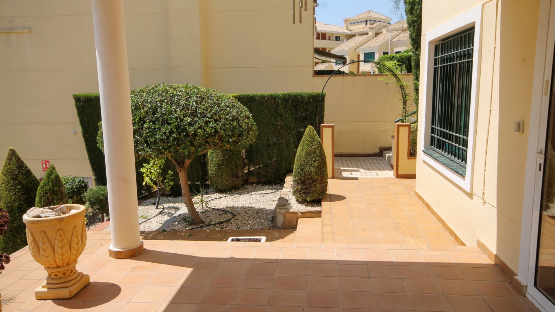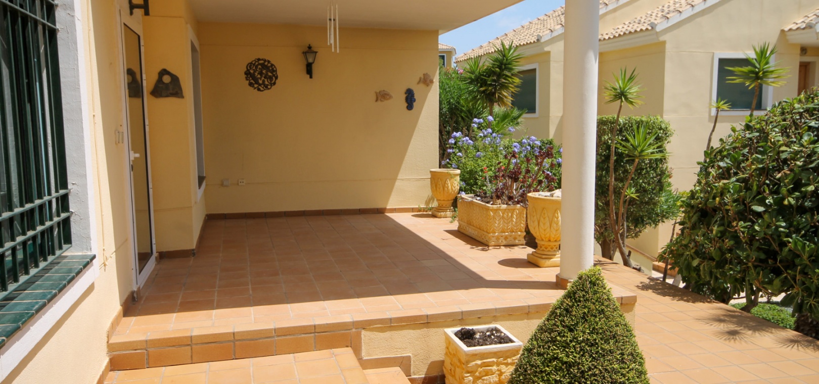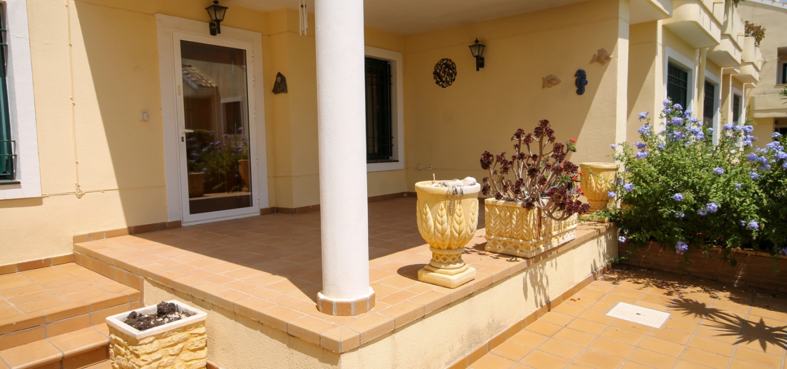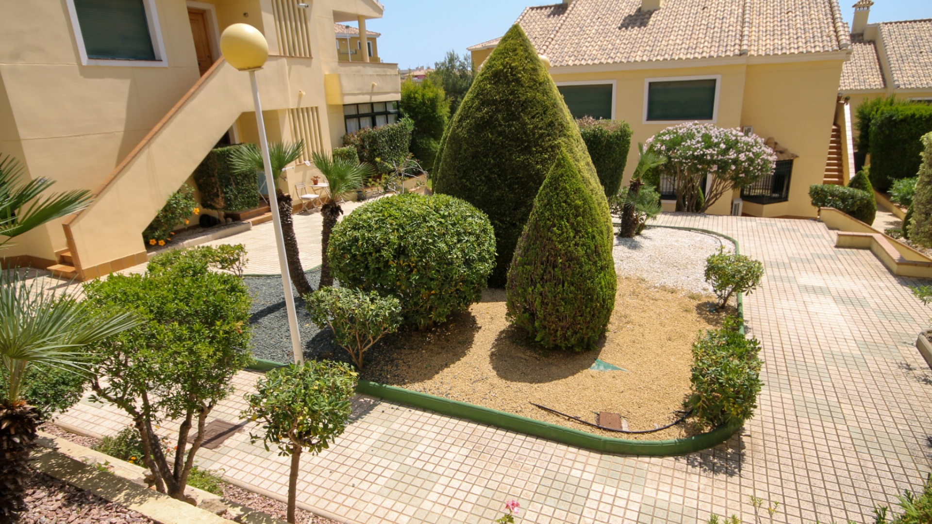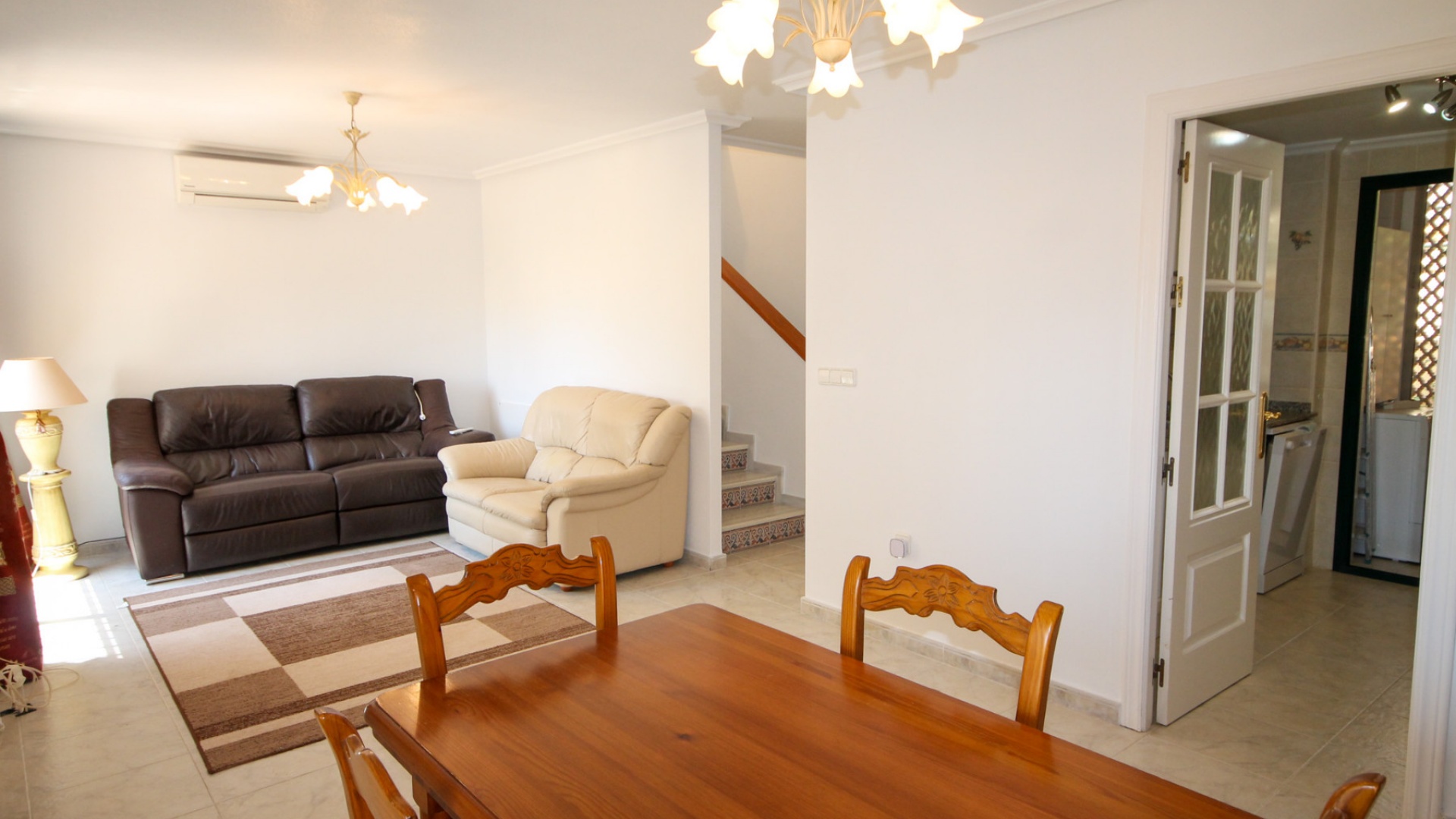A 3 bed 3 bath semi detached house with views towards the communal gardens located in Lomas de Campoamor, Campoamor Golf Course, Costa Blanca.