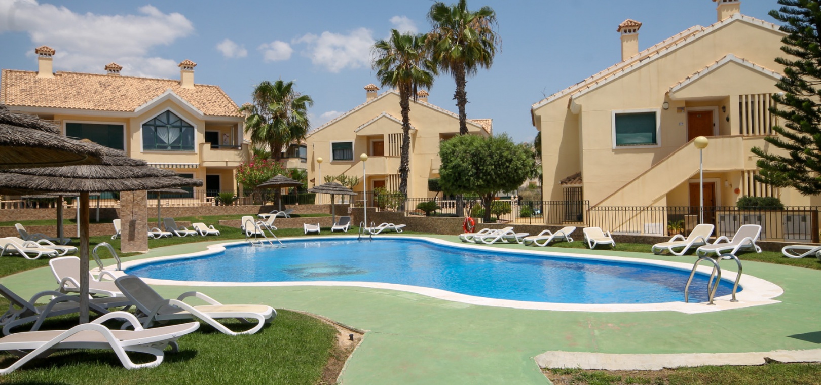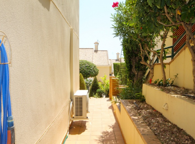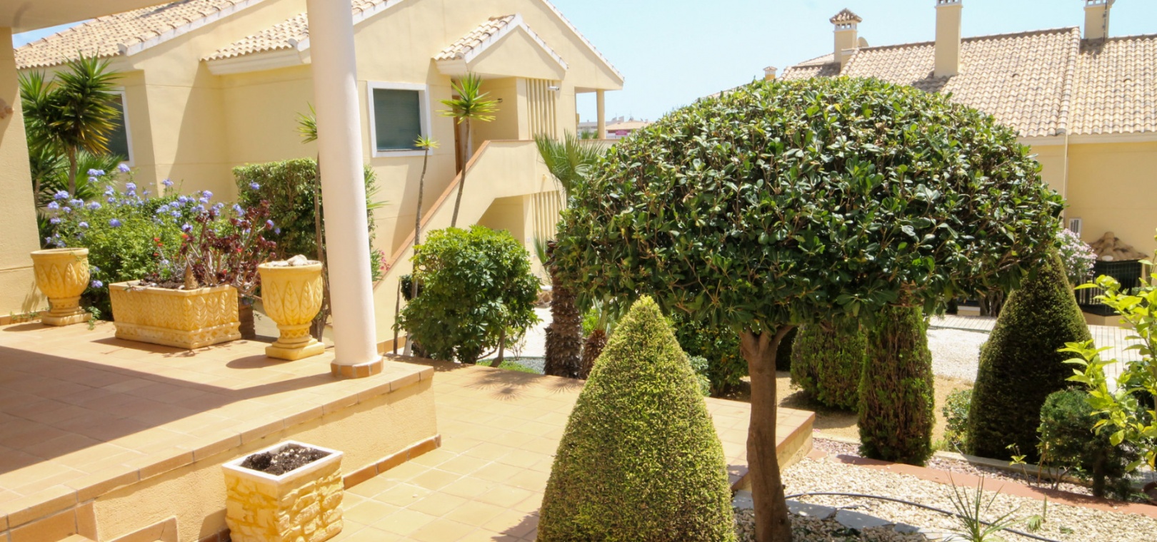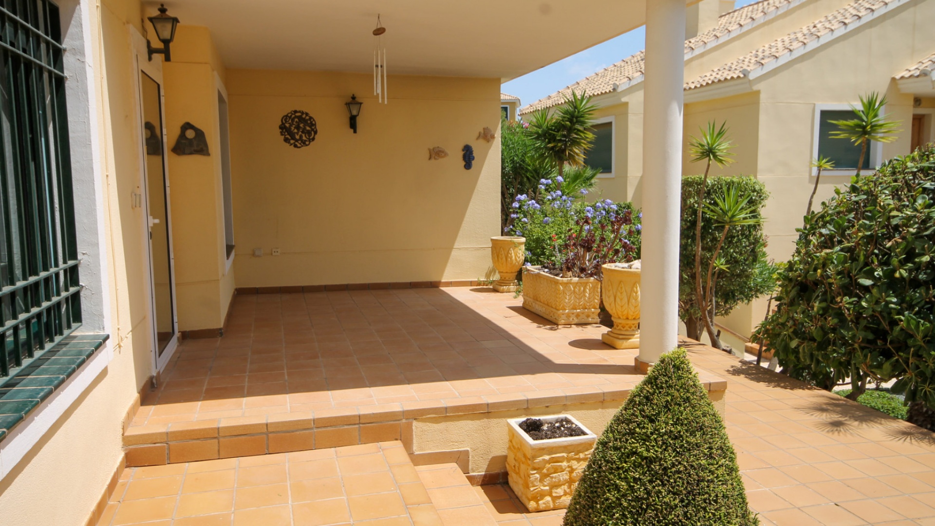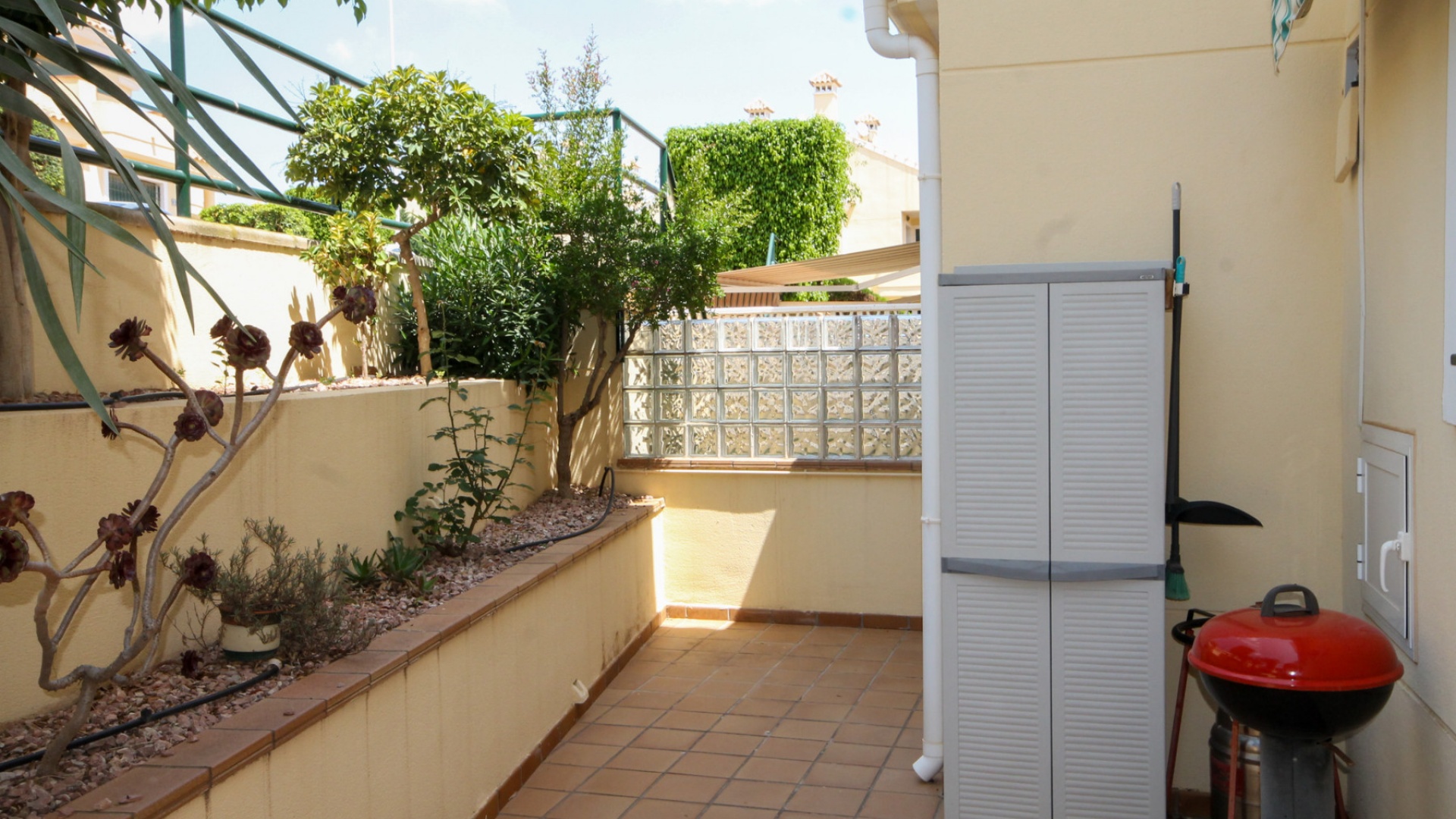 A 3 bed 3 bath semi detached house with views towards the communal gardens located in Lomas de Campoamor, Campoamor Golf Course, Costa Blanca.