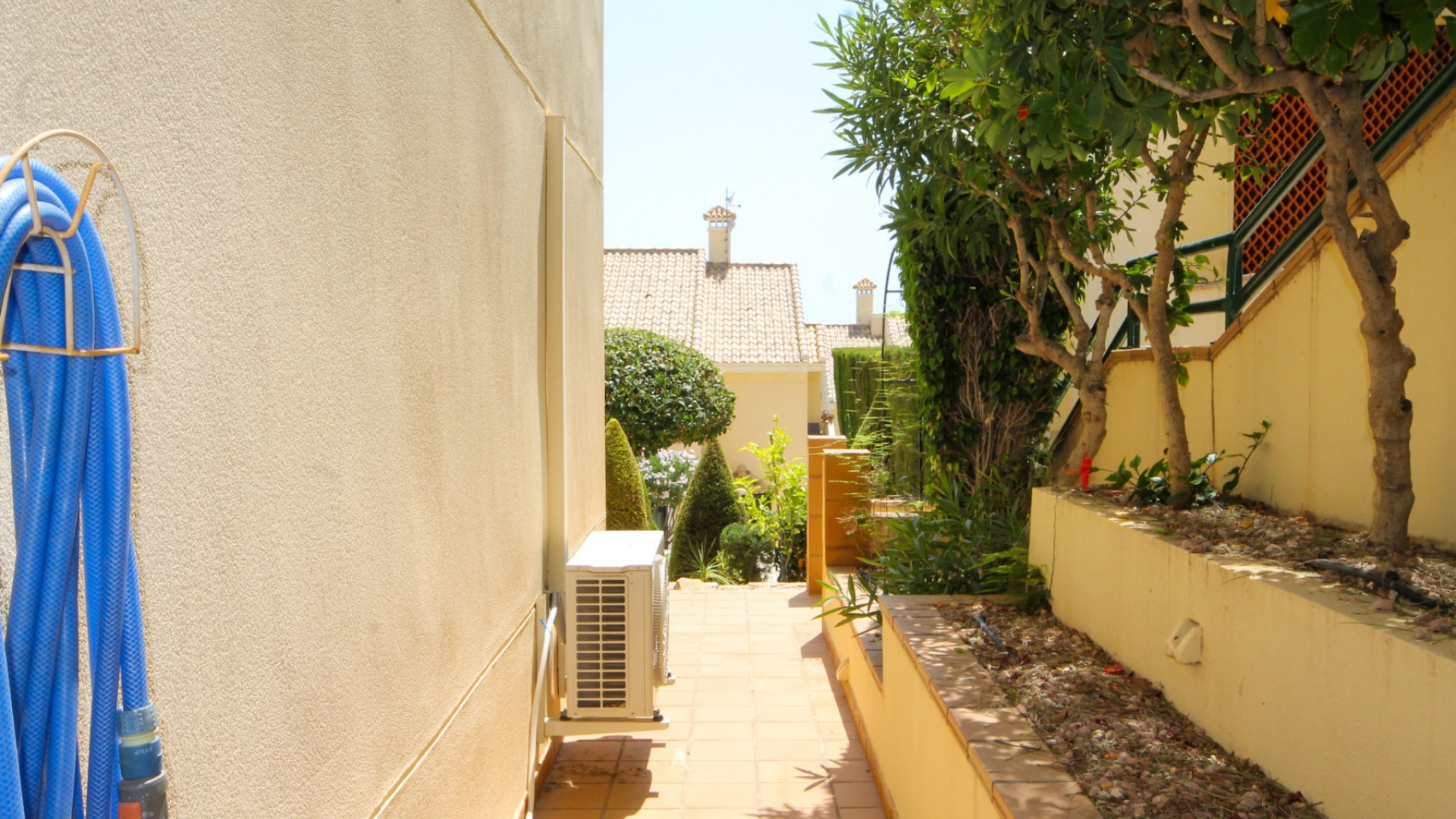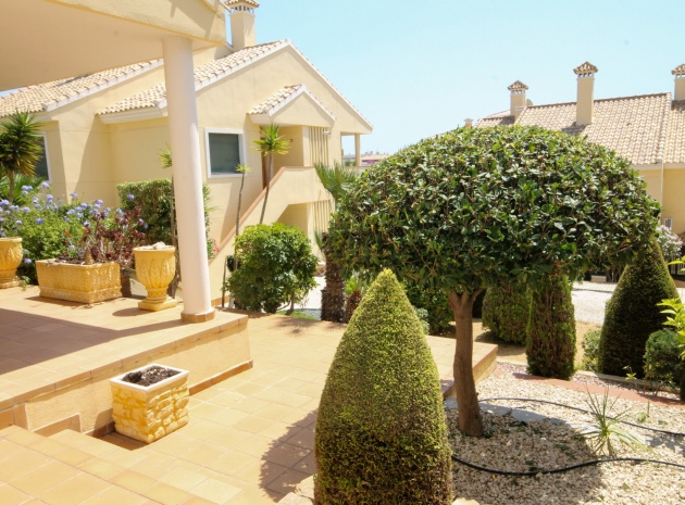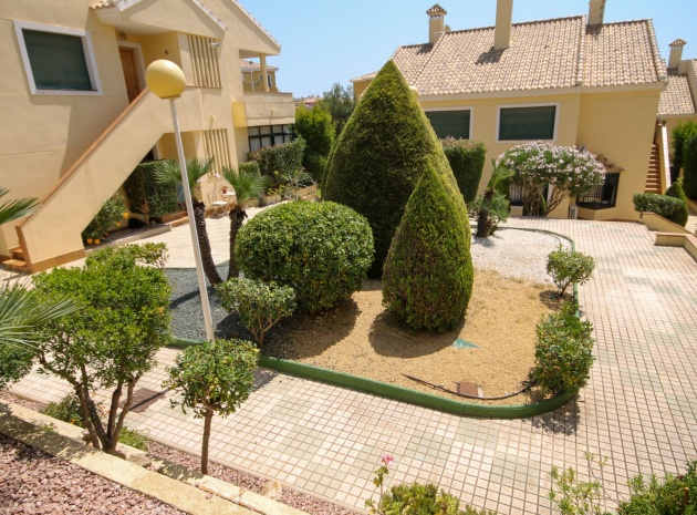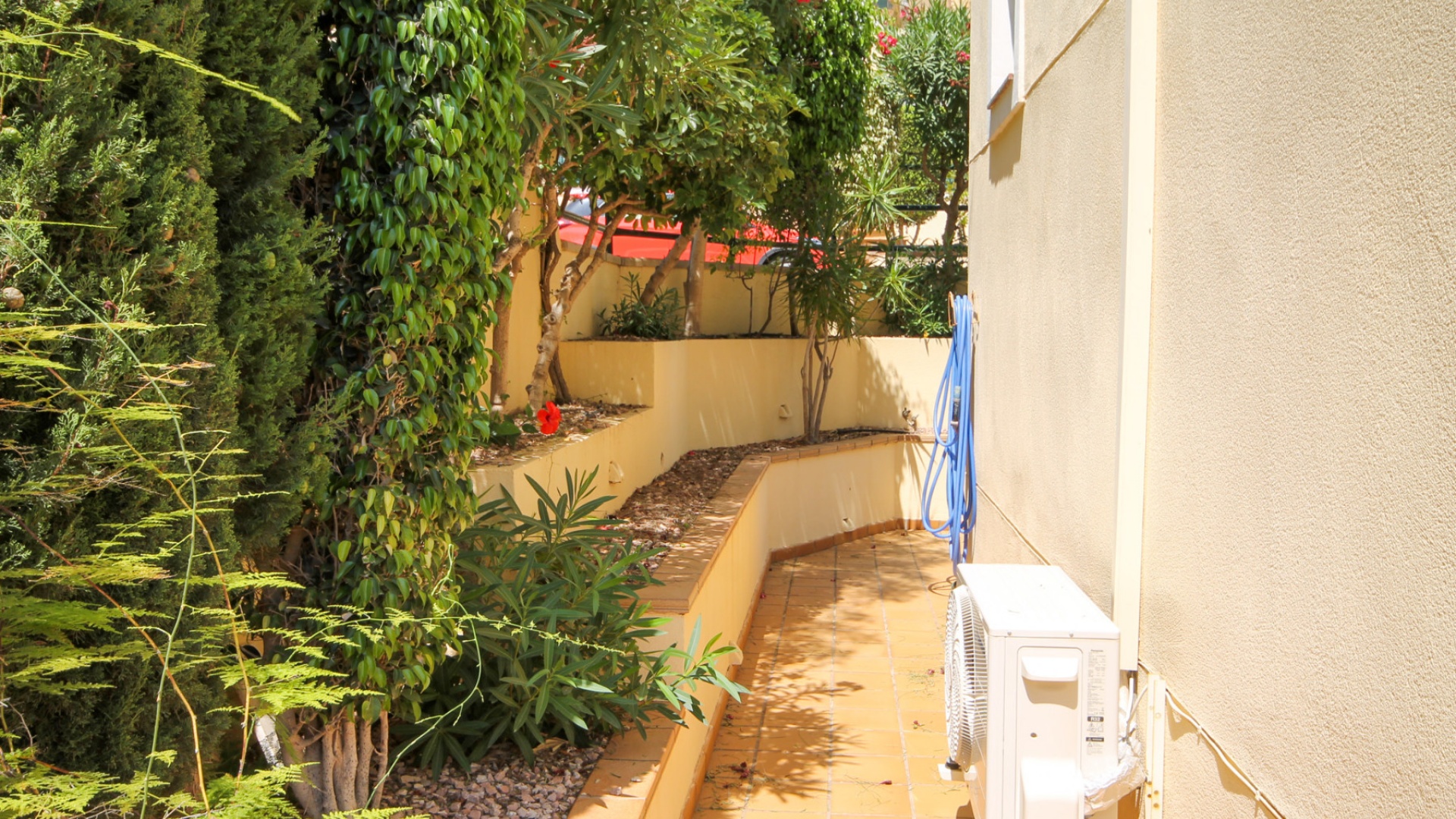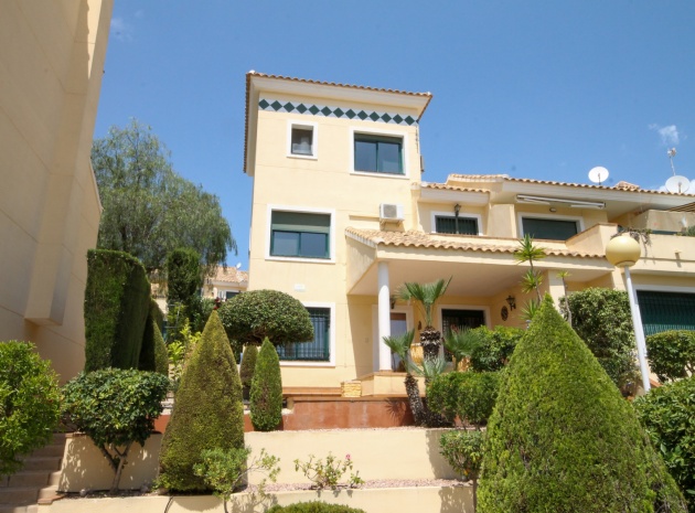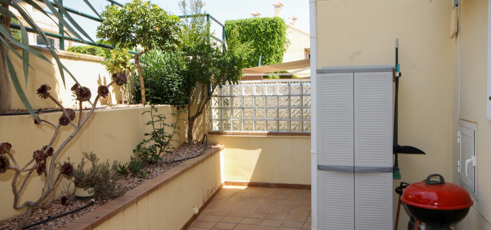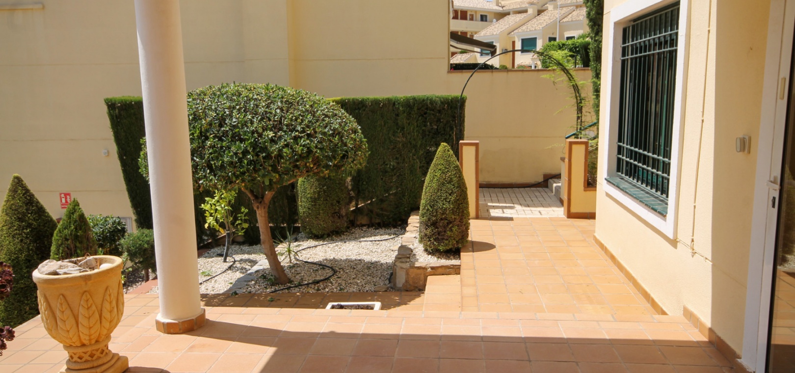 A 3 bed 3 bath semi detached house with views towards the communal gardens located in Lomas de Campoamor, Campoamor Golf Course, Costa Blanca.