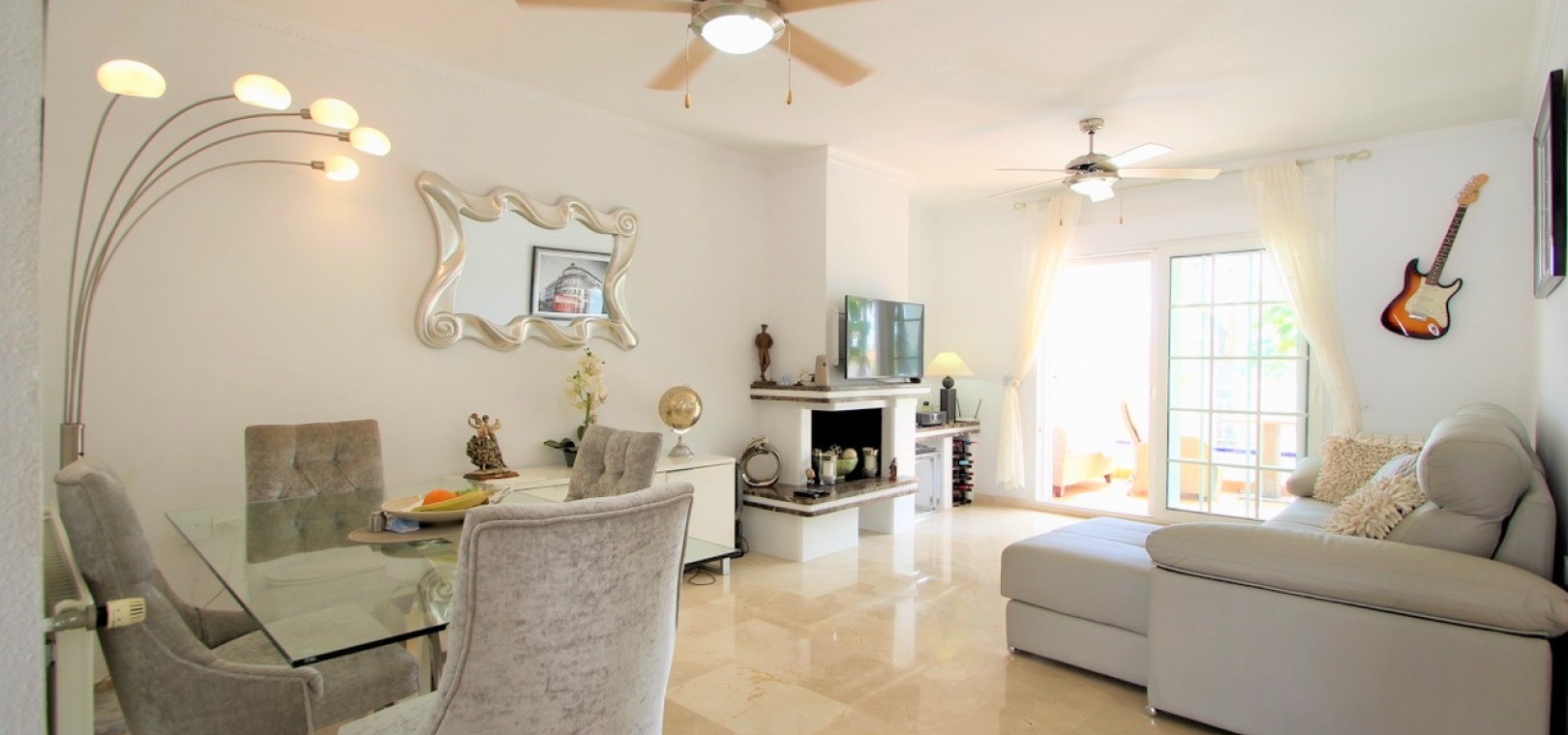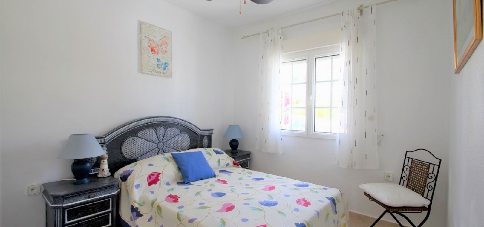 Outside there is a front terrace with a sun awning, ceiling fans & views towards the communal swimming pool, front & rear garden & much more.