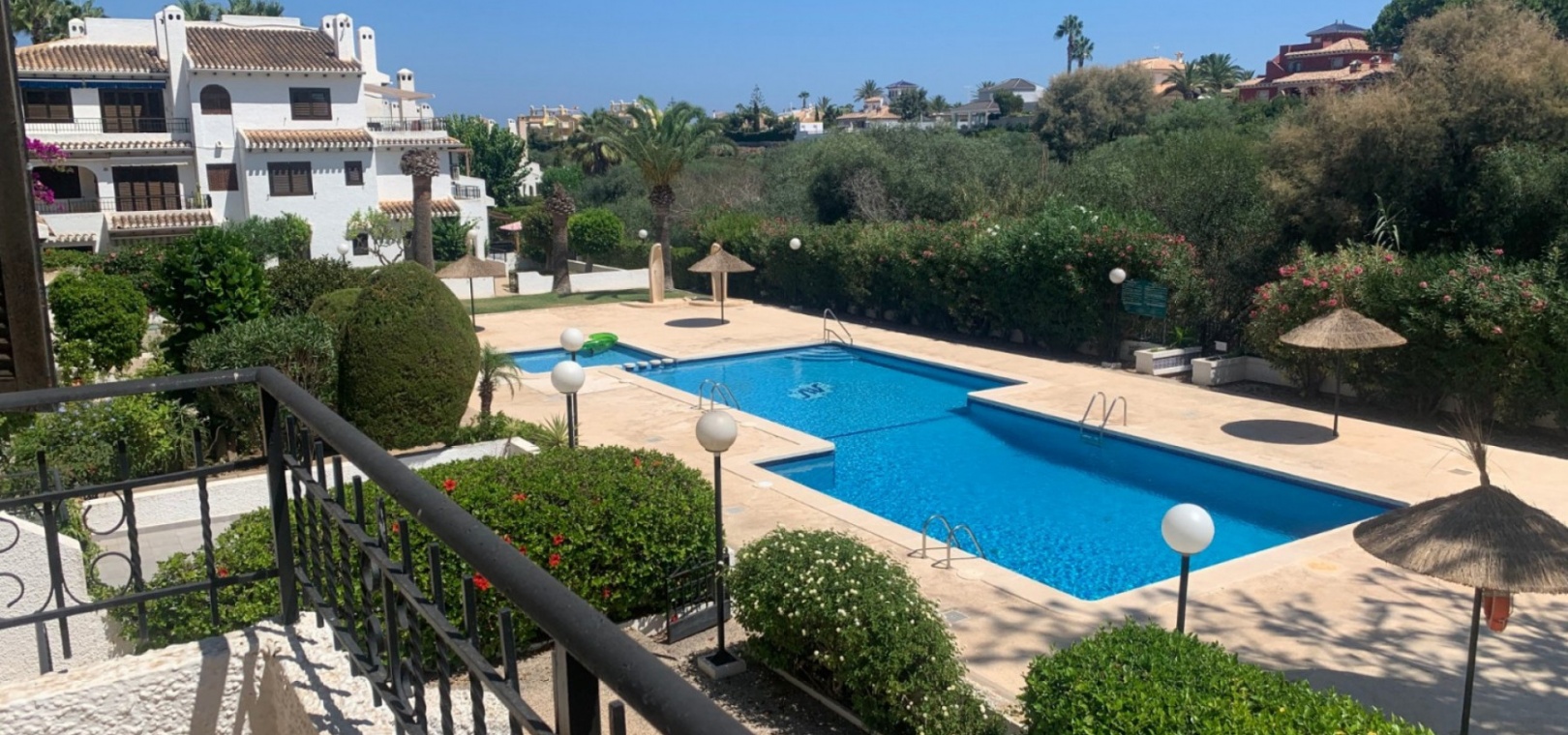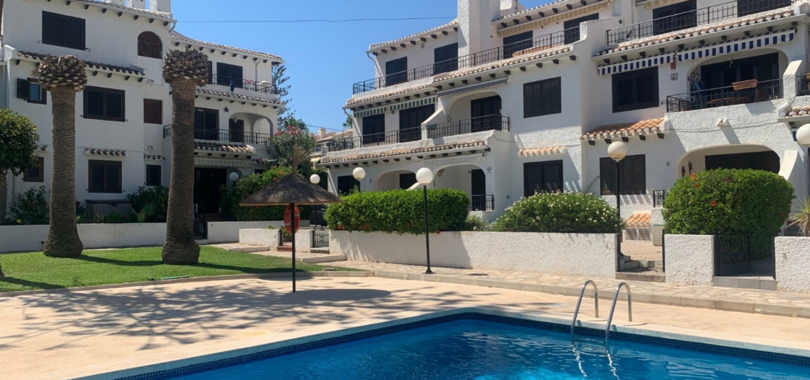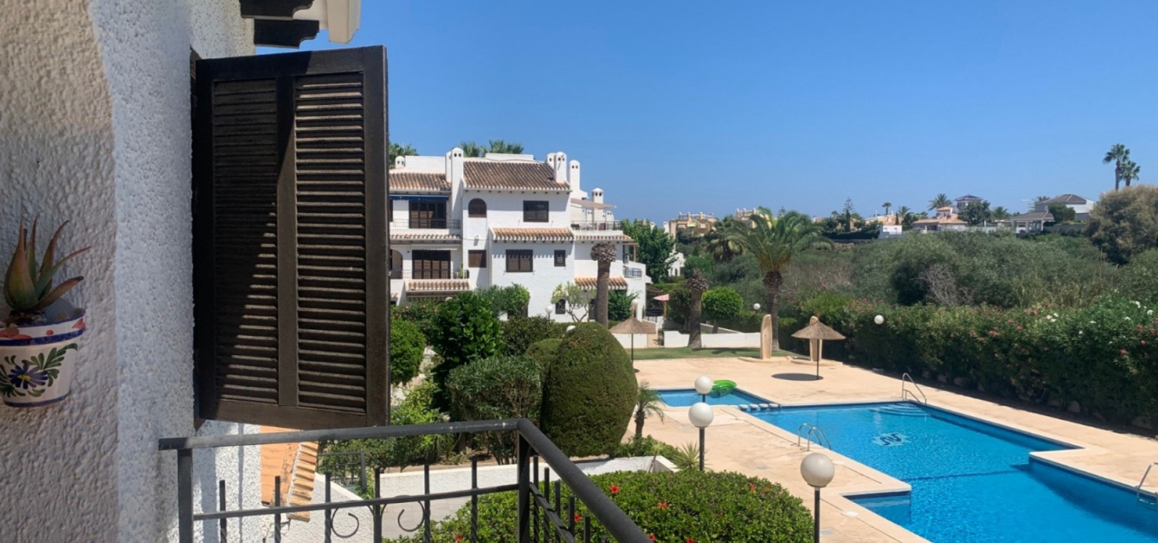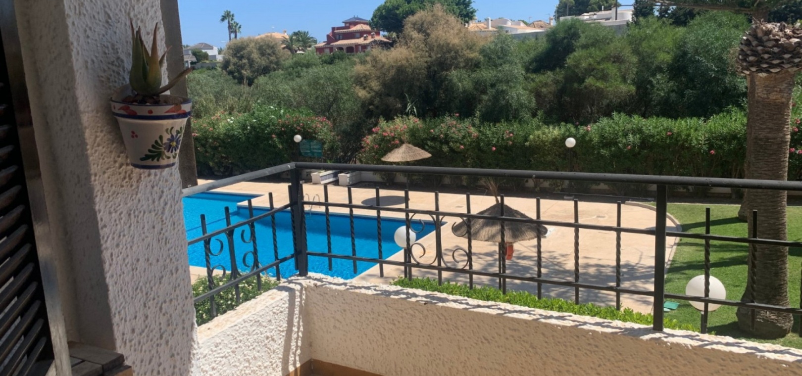 A South facing 2 bed 1 bath 1st floor apartment over looking the communal swimming pool located in Res. Sol y Verde II, Cabo Roig, Costa Blanca.