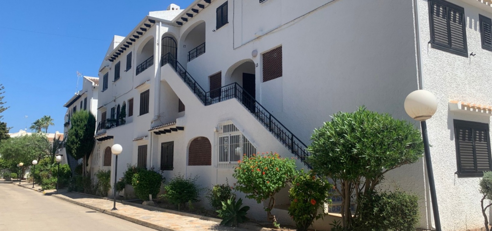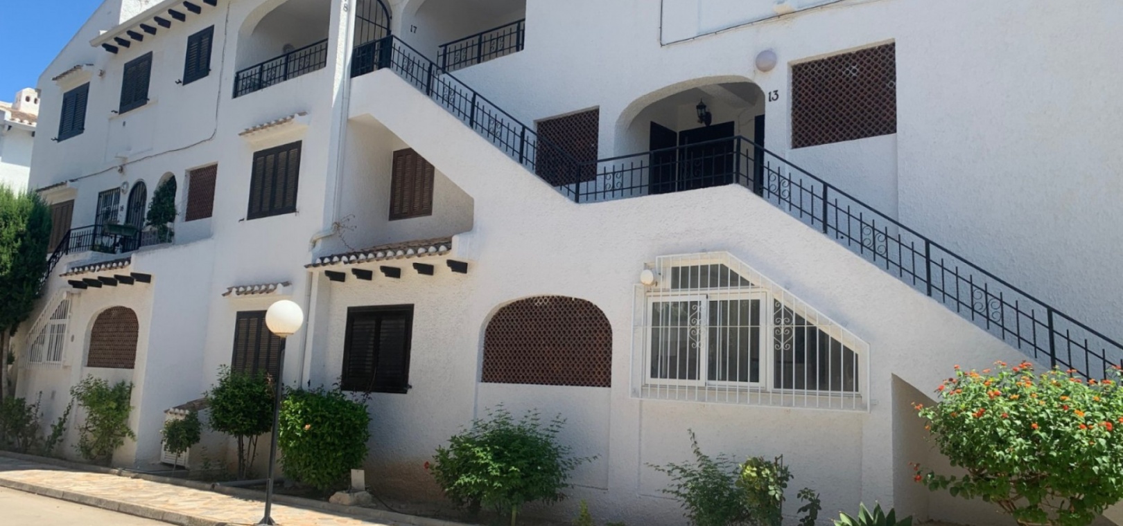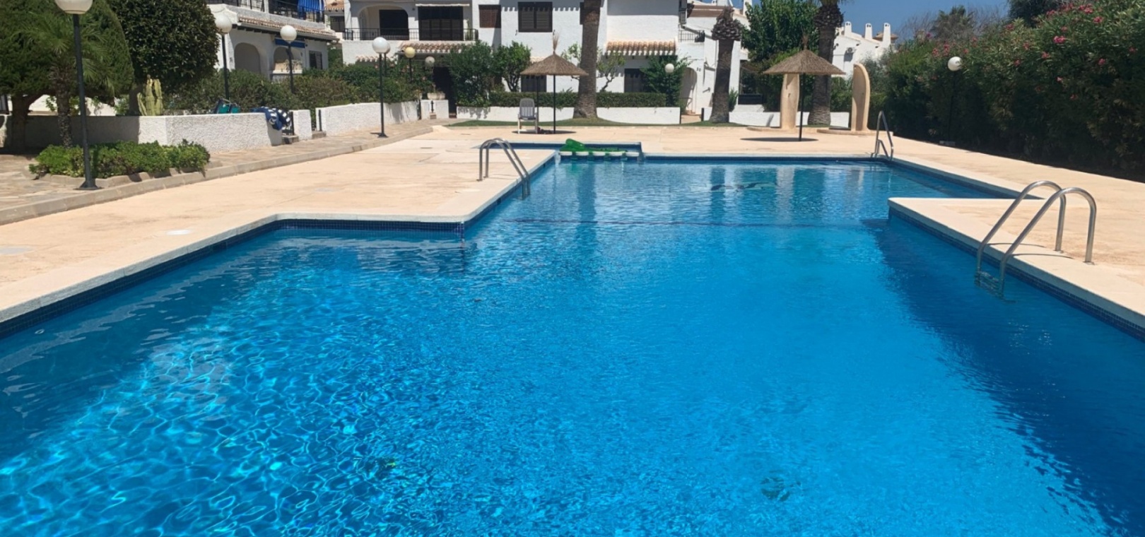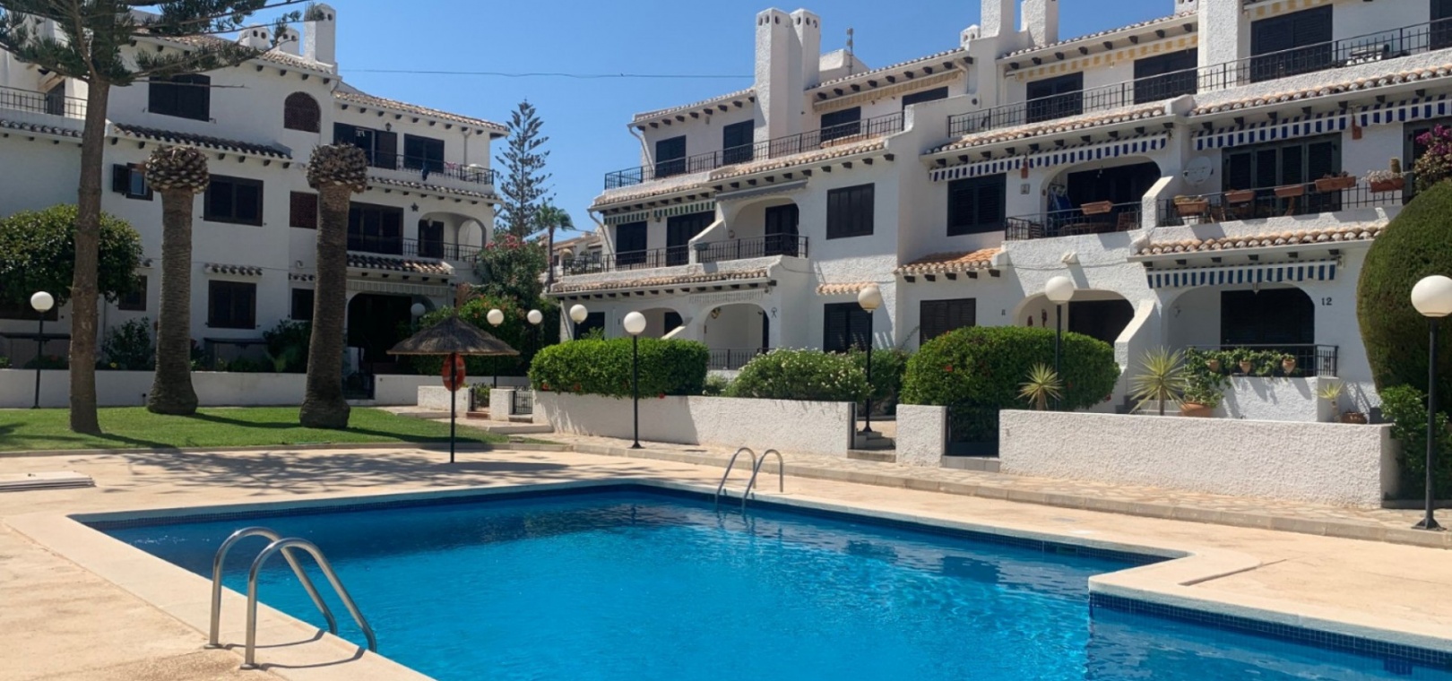 A South facing 2 bed 1 bath 1st floor apartment over looking the communal swimming pool located in Res. Sol y Verde II, Cabo Roig, Costa Blanca.