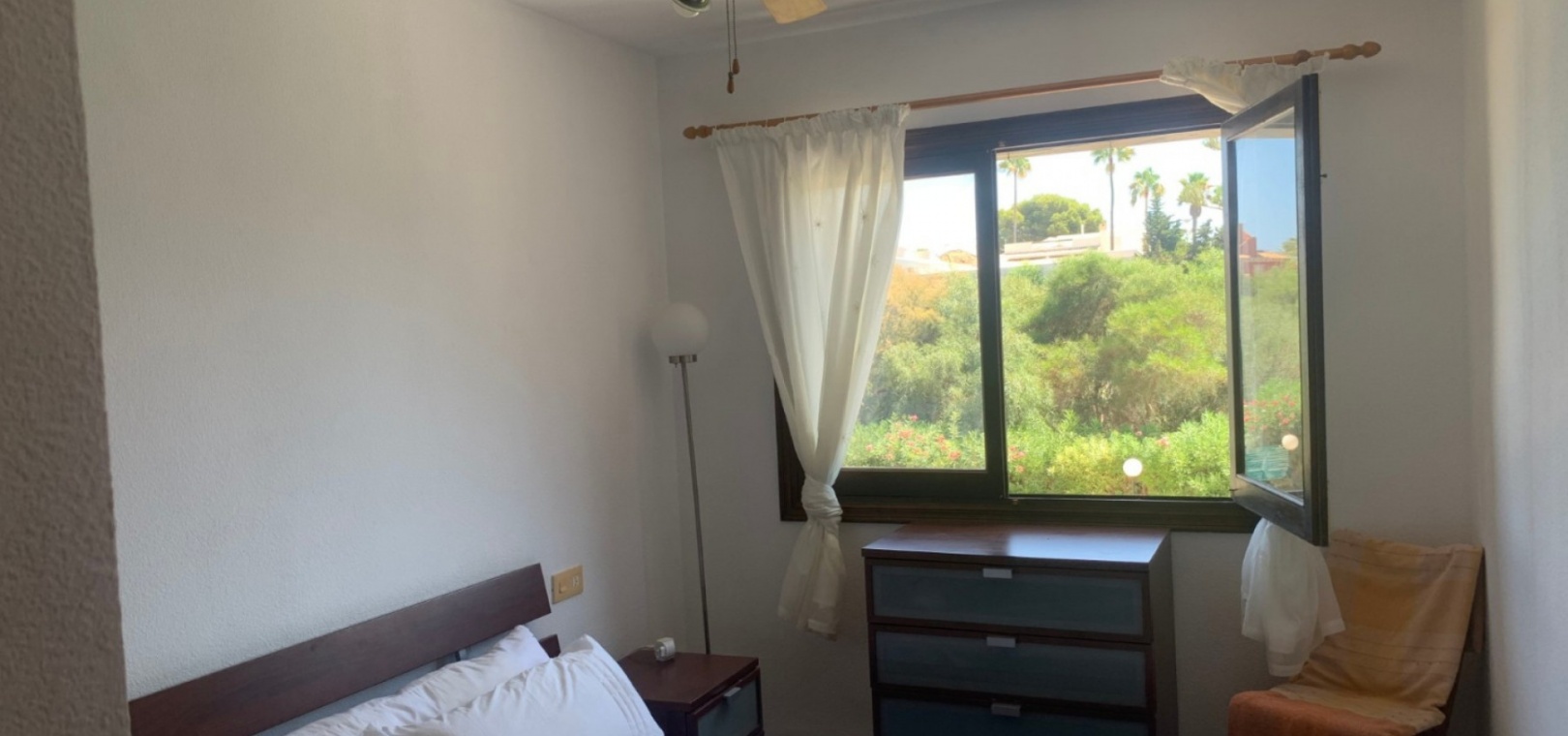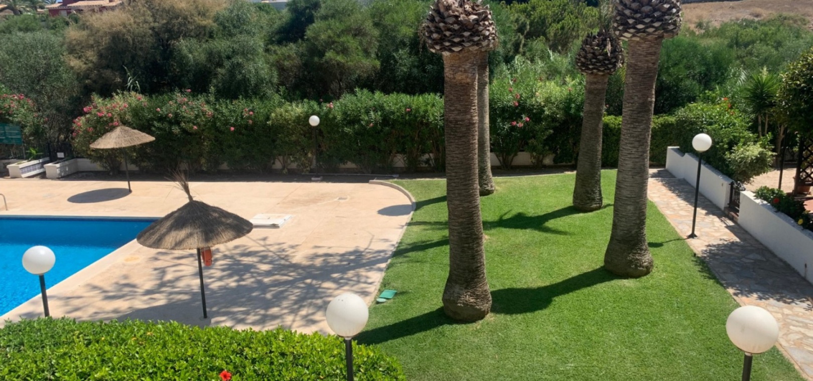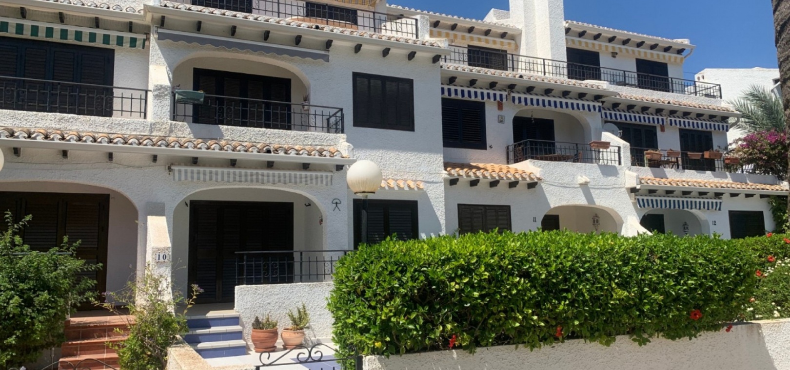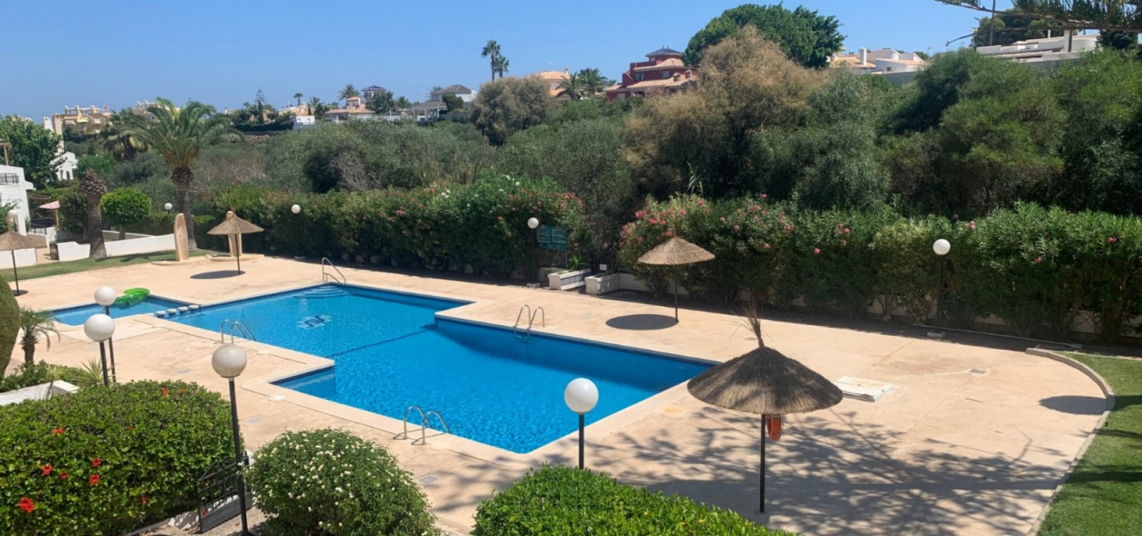 A South facing 2 bed 1 bath 1st floor apartment over looking the communal swimming pool located in Res. Sol y Verde II, Cabo Roig, Costa Blanca.