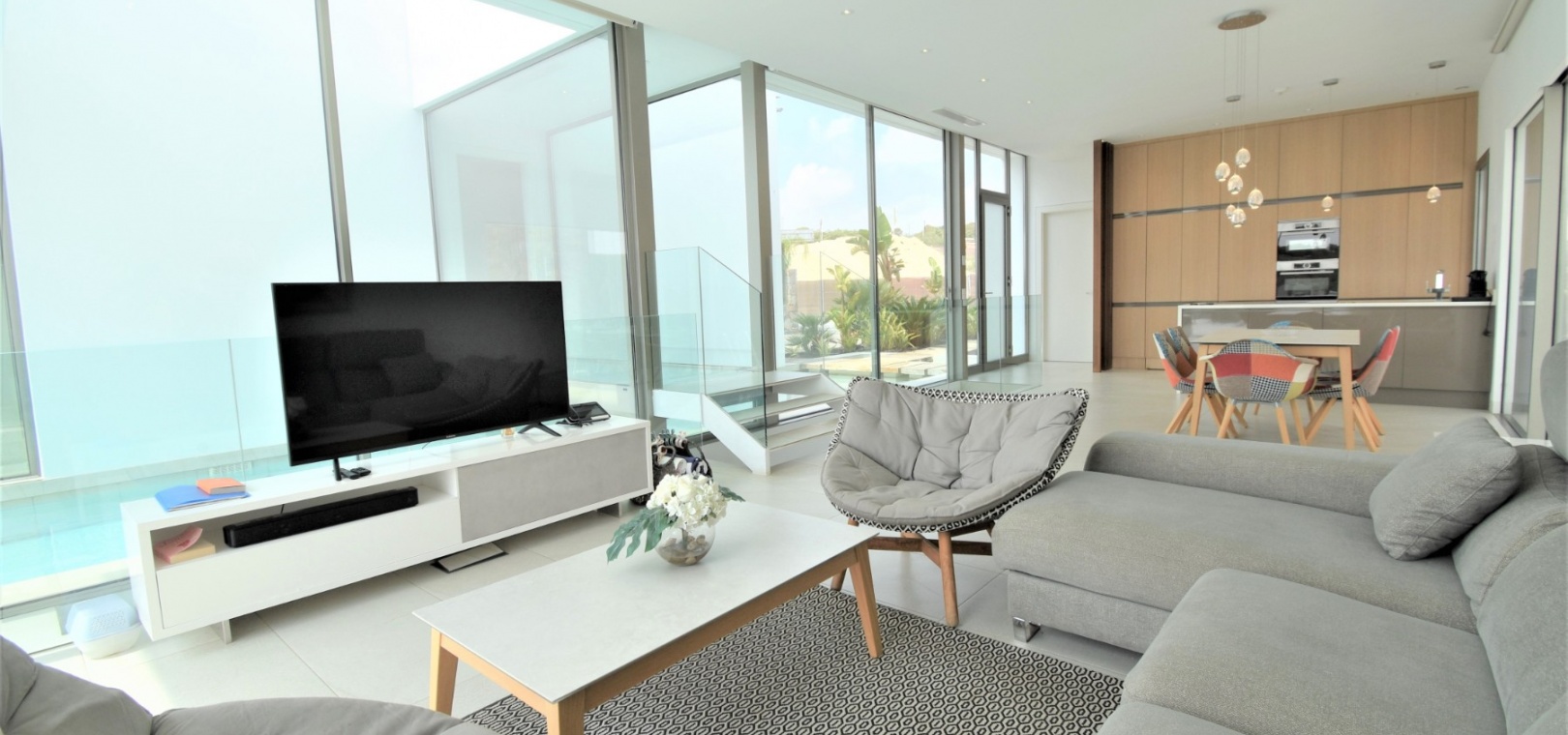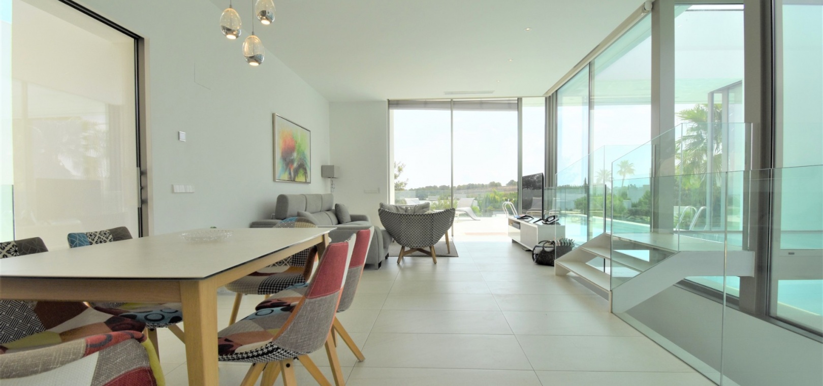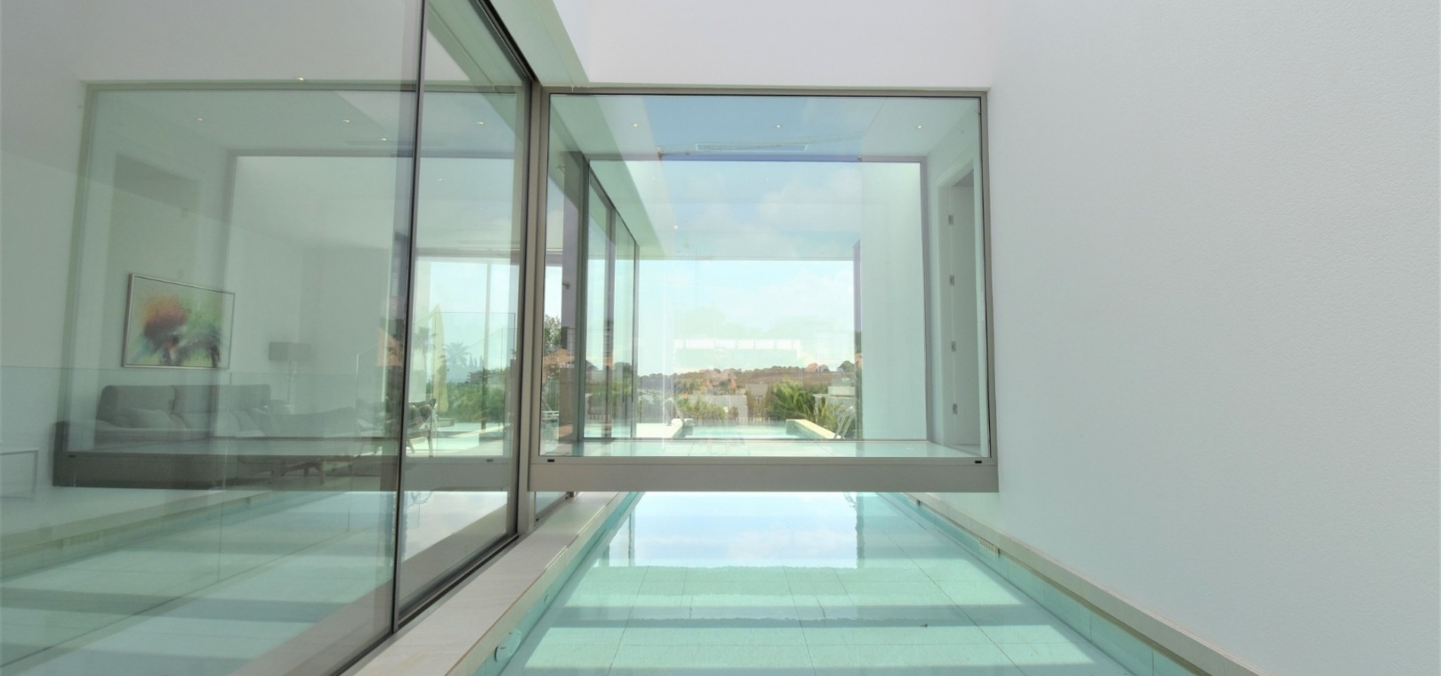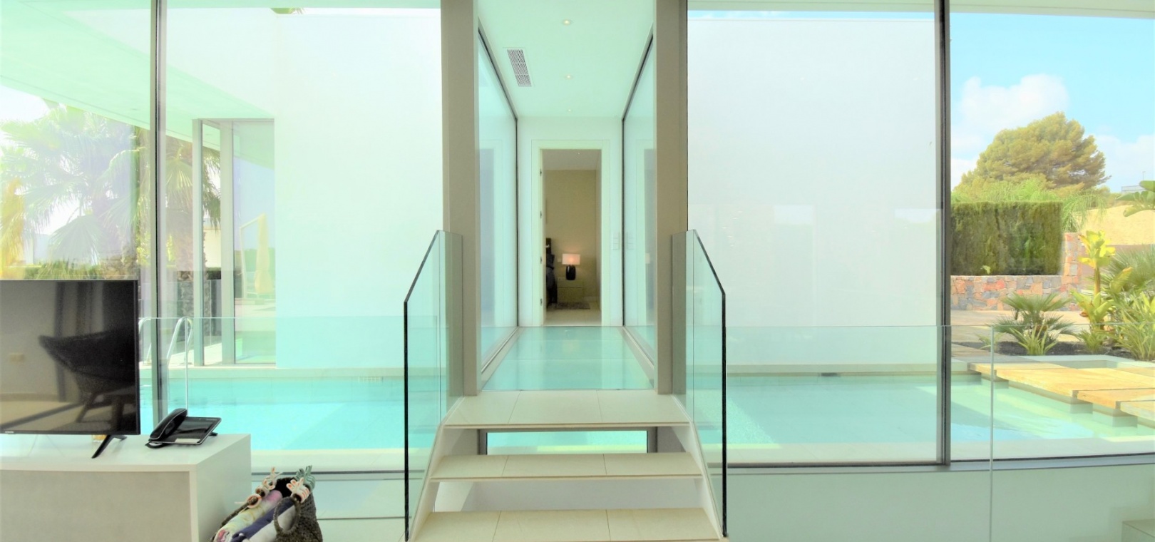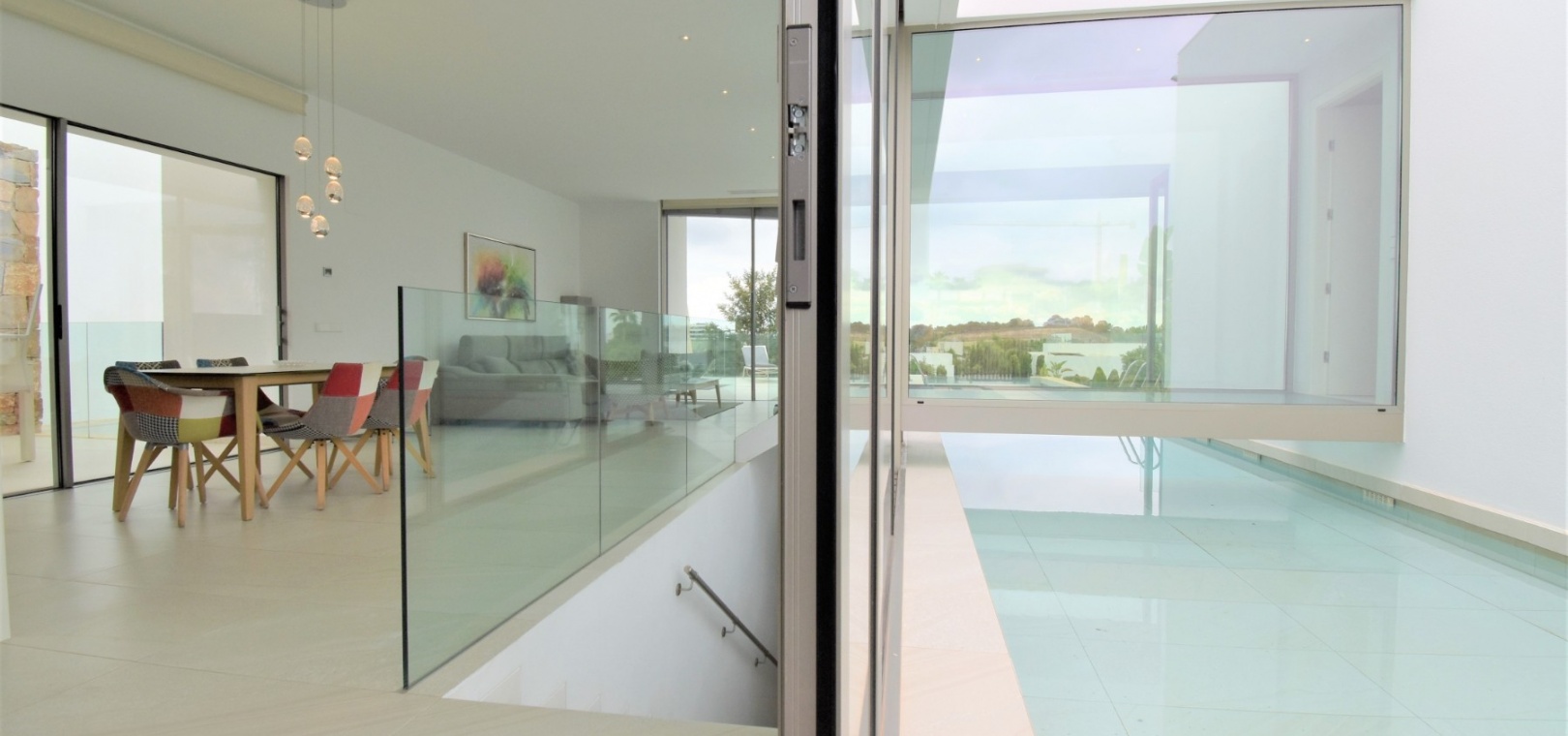 This Absolutely Stunning, Three Bedroom Luxury Detached Villa in Las Colinas Golf Resort is located on a beautiful & prestigious 5* Resort, voted number 1 in the whole of Spain. On the golf course itself is the clubhouse, restaurants, bar and supermarket! Situated 5 minutes drive to the shops, plus other bars and restaurants in the nearby town of San Miguel de Salinas, and just 10 minutes drive or so to the beaches of the Orihuela Costa. This Mesmeric Property of some 248m2 Build Size comprises on the ground floor of an open plan fully fitted kitchen, with peninsula type island and door to the side garden/terrace; extremely spacious lounge/dining room with lots of glass, benefiting from the desirable view to the swimming pool, which goes directly through the centre of this property, with internal walkway bridge; from the living room is sliding door access out to the terrace, with ample space to dine and relax outdoors, overlooking the infinity swimming pool with feature glass wall and with views across the surrounding community, to the distant sea views; and one double bedroom, the master bedroom, with en suite (shower & Jacuzzi bath) + access out to the main terrace. Internal stairs then lead down to the under build, comprising of a large hallway; second living area or an ideal space for a games room; a further two double bedrooms, with direct access out to the beautiful, grassed, private gardens on this level; a family shower room; and a cloakroom. The front of the property has a truly desirable entrance way with desirable access and ample off road parking. Extras are to include fitted wardrobes, air conditioning throughout, irrigation system, CCTV, electric window shutters, solar panels and more... Simply Amazing!
