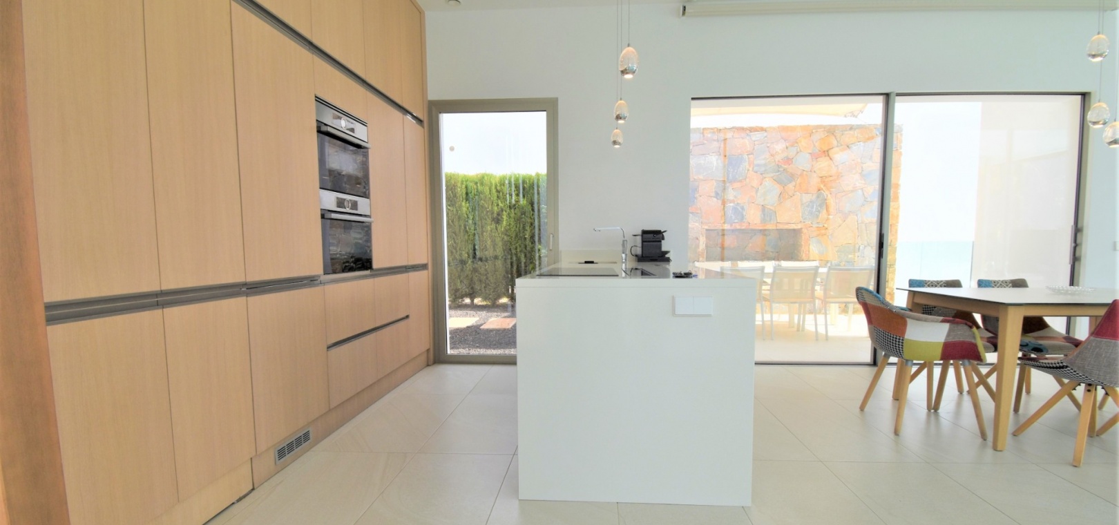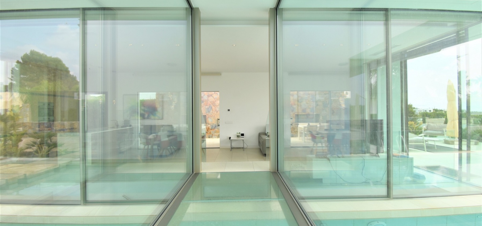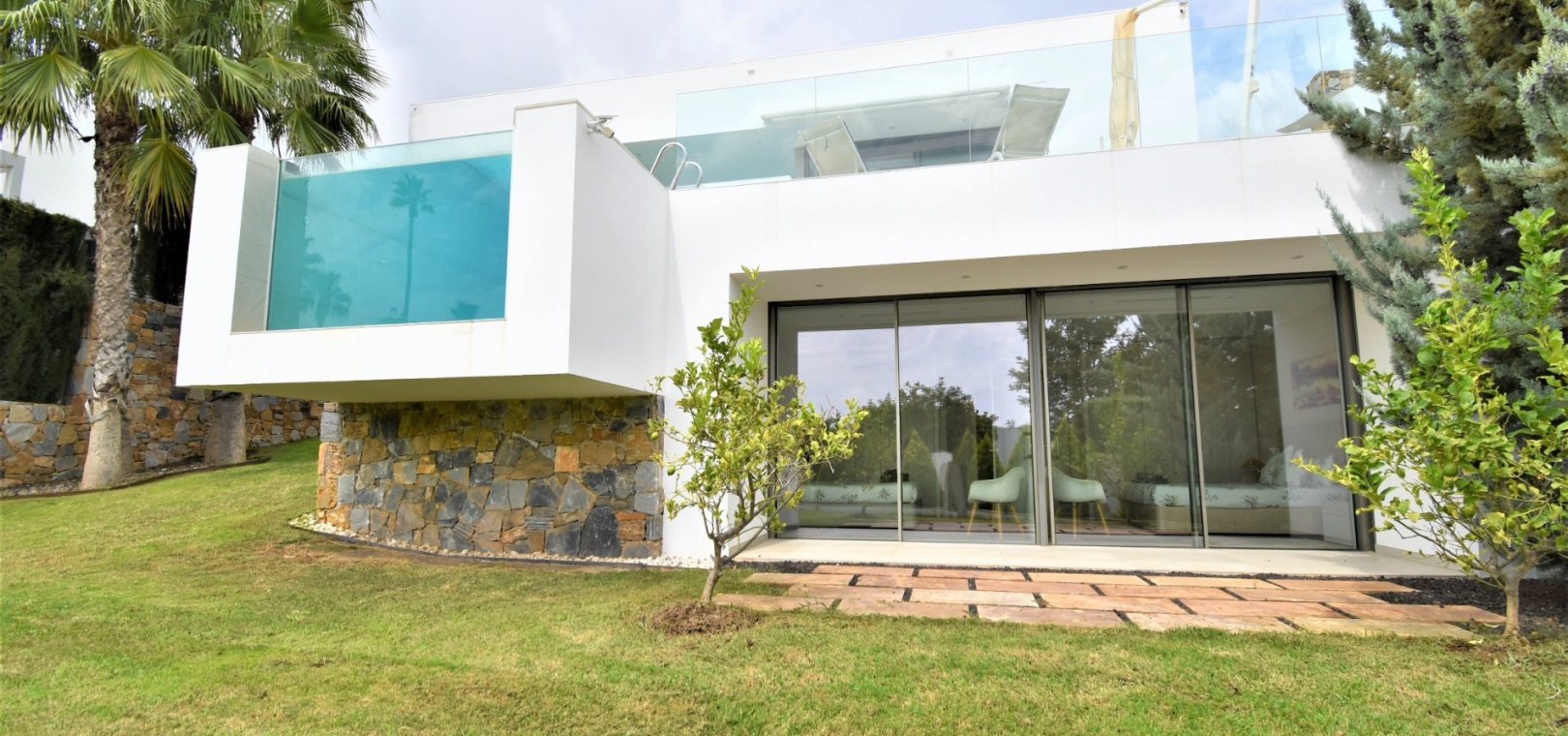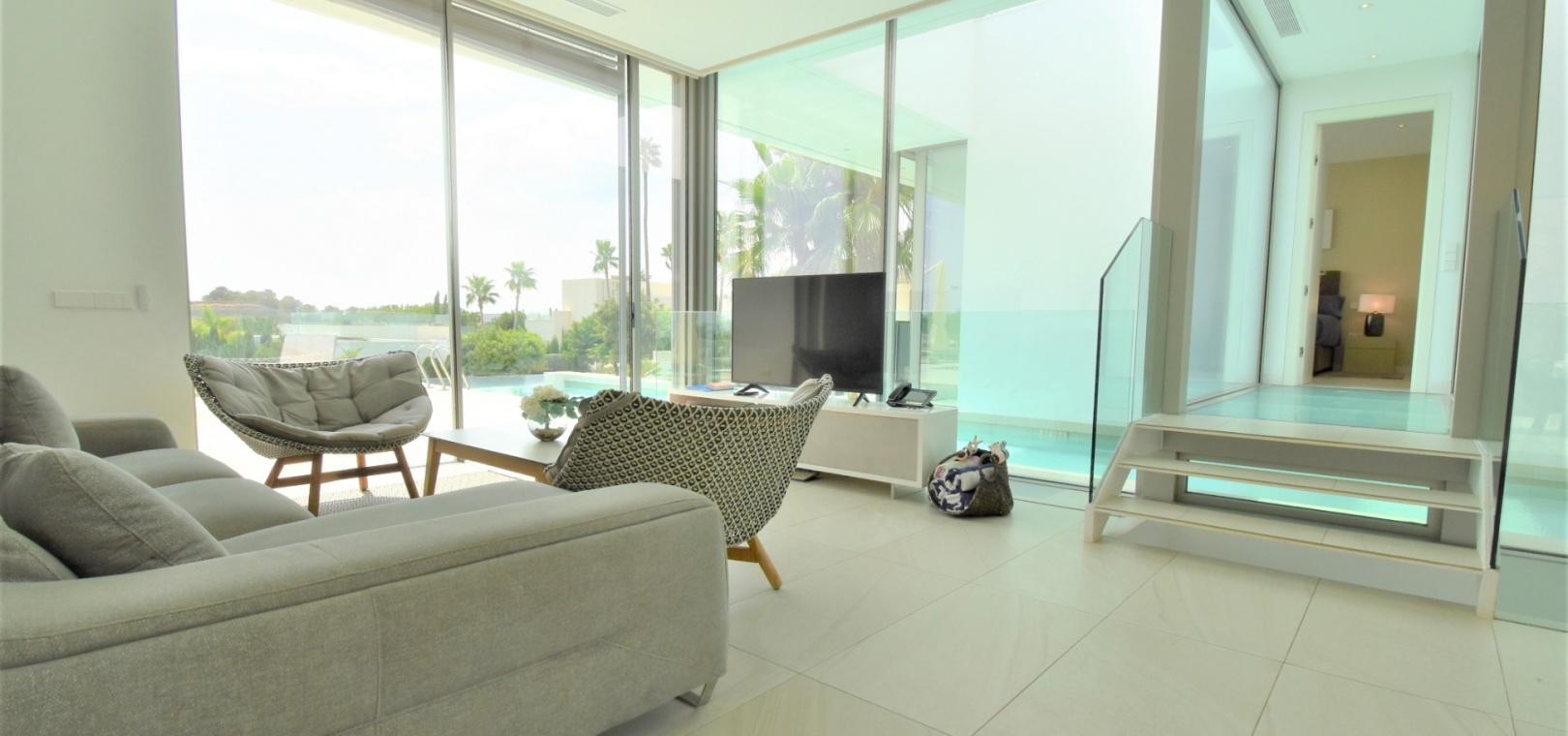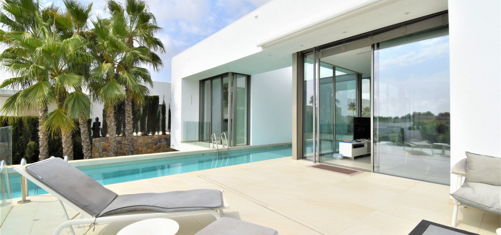 This Absolutely Stunning, Three Bedroom Luxury Detached Villa in Las Colinas Golf Resort is located on a beautiful & prestigious 5* Resort, voted number 1 in the whole of Spain. On the golf course itself is the clubhouse, restaurants, bar and supermarket! Situated 5 minutes drive to the shops, plus other bars and restaurants in the nearby town of San Miguel de Salinas, and just 10 minutes drive or so to the beaches of the Orihuela Costa. This Mesmeric Property of some 248m2 Build Size comprises on the ground floor of an open plan fully fitted kitchen, with peninsula type island and door to the side garden/terrace; extremely spacious lounge/dining room with lots of glass, benefiting from the desirable view to the swimming pool, which goes directly through the centre of this property, with internal walkway bridge; from the living room is sliding door access out to the terrace, with ample space to dine and relax outdoors, overlooking the infinity swimming pool with feature glass wall and with views across the surrounding community, to the distant sea views; and one double bedroom, the master bedroom, with en suite (shower & Jacuzzi bath) + access out to the main terrace. Internal stairs then lead down to the under build, comprising of a large hallway; second living area or an ideal space for a games room; a further two double bedrooms, with direct access out to the beautiful, grassed, private gardens on this level; a family shower room; and a cloakroom. The front of the property has a truly desirable entrance way with desirable access and ample off road parking. Extras are to include fitted wardrobes, air conditioning throughout, irrigation system, CCTV, electric window shutters, solar panels and more... Simply Amazing!