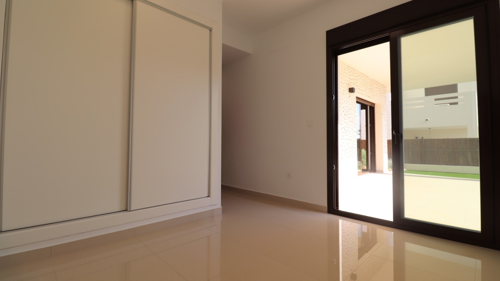 A South East Facing, Nearly New, Two Bedroom, Ground Floor Apartment in La Finca Golf, a 5* Hotel, Spa and golf resort, located just a 4-5 minute drive to various popular restaurants, bistro, bars, shops, located at the entrance to the resort. The nearest village is Algorfa, with the major town of Almoradí just a 5 minute drive and Benijofar and Quesada 10 minutes. The coast can be reached in 15-20 minutes. The apartment is just 12 months old and located within a secure gated community so offers all the “new build” qualities and comprises: spacious covered terrace area; open plan living area with dual aspect double sliding doors leading out to the garden; fitted kitchen area; two double bedrooms with built-in wardrobes, master with access out to the garden and an en suite shower room; further modern family shower room. The property occupies a fantastic 224m2 landscaped plot, which has been pebbled and laid with artificial grass, with planted border. The stunning modern designed communal pool area is located in front of the property and extras include pre-installed air conditioning, electric blinds, CCTV, irrigation system.