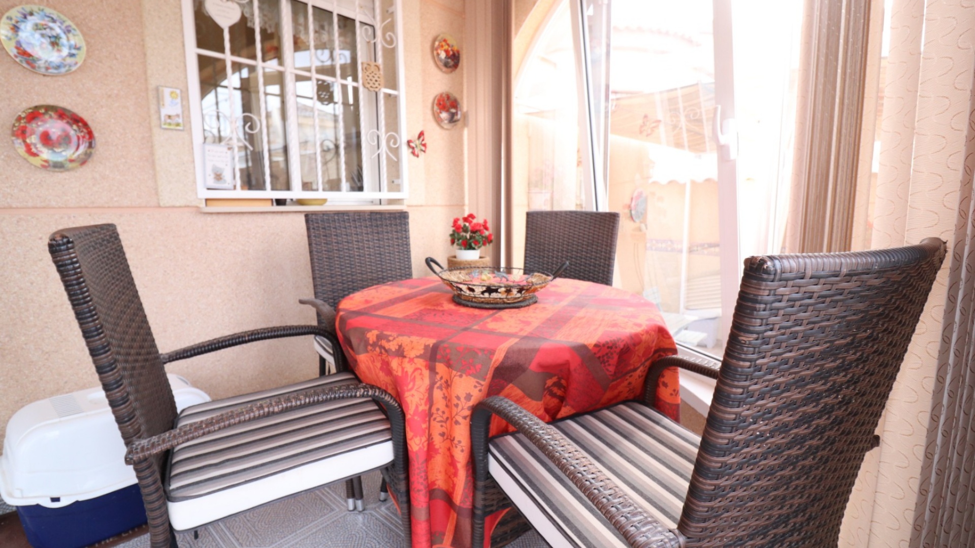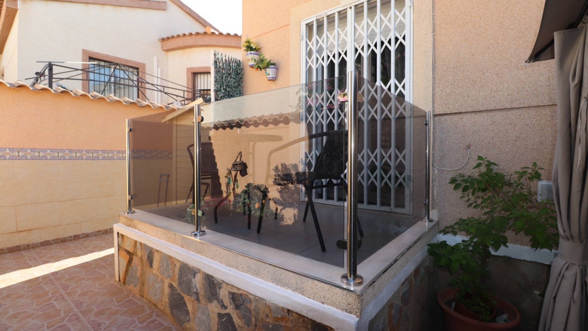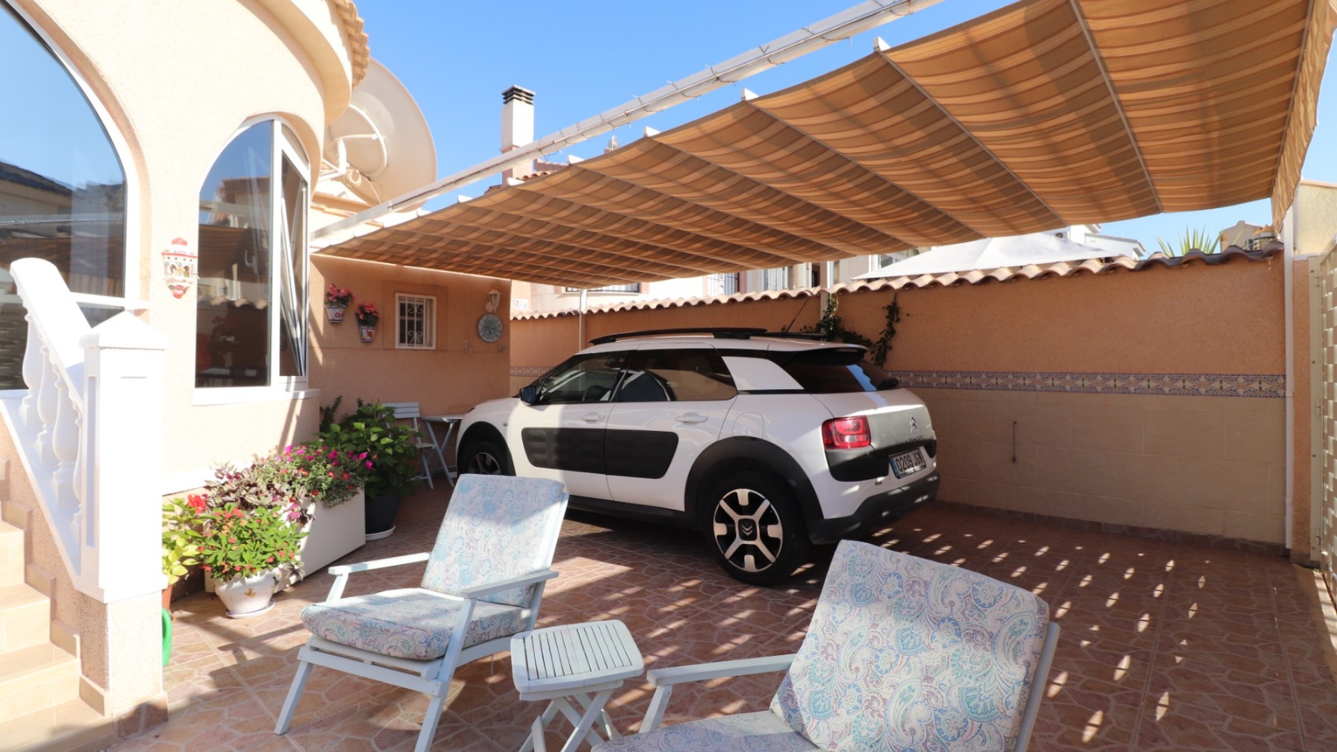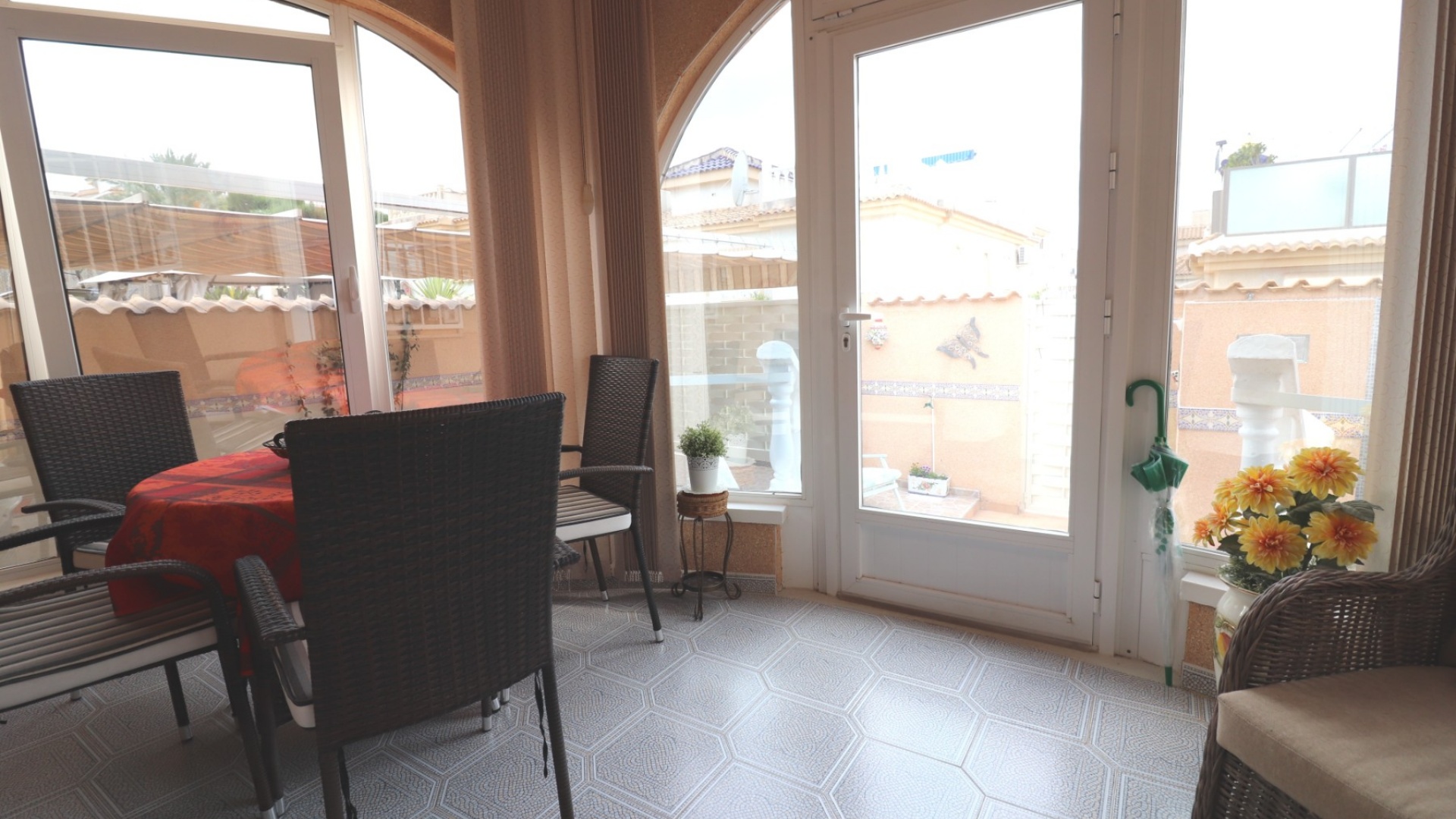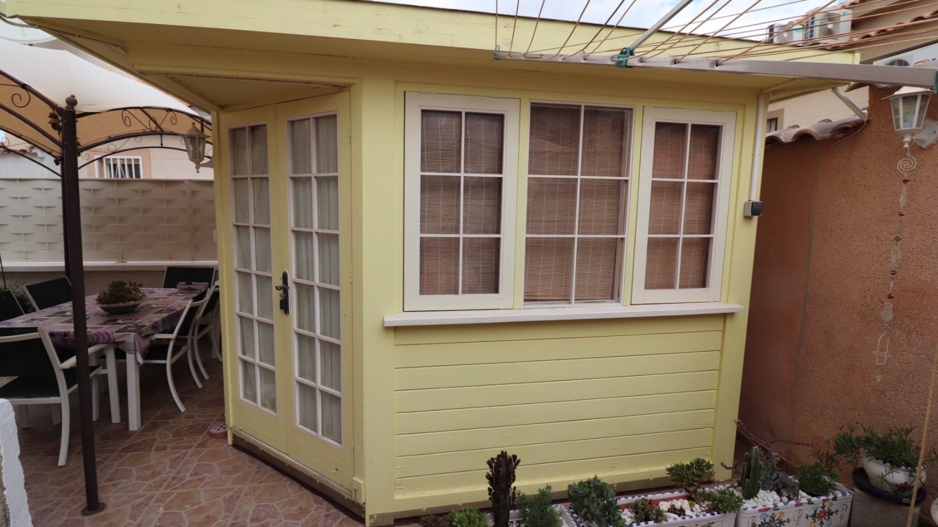 This West Facing, Two Bedroom, Detached Villa in Benimar II, is located just a 5 minute walk to the Benimar commercial centre, which includes Mcdonalds, a great variety of eating places, shops, veterinary centre and supermarket. The main town centre is just a further 5 minutes away. La Marquesa golf course at Rojales is just 5 minutes by car and the beach at Guardamar is approximately 10 minutes away. This one storey property has been well maintained by the current owners and is accessed via a circular glazed in terrace, perfect as a “winter” relax area overlooking the private pool. The living area of a very comfortable size benefitting from lots of light has a feature log burner fireplace, air conditioning unit and double opening doors out to a terrace area; American style fitted kitchen; separate utility room; two double bedrooms with built-in wardrobes, master with air con unit, access to a terrace and an en suite shower room; further family shower room. The garden is tiled for easy maintenance with some planted borders, private pool, off road parking with car port. Extras include irrigation system, “summer house” style wooden shed.