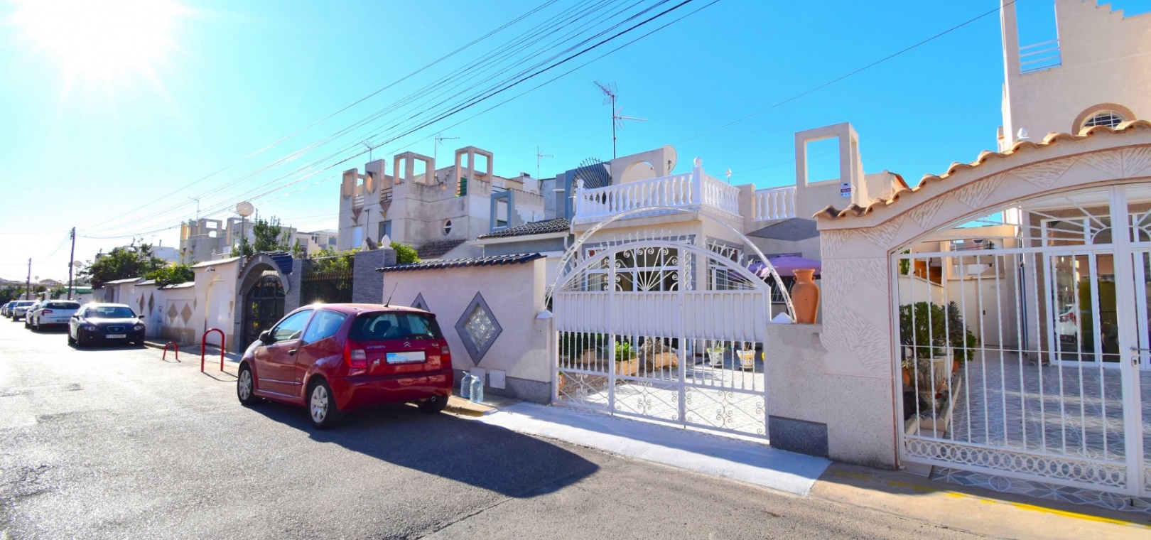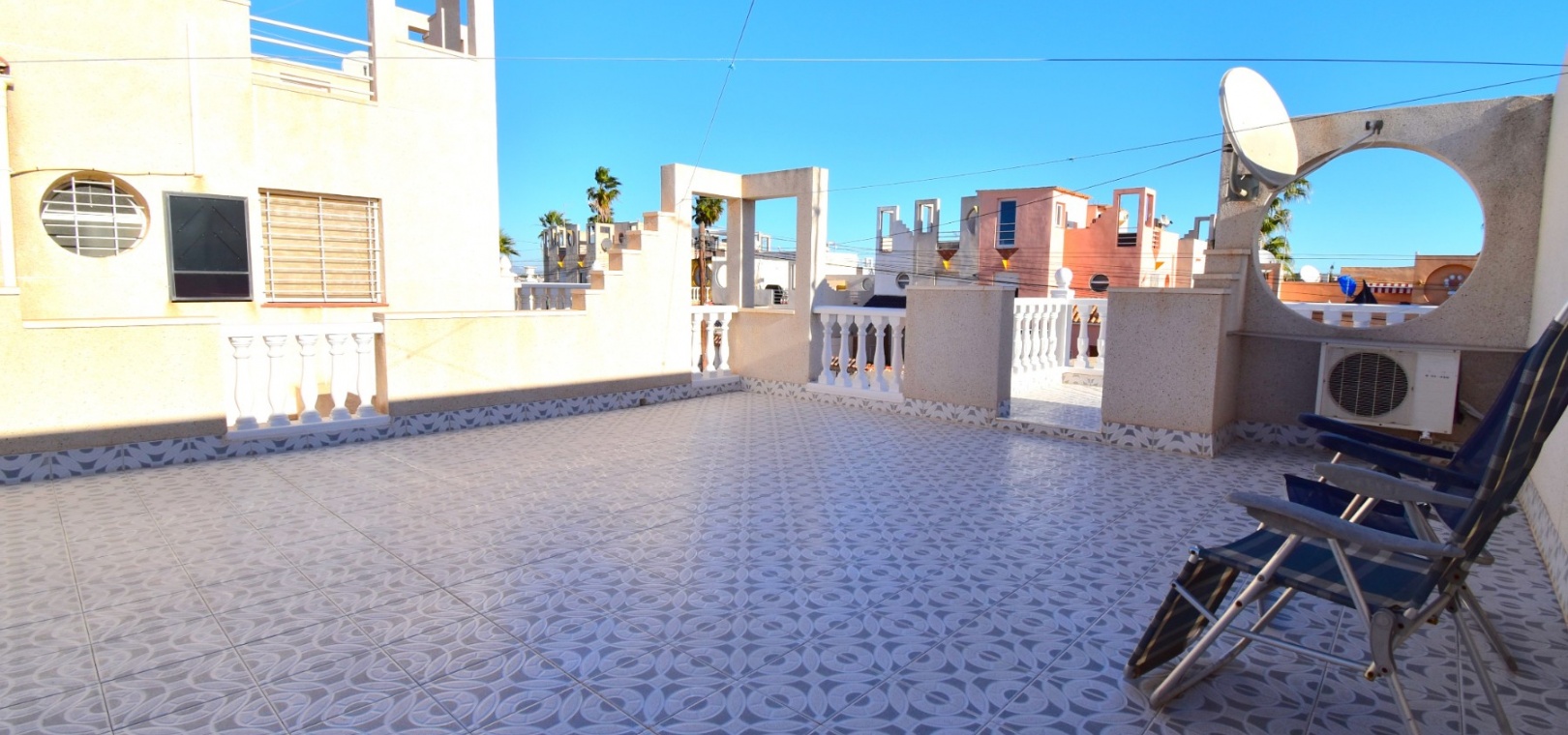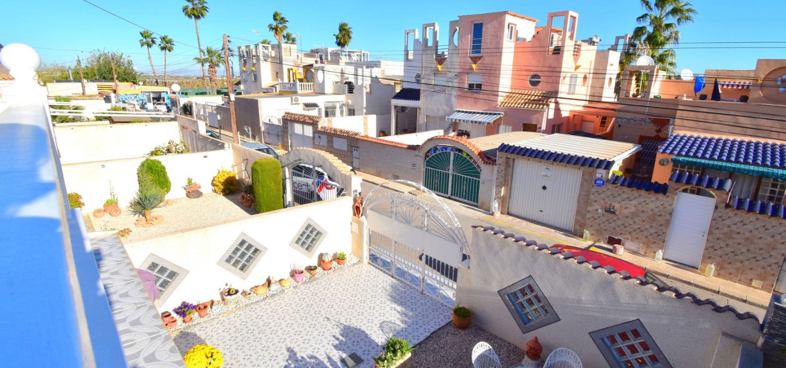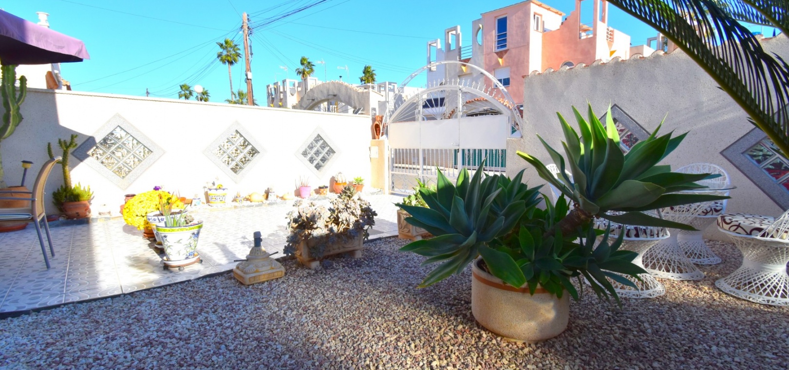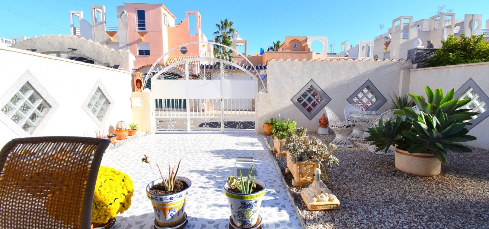An East Facing, Two Bedroom, Quad Villa in El Salado, a residential area located right on the edge of the natural salt lake. Five minutes drive to Carrefour Supermarket, McDonalds and Habaneras Shopping Centre, cinema, with the main town of Torrevieja just on from there, with a variety of beaches on offer along with its lovely promenade. The property, all on one level is accessed via a super glazed in terrace which leads into the living area; triangle arched open fitted kitchen with breakfast bar and a door leading into the enclosed utility area; two double bedrooms with ceiling fans, master with built-in wardrobes; family shower room with walk in shower. External stairs lead up to the private roof top solarium. The front garden has high boundary walls, providing decent privacy, tiled car access, the rest being pebbled. There are no community fees to pay, but there is a pool and bar just 50m from the property, which is only 3€ per day.