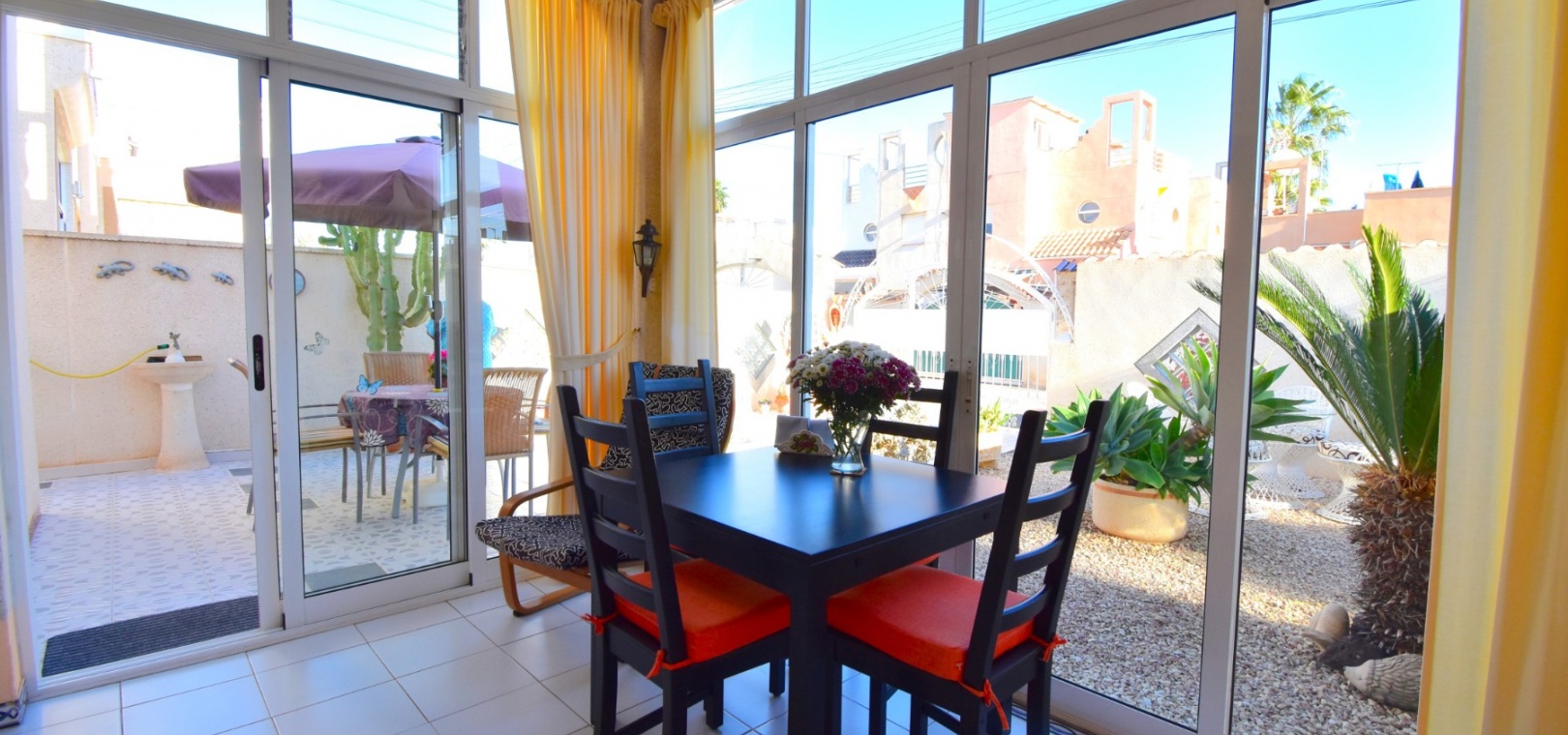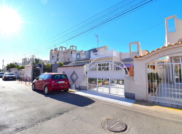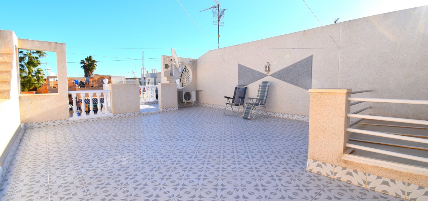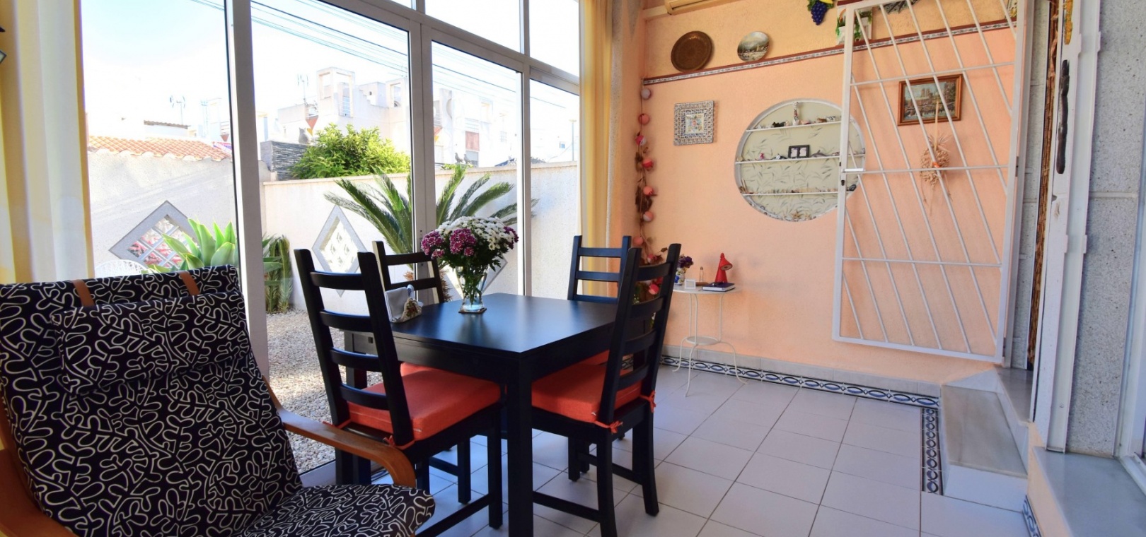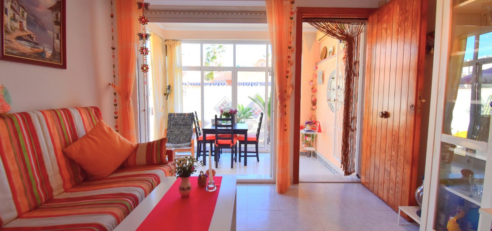 An East Facing, Two Bedroom, Quad Villa in El Salado, a residential area located right on the edge of the natural salt lake. Five minutes drive to Carrefour Supermarket, McDonalds and Habaneras Shopping Centre, cinema, with the main town of Torrevieja just on from there, with a variety of beaches on offer along with its lovely promenade. The property, all on one level is accessed via a super glazed in terrace which leads into the living area; triangle arched open fitted kitchen with breakfast bar and a door leading into the enclosed utility area; two double bedrooms with ceiling fans, master with built-in wardrobes; family shower room with walk in shower. External stairs lead up to the private roof top solarium. The front garden has high boundary walls, providing decent privacy, tiled car access, the rest being pebbled. There are no community fees to pay, but there is a pool and bar just 50m from the property, which is only 3€ per day.
