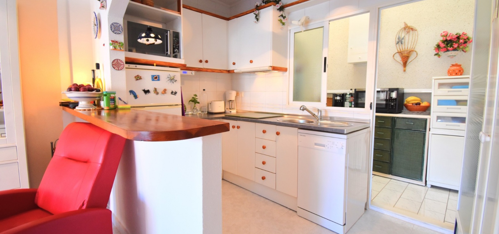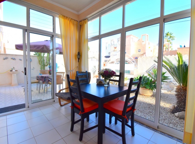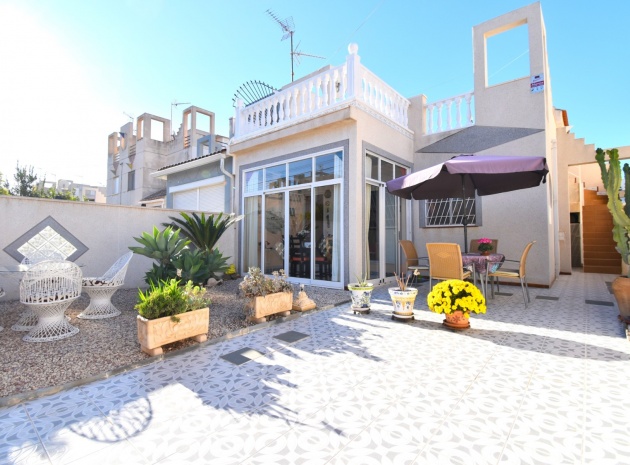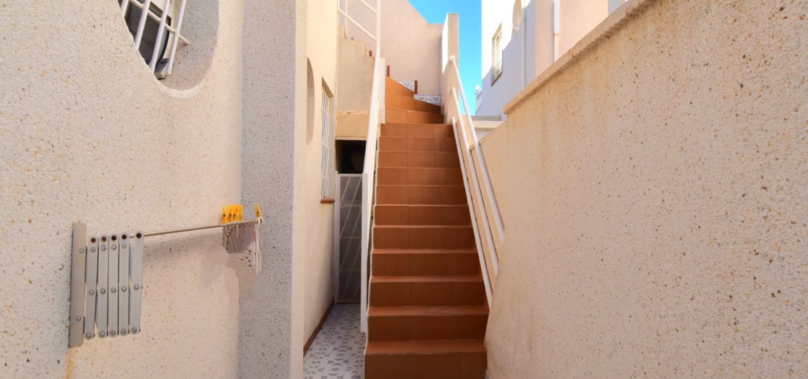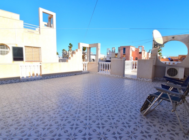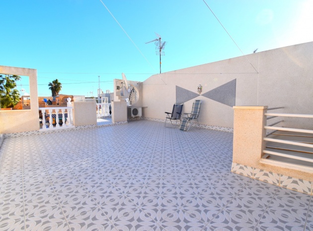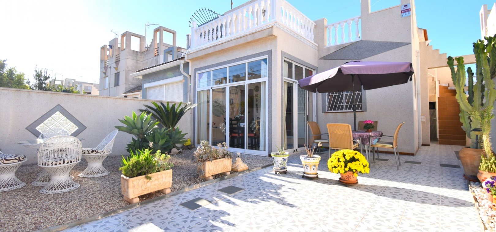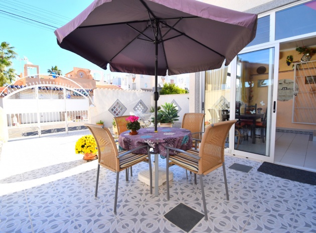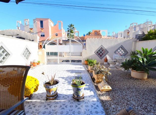 An East Facing, Two Bedroom, Quad Villa in El Salado, a residential area located right on the edge of the natural salt lake. Five minutes drive to Carrefour Supermarket, McDonalds and Habaneras Shopping Centre, cinema, with the main town of Torrevieja just on from there, with a variety of beaches on offer along with its lovely promenade. The property, all on one level is accessed via a super glazed in terrace which leads into the living area; triangle arched open fitted kitchen with breakfast bar and a door leading into the enclosed utility area; two double bedrooms with ceiling fans, master with built-in wardrobes; family shower room with walk in shower. External stairs lead up to the private roof top solarium. The front garden has high boundary walls, providing decent privacy, tiled car access, the rest being pebbled. There are no community fees to pay, but there is a pool and bar just 50m from the property, which is only 3€ per day.