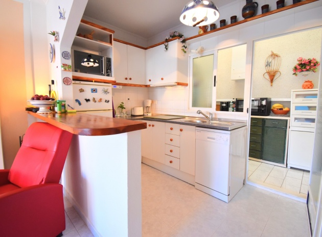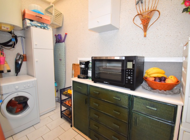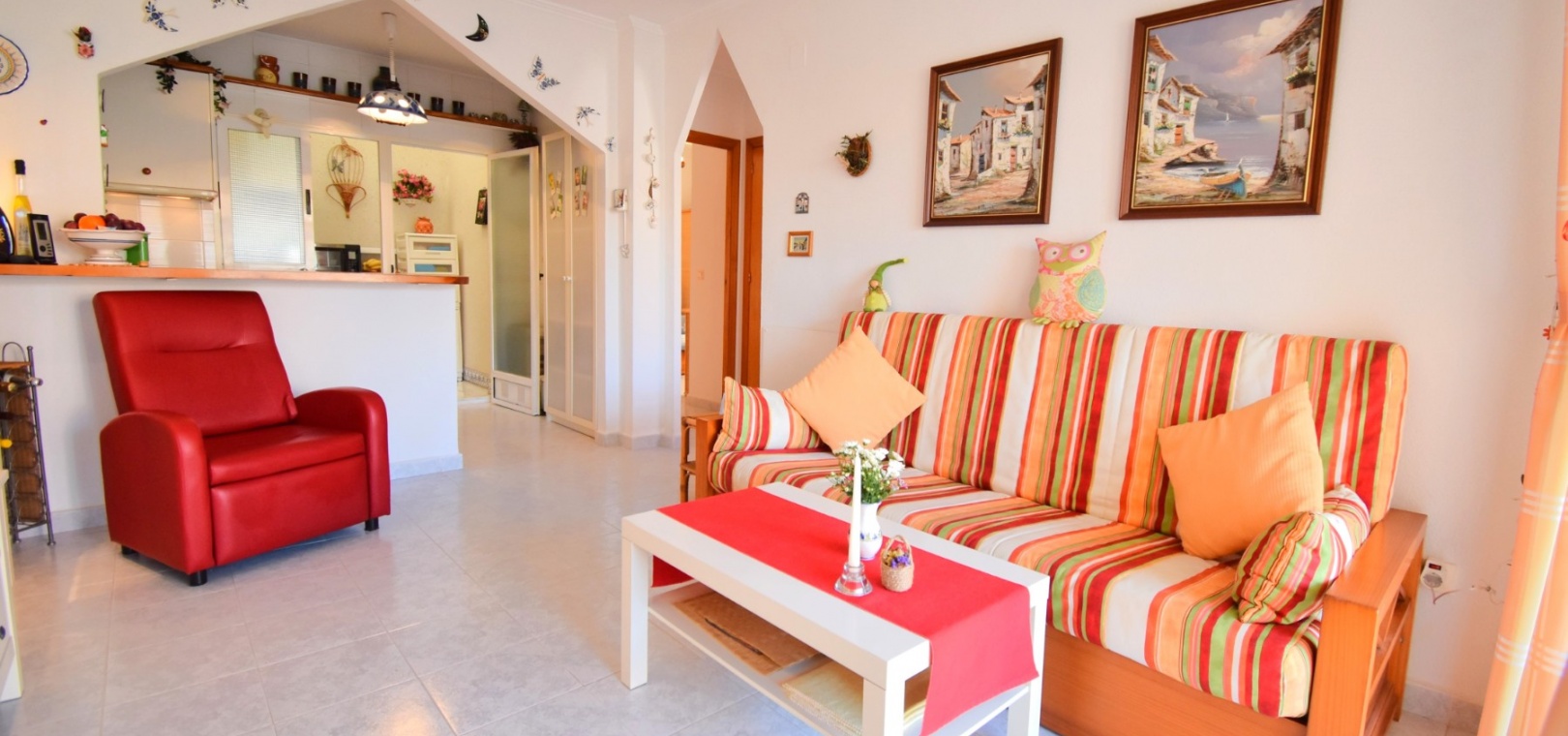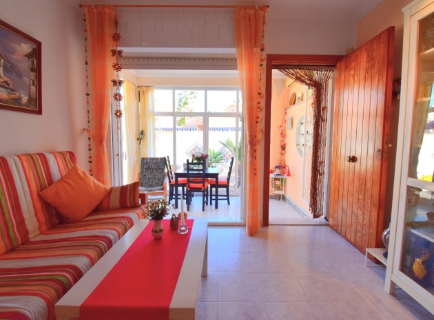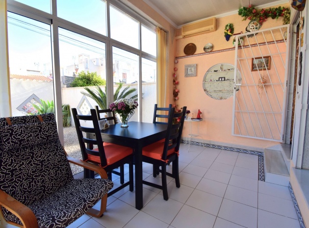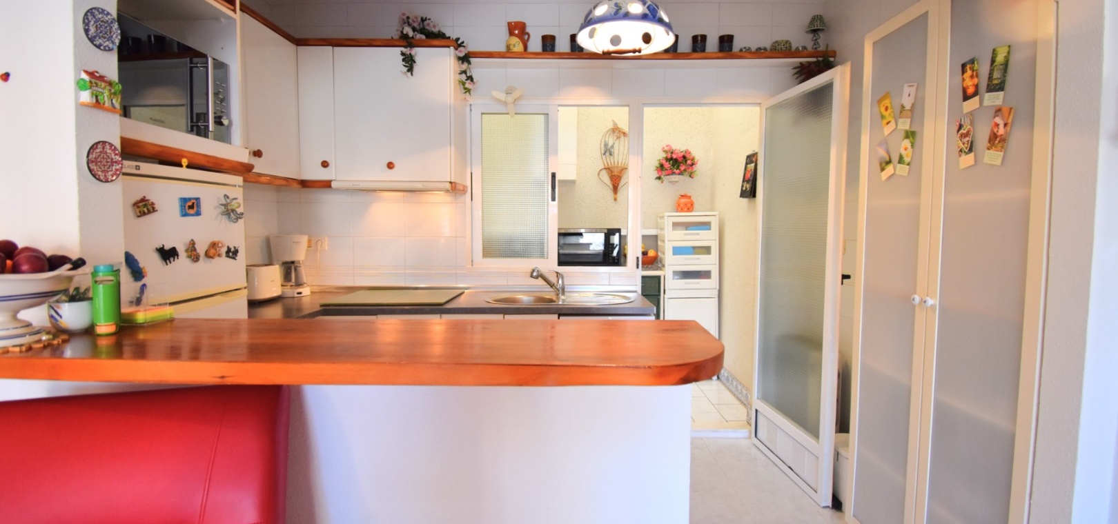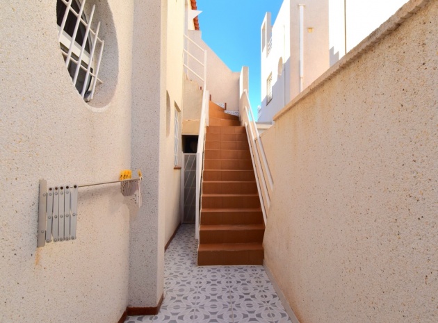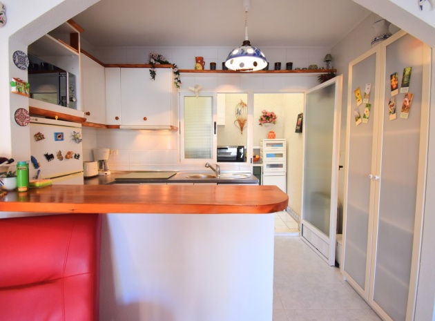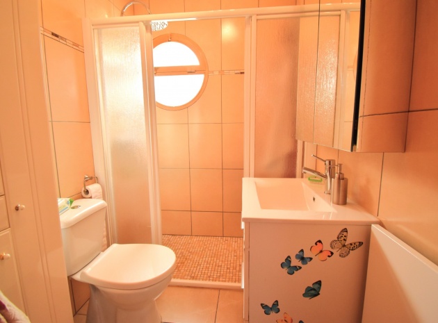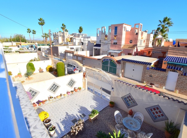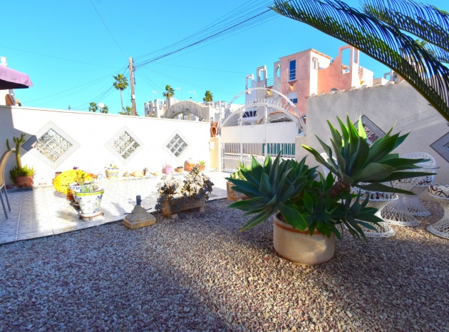 An East Facing, Two Bedroom, Quad Villa in El Salado, a residential area located right on the edge of the natural salt lake. Five minutes drive to Carrefour Supermarket, McDonalds and Habaneras Shopping Centre, cinema, with the main town of Torrevieja just on from there, with a variety of beaches on offer along with its lovely promenade. The property, all on one level is accessed via a super glazed in terrace which leads into the living area; triangle arched open fitted kitchen with breakfast bar and a door leading into the enclosed utility area; two double bedrooms with ceiling fans, master with built-in wardrobes; family shower room with walk in shower. External stairs lead up to the private roof top solarium. The front garden has high boundary walls, providing decent privacy, tiled car access, the rest being pebbled. There are no community fees to pay, but there is a pool and bar just 50m from the property, which is only 3€ per day.