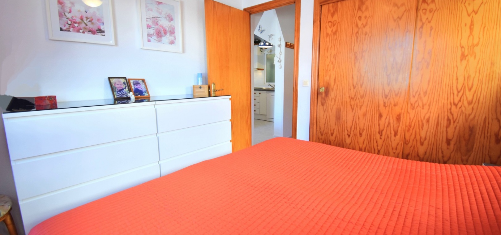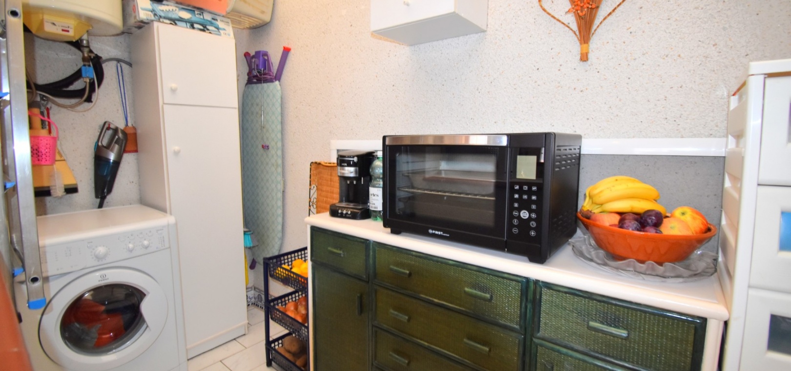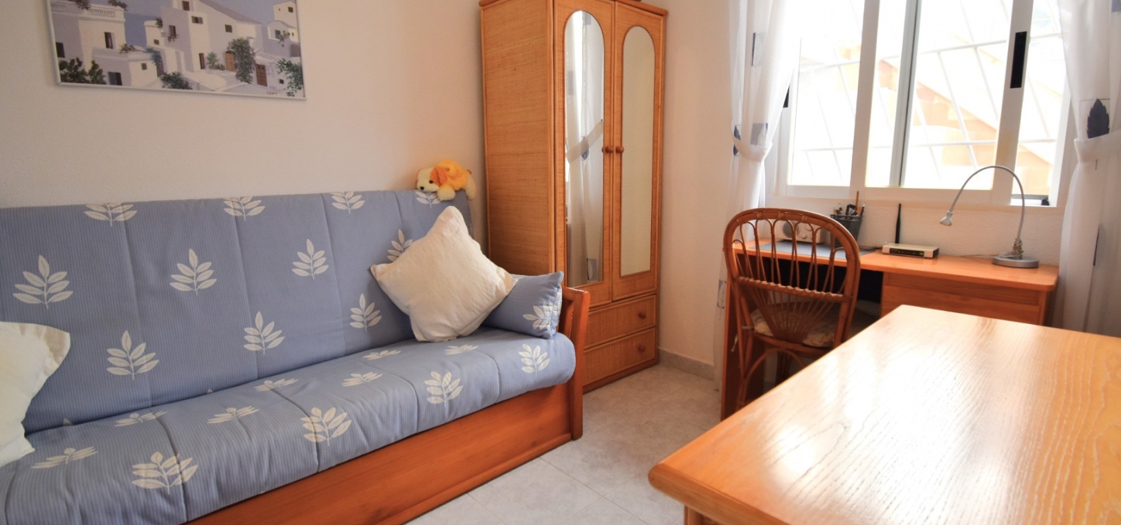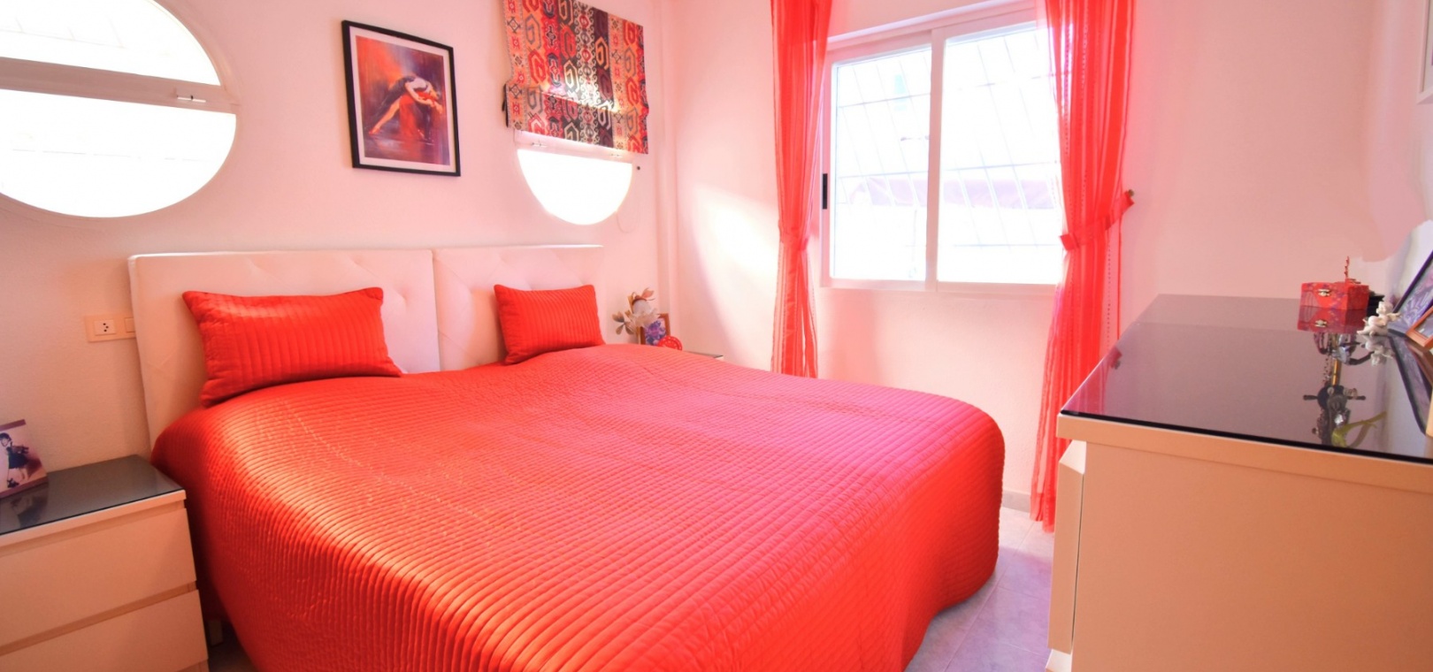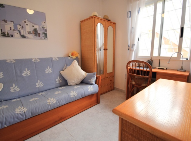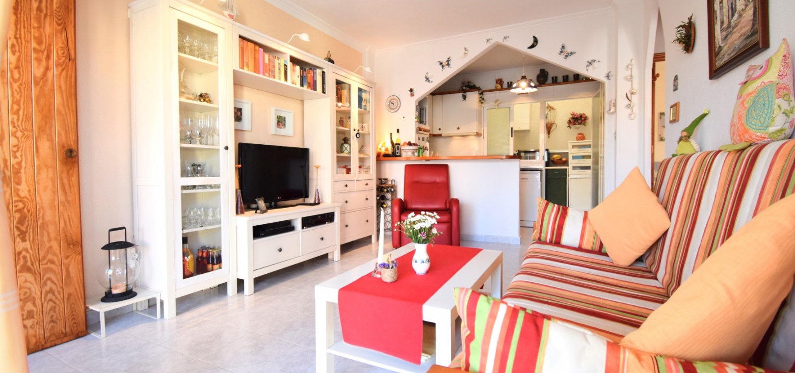 An East Facing, Two Bedroom, Quad Villa in El Salado, a residential area located right on the edge of the natural salt lake. Five minutes drive to Carrefour Supermarket, McDonalds and Habaneras Shopping Centre, cinema, with the main town of Torrevieja just on from there, with a variety of beaches on offer along with its lovely promenade. The property, all on one level is accessed via a super glazed in terrace which leads into the living area; triangle arched open fitted kitchen with breakfast bar and a door leading into the enclosed utility area; two double bedrooms with ceiling fans, master with built-in wardrobes; family shower room with walk in shower. External stairs lead up to the private roof top solarium. The front garden has high boundary walls, providing decent privacy, tiled car access, the rest being pebbled. There are no community fees to pay, but there is a pool and bar just 50m from the property, which is only 3€ per day.