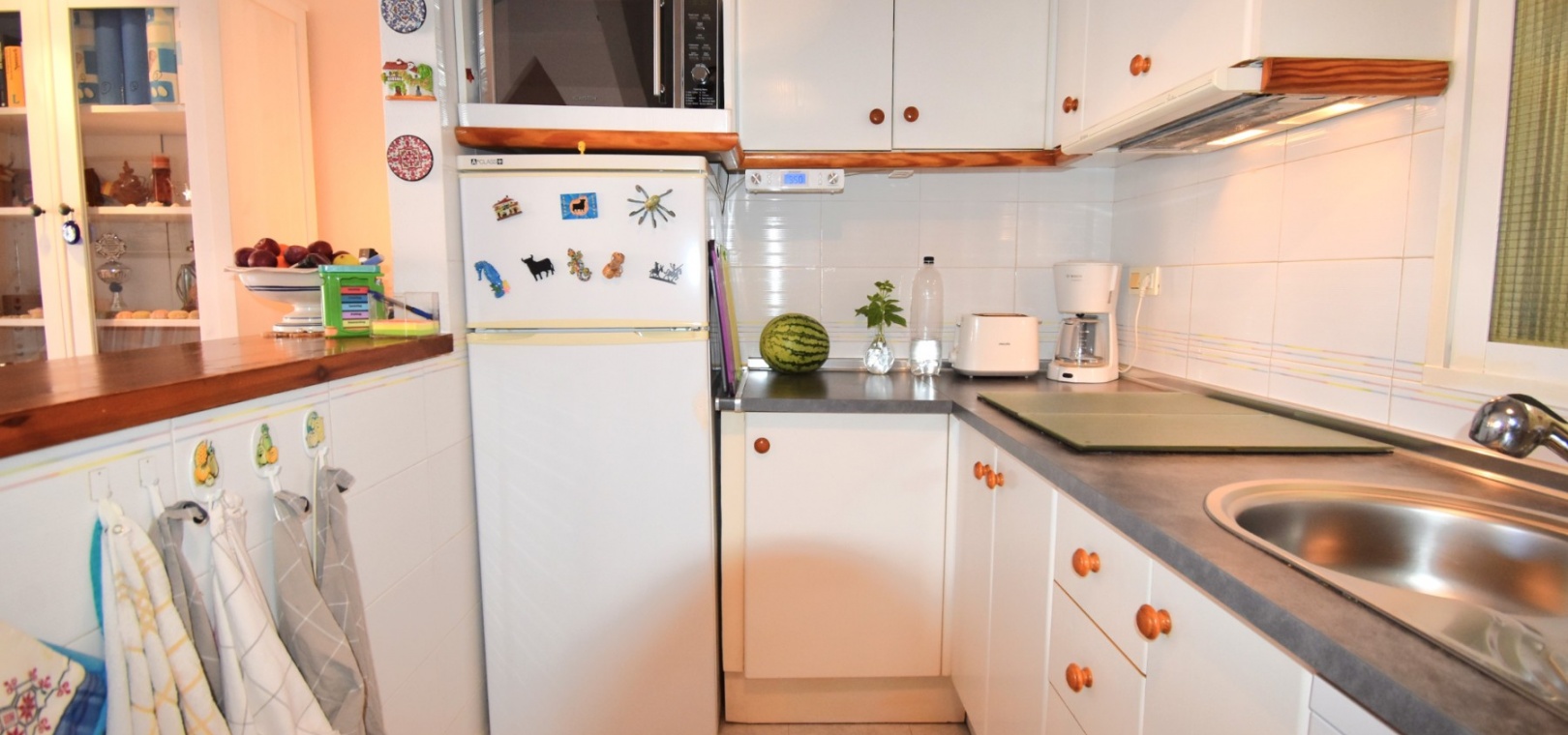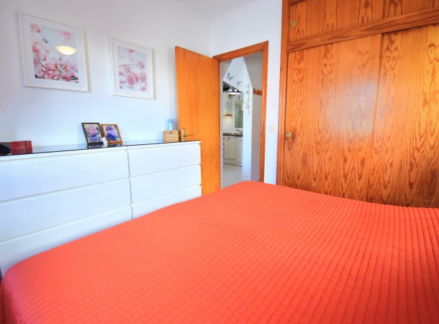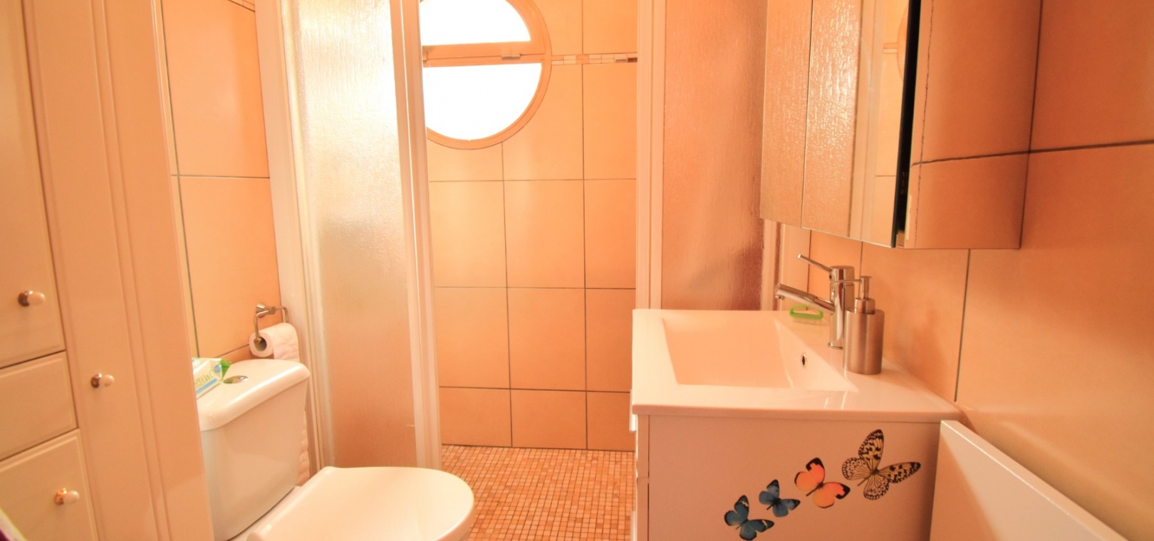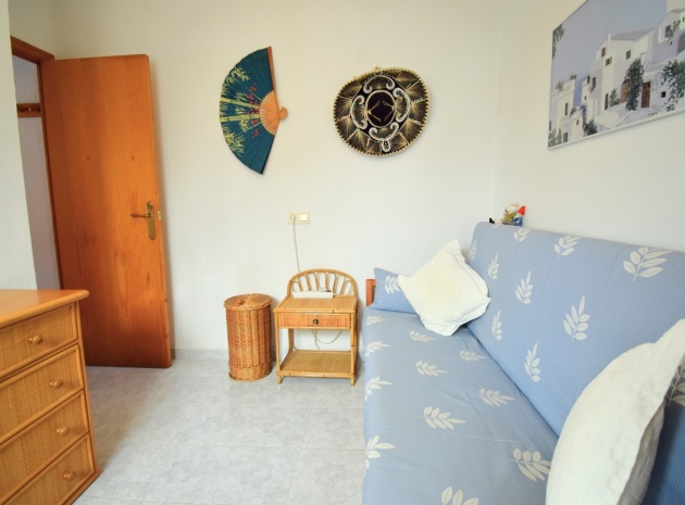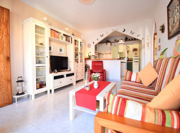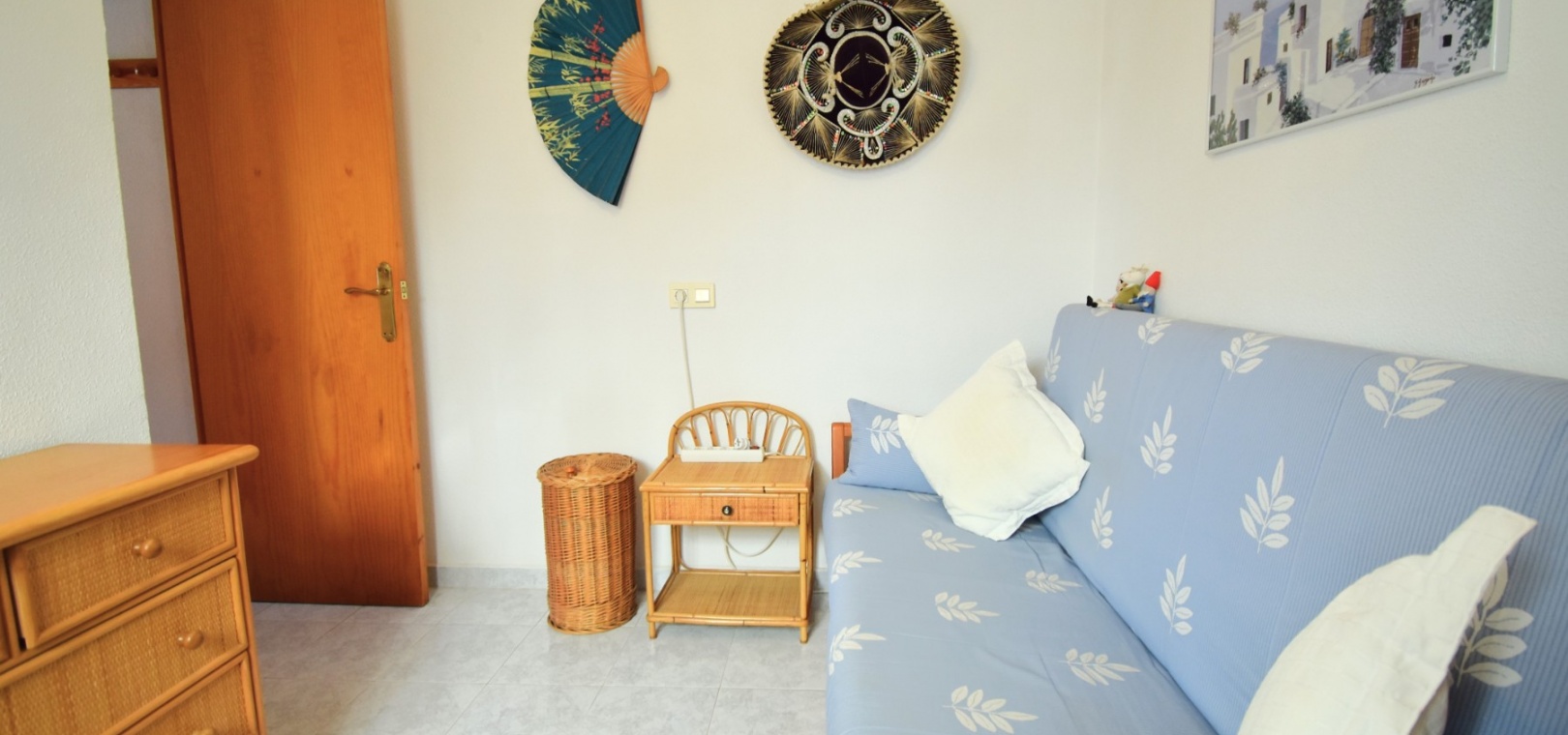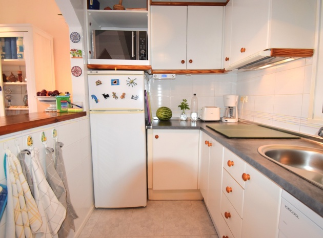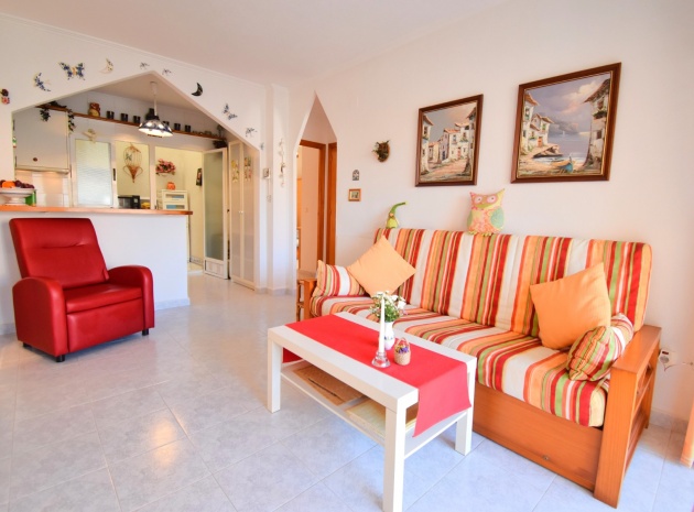 An East Facing, Two Bedroom, Quad Villa in El Salado, a residential area located right on the edge of the natural salt lake. Five minutes drive to Carrefour Supermarket, McDonalds and Habaneras Shopping Centre, cinema, with the main town of Torrevieja just on from there, with a variety of beaches on offer along with its lovely promenade. The property, all on one level is accessed via a super glazed in terrace which leads into the living area; triangle arched open fitted kitchen with breakfast bar and a door leading into the enclosed utility area; two double bedrooms with ceiling fans, master with built-in wardrobes; family shower room with walk in shower. External stairs lead up to the private roof top solarium. The front garden has high boundary walls, providing decent privacy, tiled car access, the rest being pebbled. There are no community fees to pay, but there is a pool and bar just 50m from the property, which is only 3€ per day.