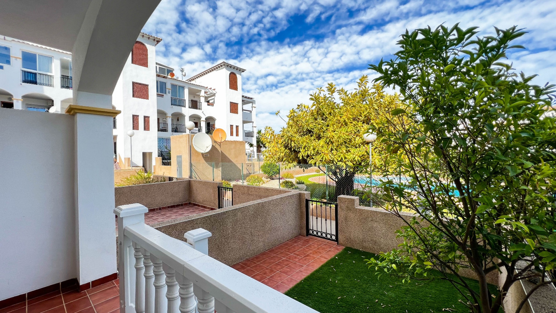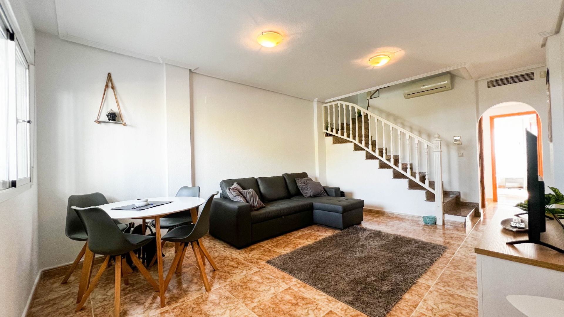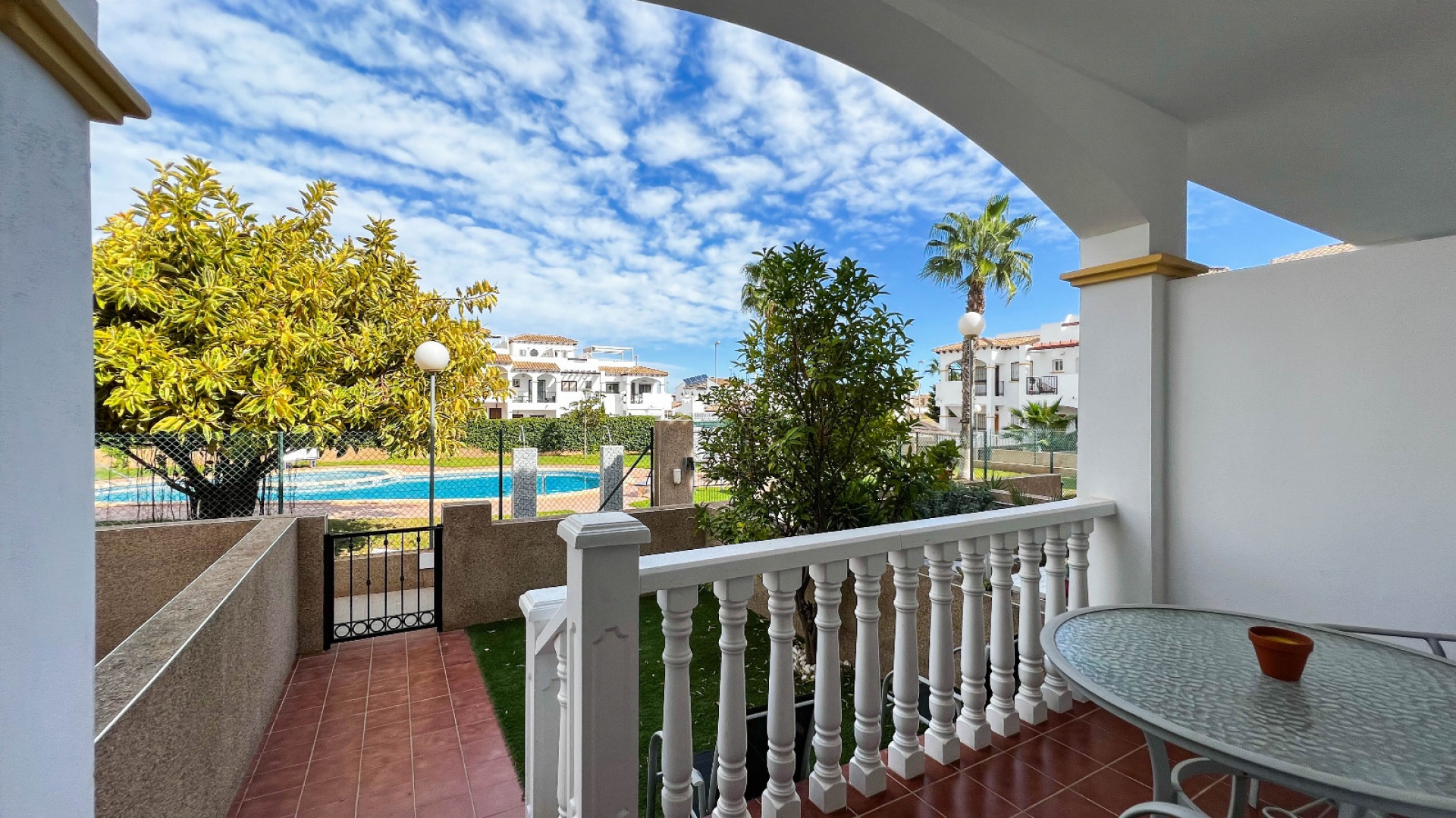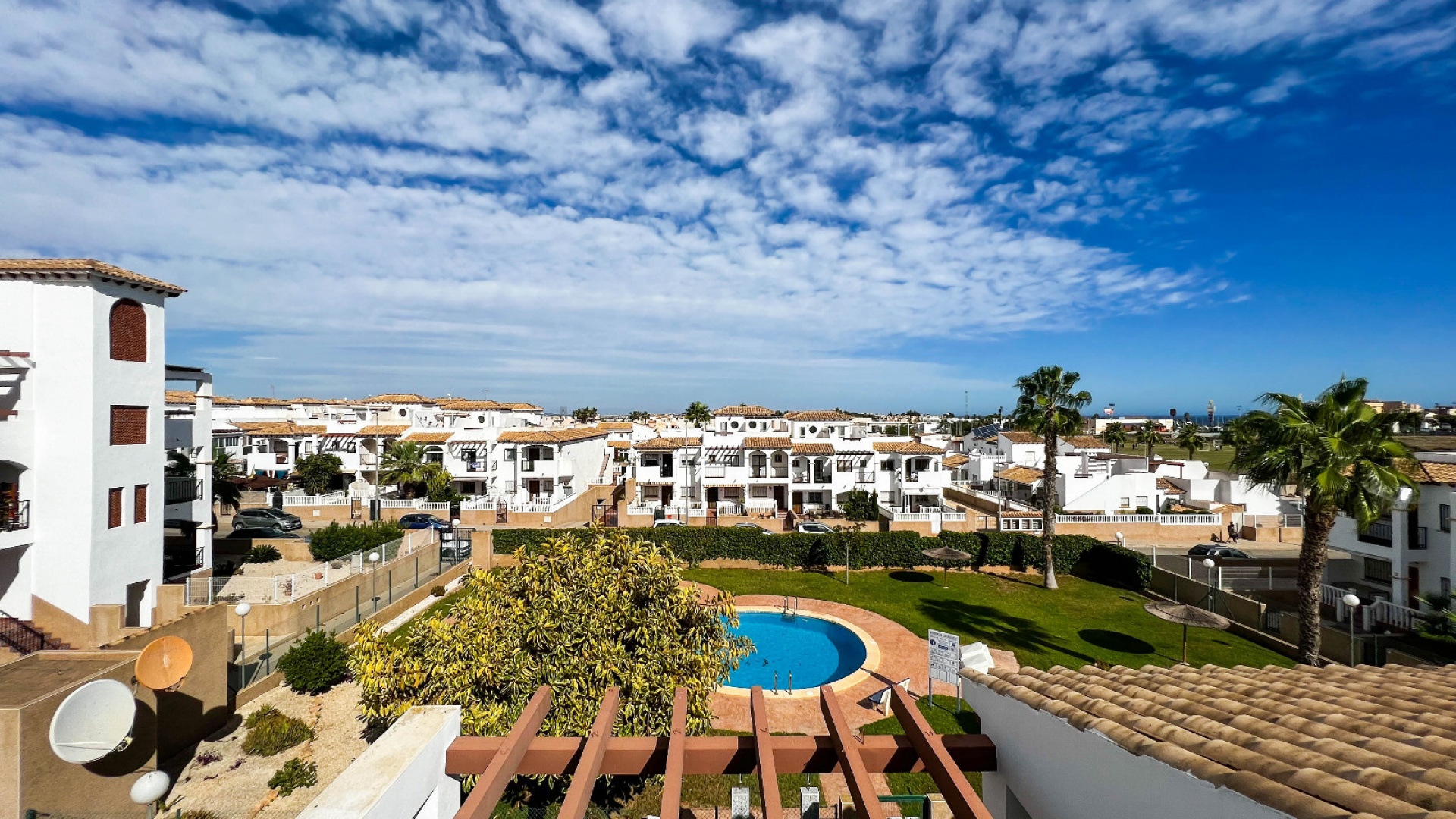 A 3 bed 1.5 bath townhouse with a private rooftop solarium & views to the communal swimming pool located in La Cinuelica, Punta Prima, Costa Blanca.
