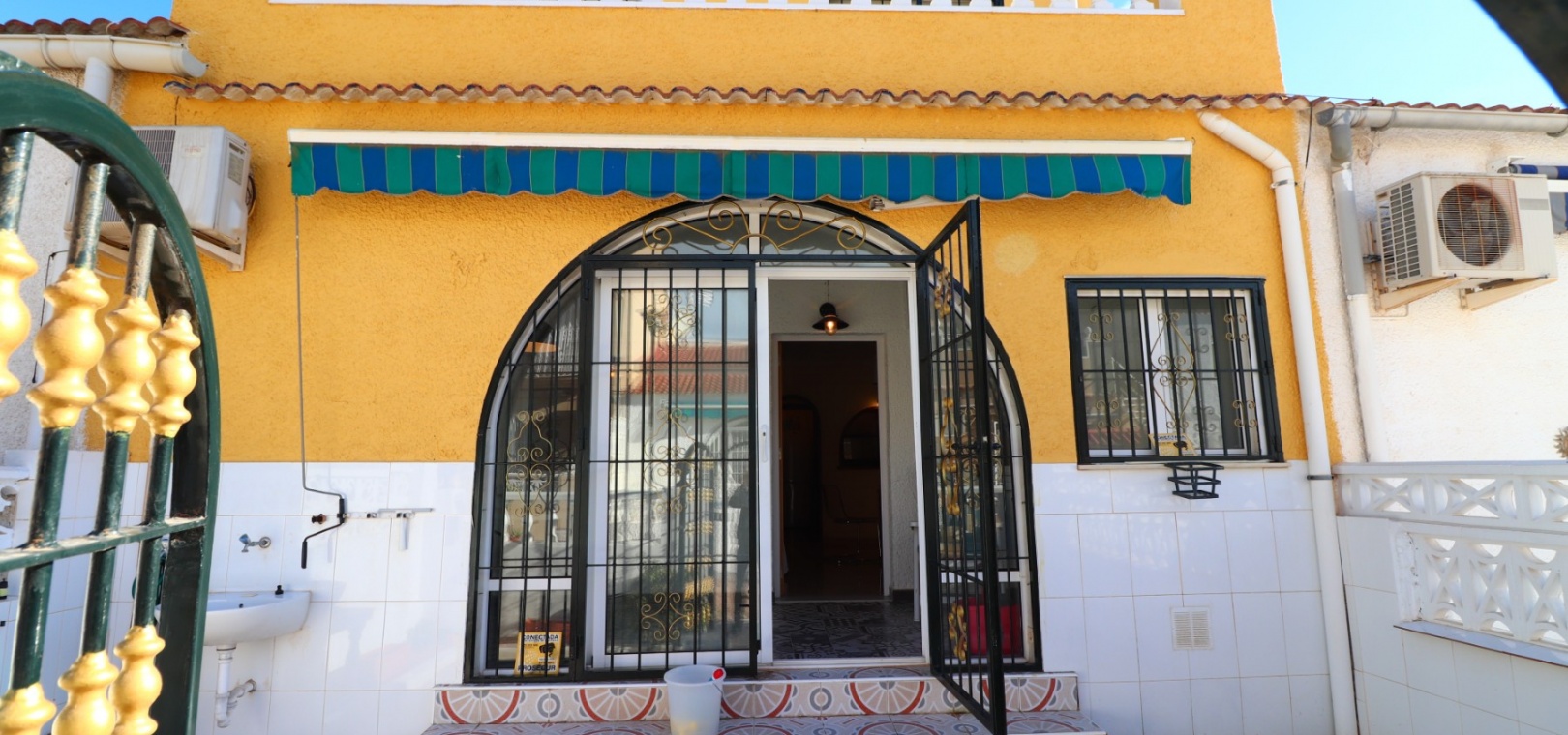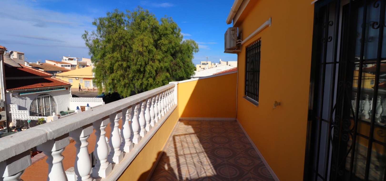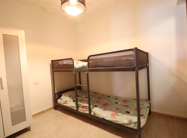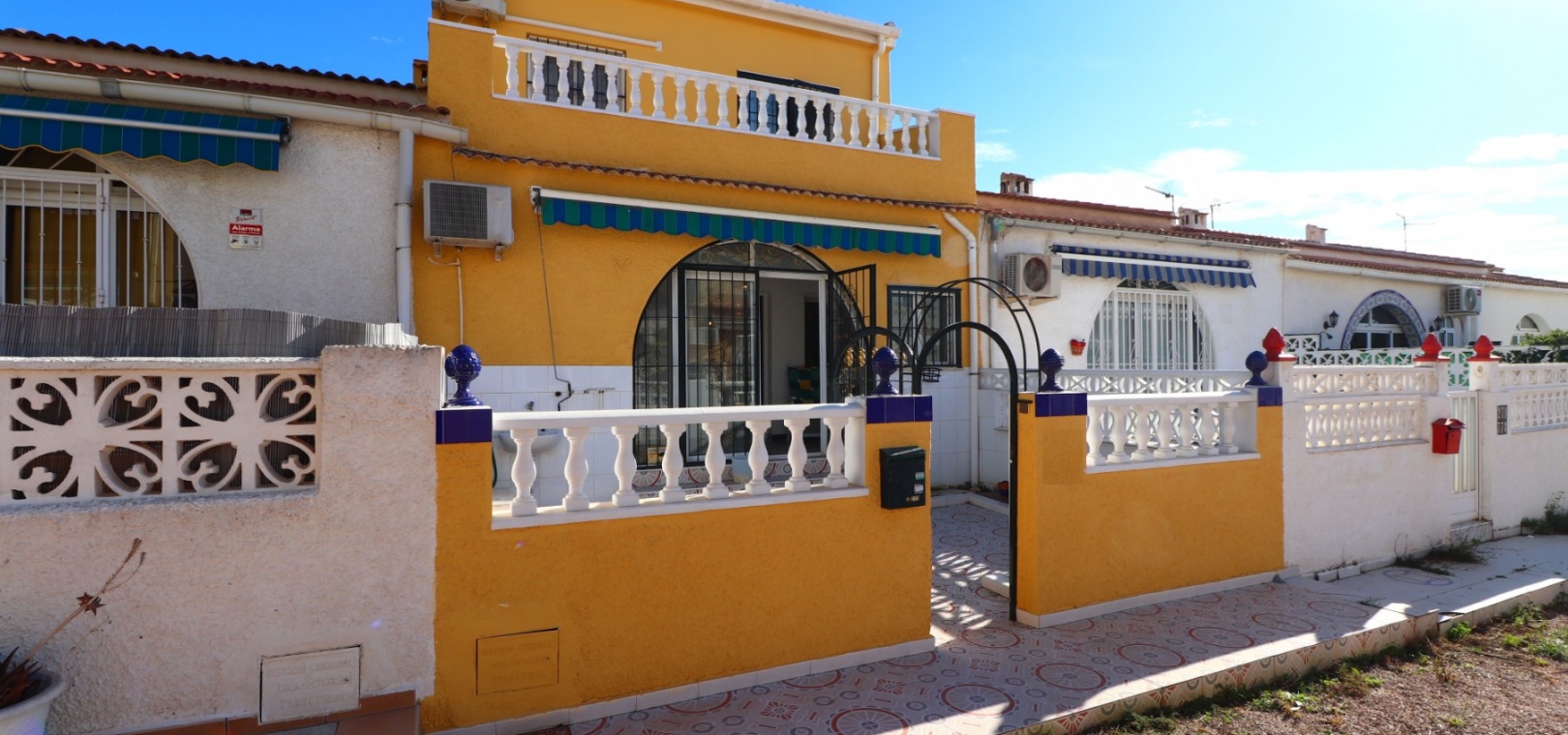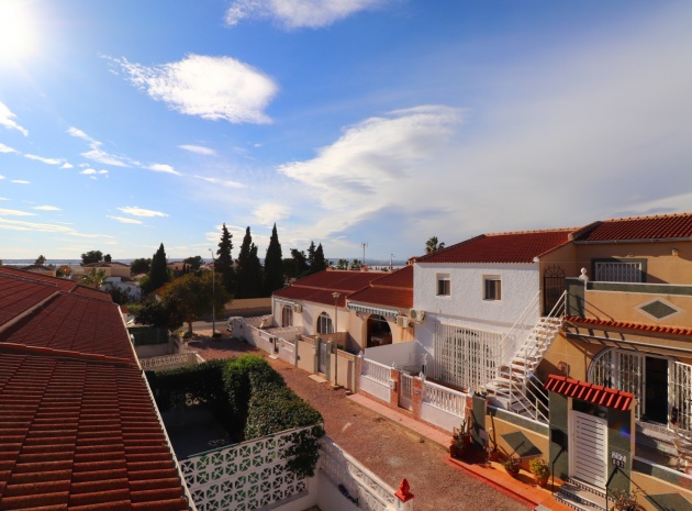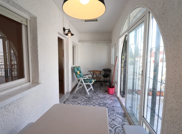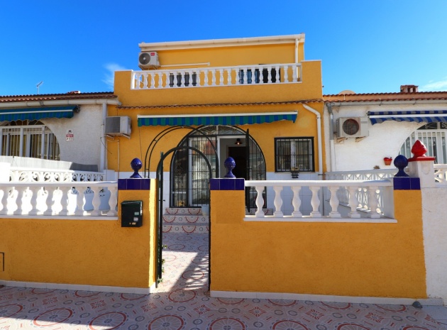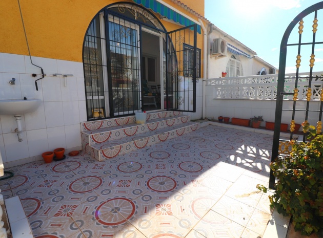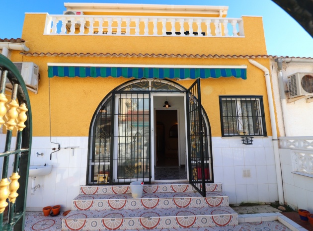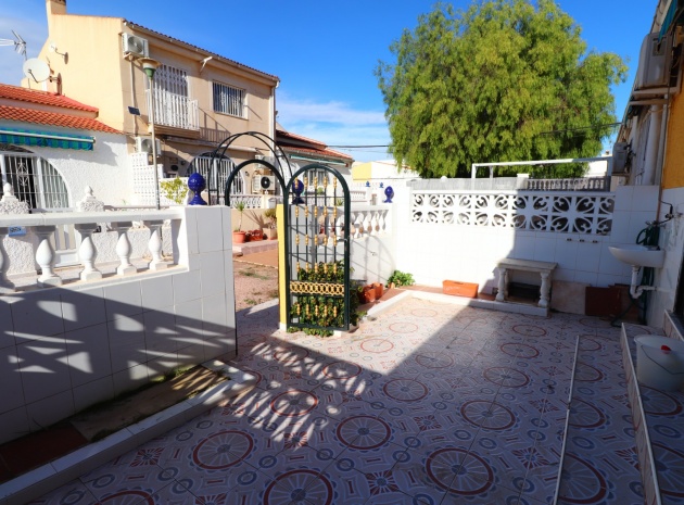 This Renovated, Three Bedroom, Townhouse in El Chaparral, is located right on the border of the nature park and lake, 2 minutes on foot to a variety of bars, restaurants and a small supermarket. Five minutes by car and you have Carrefour superstore, Habaneras shopping centre with bowling/ozone area, cinema, McDonalds.., all bordering the town of Torrevieja, known for its International marina, popular promenade; approximately 10—12 minute drive to a choice of beaches. The property of some 81m2 is accessed via an enclosed entrance terrace with sliding glazed doors leading out to the garden and provides access into the lounge, with air con unit and wide arch leading into the dining room; shower room, separate fitted kitchen with door leading out to a utility area with stairs leading up to the first floor; double bedroom. There are a further two double bedrooms on the first floor, master with air con unit, ceiling fan and a terrace off, where you can enjoy a view to the lakes and mountains; family bathroom with separate shower cubicle. Stairs provide access up to the solarium, via a glazed in room. The front garden is tiled for easy maintenance which has a sink.