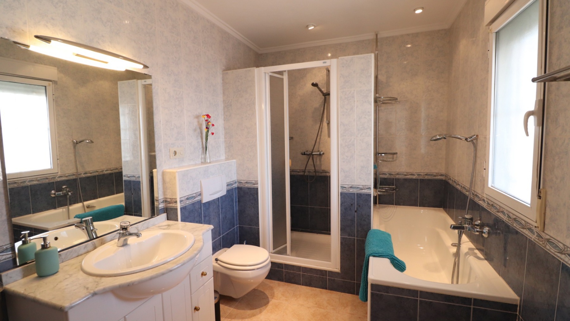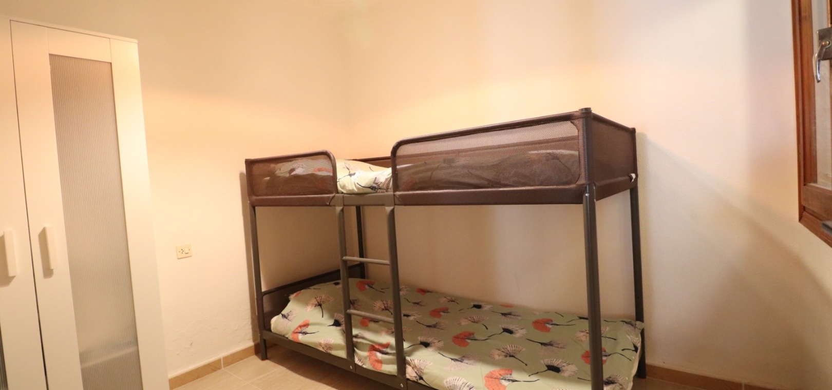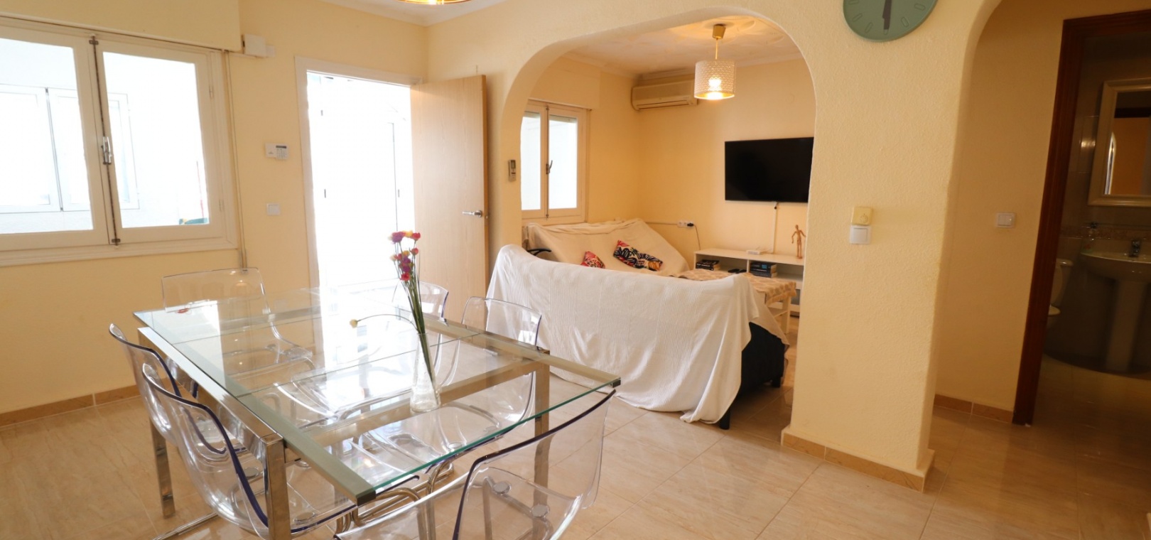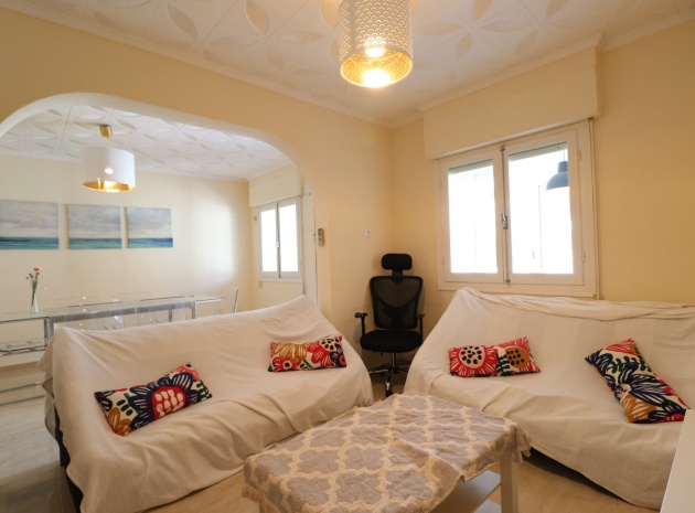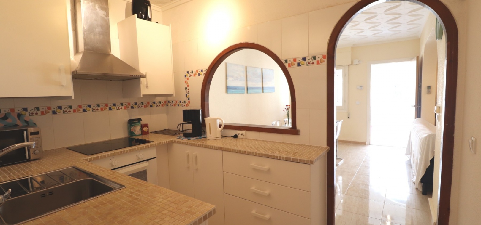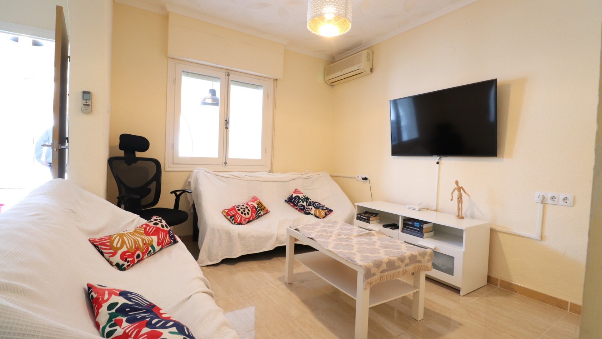 This Renovated, Three Bedroom, Townhouse in El Chaparral, is located right on the border of the nature park and lake, 2 minutes on foot to a variety of bars, restaurants and a small supermarket. Five minutes by car and you have Carrefour superstore, Habaneras shopping centre with bowling/ozone area, cinema, McDonalds.., all bordering the town of Torrevieja, known for its International marina, popular promenade; approximately 10—12 minute drive to a choice of beaches. The property of some 81m2 is accessed via an enclosed entrance terrace with sliding glazed doors leading out to the garden and provides access into the lounge, with air con unit and wide arch leading into the dining room; shower room, separate fitted kitchen with door leading out to a utility area with stairs leading up to the first floor; double bedroom. There are a further two double bedrooms on the first floor, master with air con unit, ceiling fan and a terrace off, where you can enjoy a view to the lakes and mountains; family bathroom with separate shower cubicle. Stairs provide access up to the solarium, via a glazed in room. The front garden is tiled for easy maintenance which has a sink.