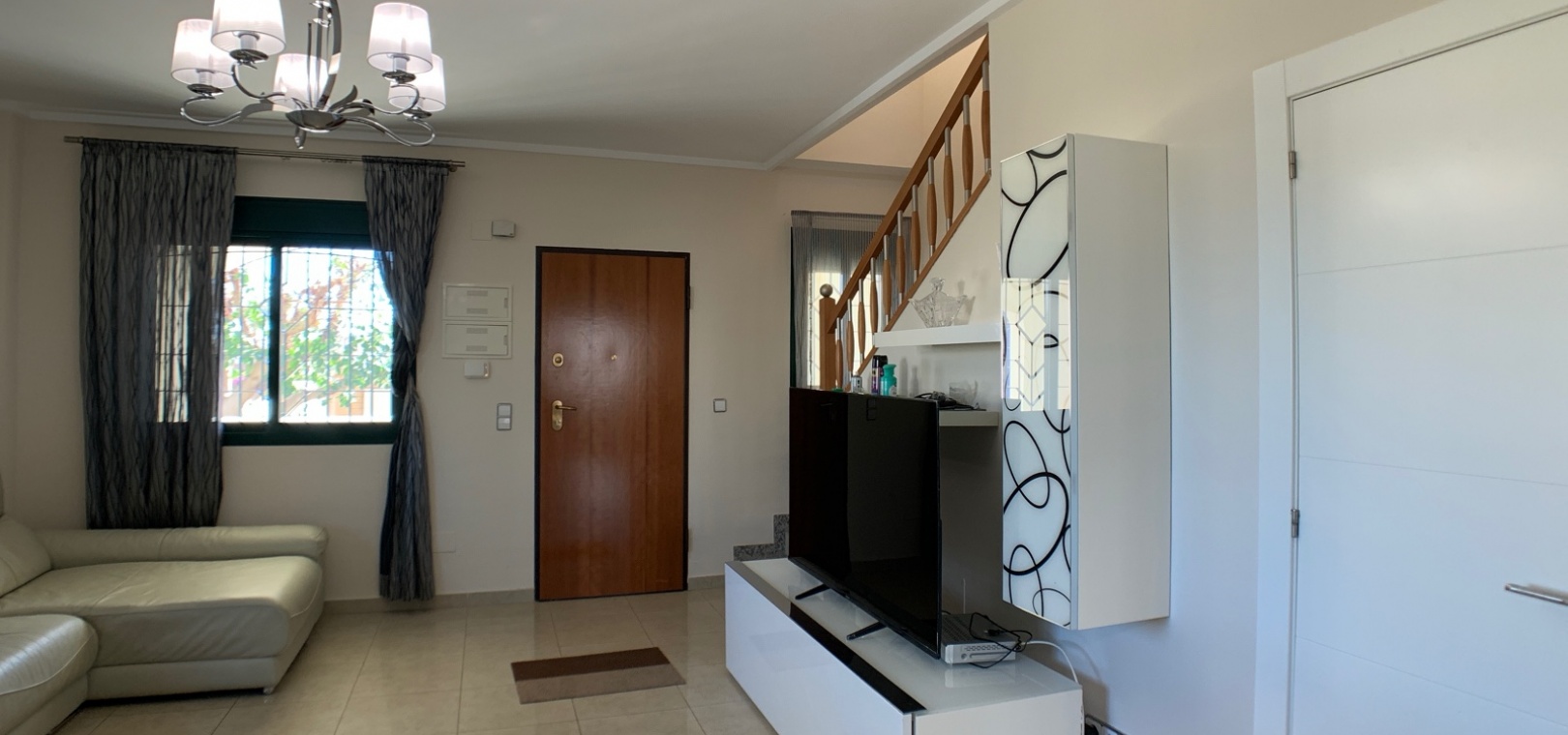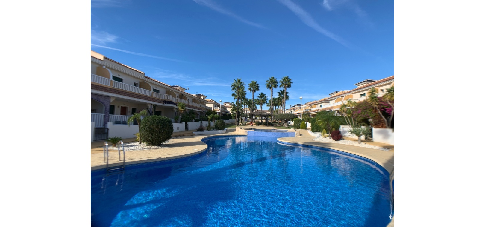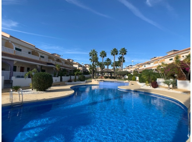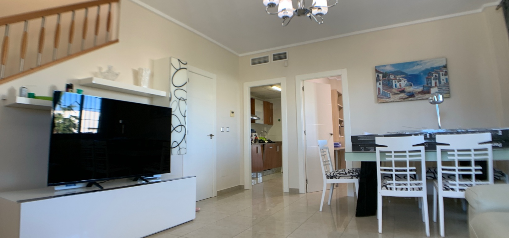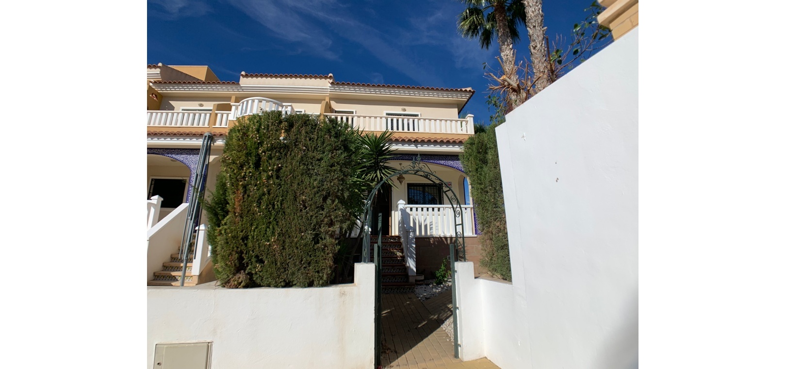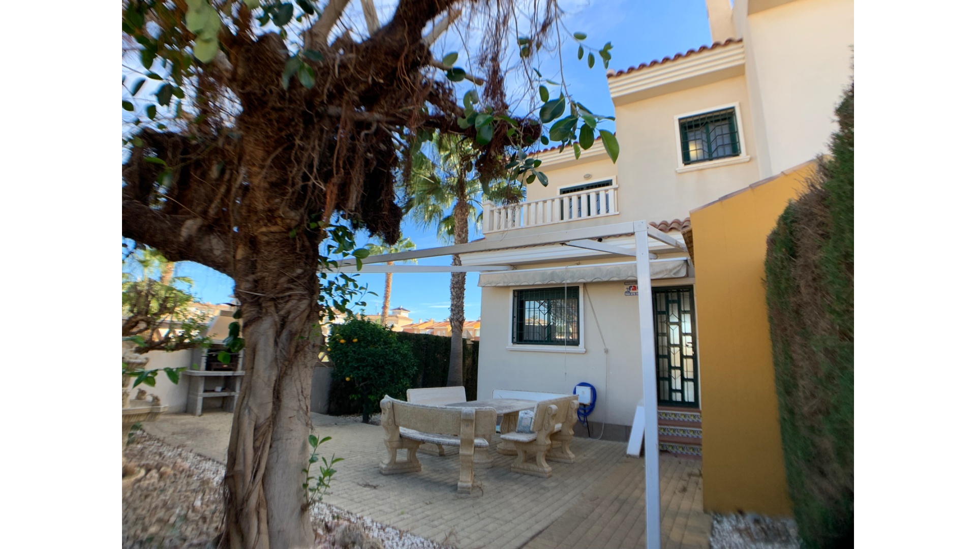 Welcome to this beautiful "Lola" style townhouse in the luxurious Albamar development.This development offers 5 communal pools, where one of them has a jacuzzi feature, and 2 of them are heated pools. This community is gated, has beautiful outside spaces with well maintened gardens and parking off road within the community. The property has a living room, kitchen, and one bedroom & bathroom on the first floor. From the kitchen you have excess to another private terrace. By the main entrance you have a beautiful terrace with plenty of sun. Here you will also find an upper terrace where you can close the windows to make it a perfect addition to the living room in the colder months. On the second floor you will find two bedrooms with wardrobes, and two bedrooms. From both of the bedrooms you have excess to a terrace. The house is sold furnished, and it has AC.