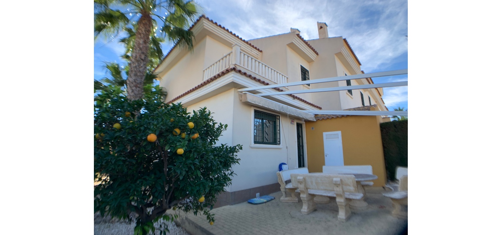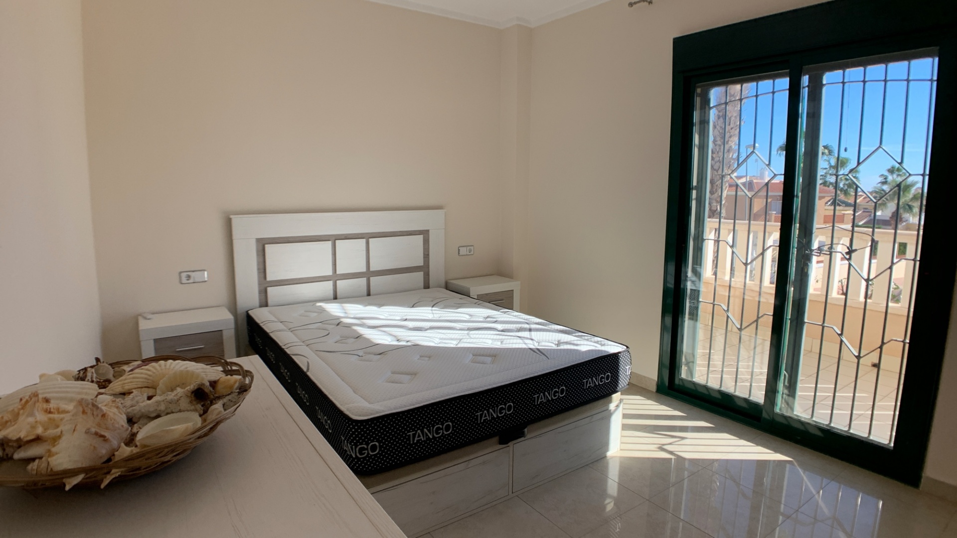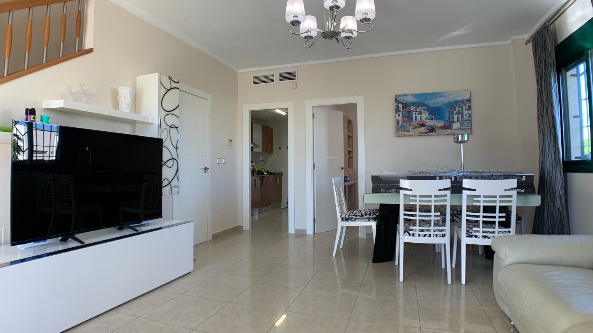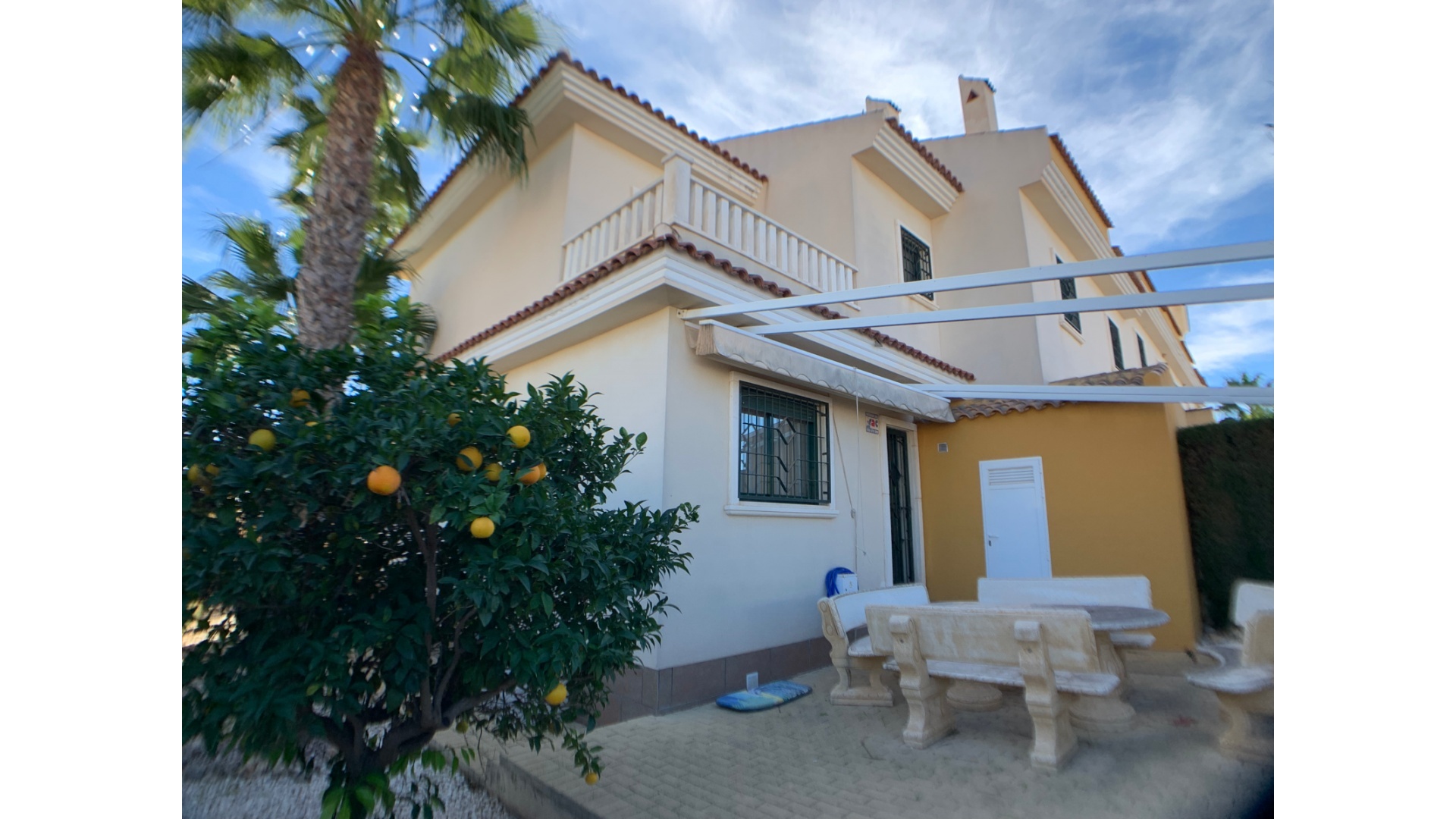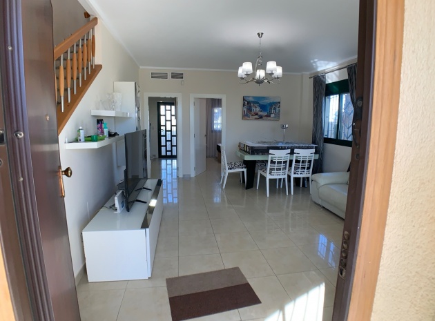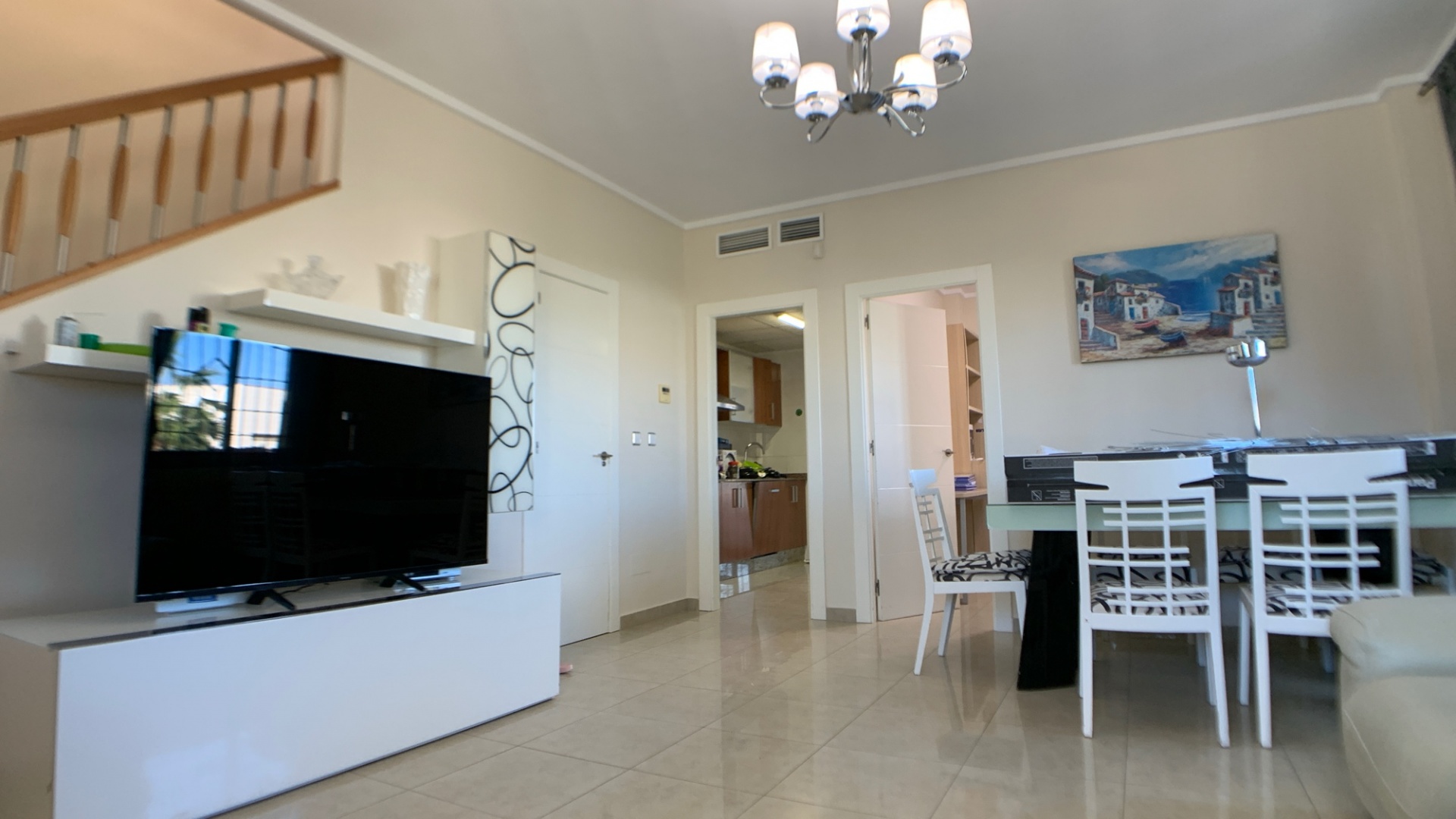 Welcome to this beautiful "Lola" style townhouse in the luxurious Albamar development.This development offers 5 communal pools, where one of them has a jacuzzi feature, and 2 of them are heated pools. This community is gated, has beautiful outside spaces with well maintened gardens and parking off road within the community. The property has a living room, kitchen, and one bedroom & bathroom on the first floor. From the kitchen you have excess to another private terrace. By the main entrance you have a beautiful terrace with plenty of sun. Here you will also find an upper terrace where you can close the windows to make it a perfect addition to the living room in the colder months. On the second floor you will find two bedrooms with wardrobes, and two bedrooms. From both of the bedrooms you have excess to a terrace. The house is sold furnished, and it has AC.