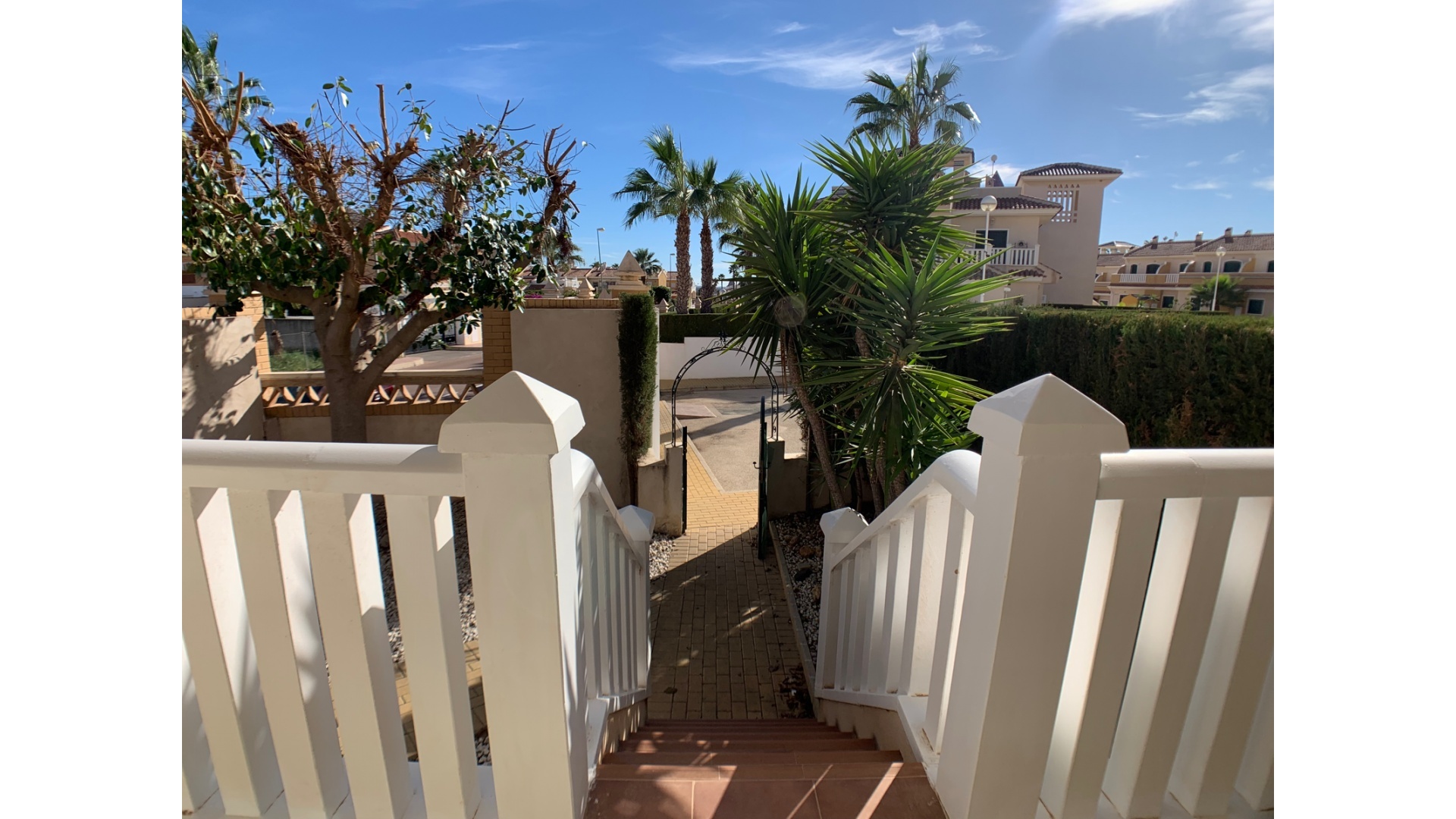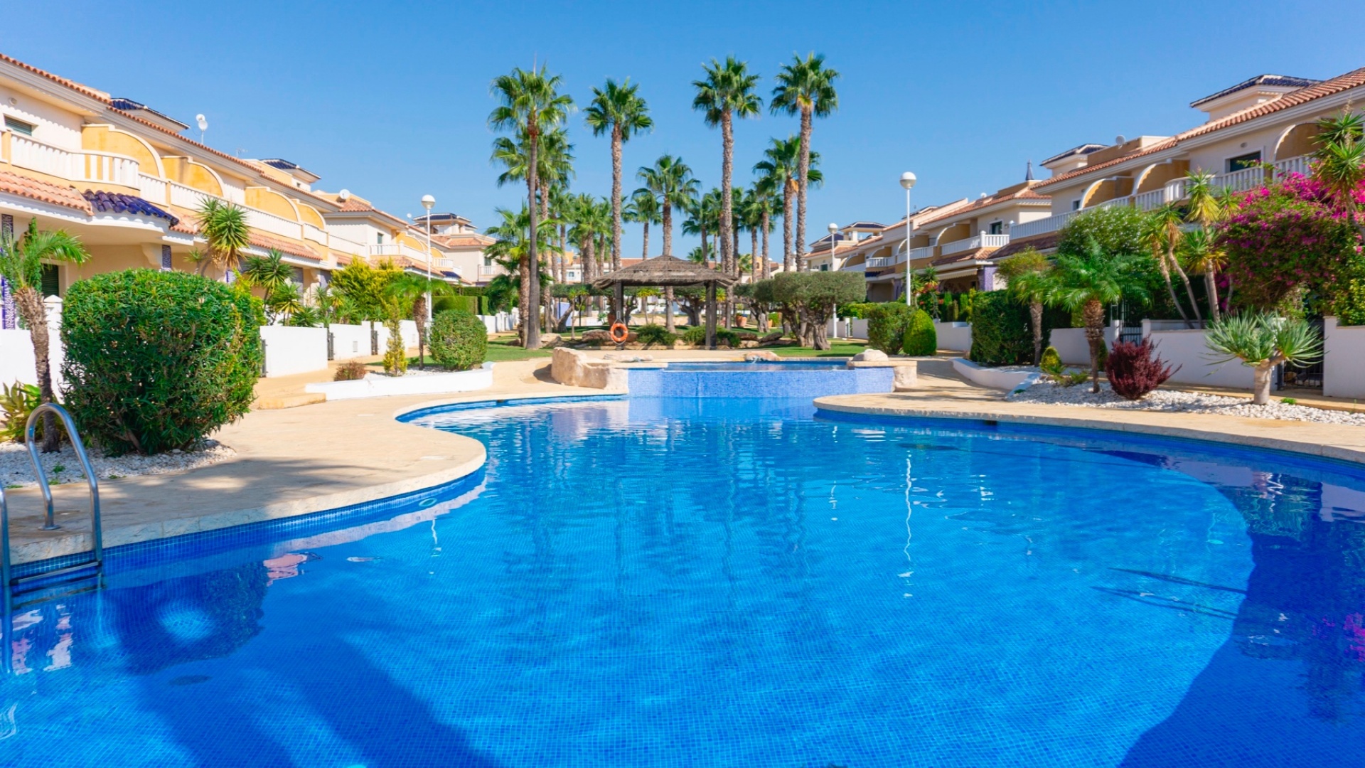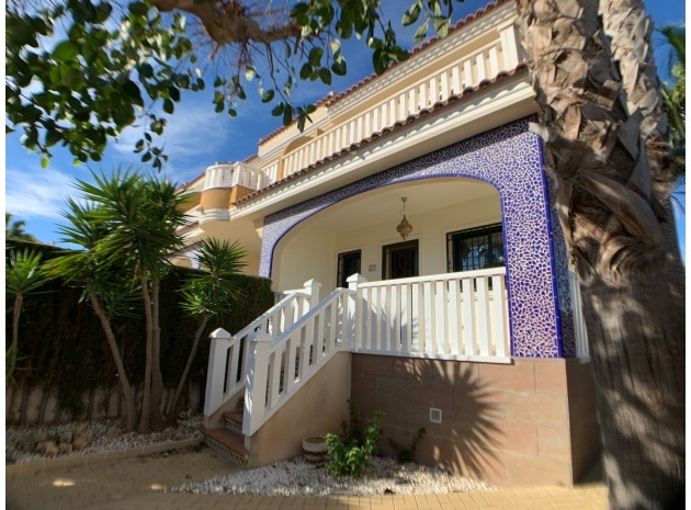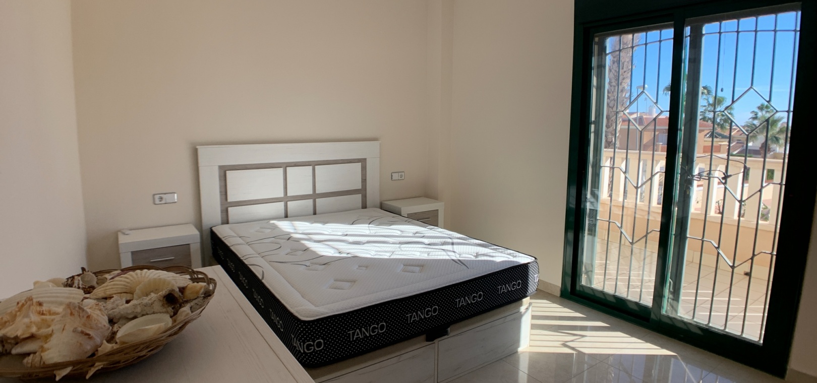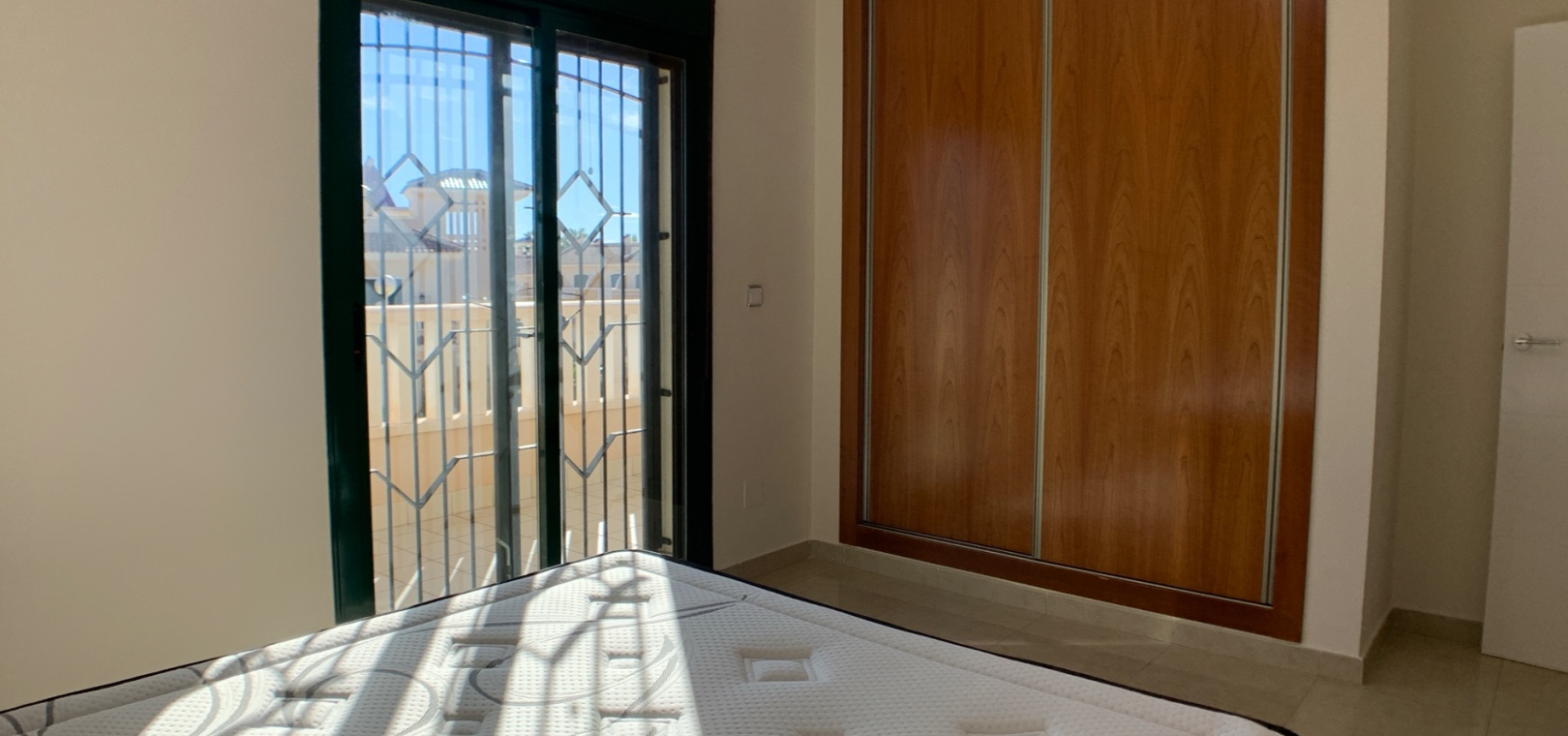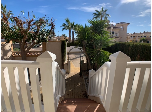 Welcome to this beautiful "Lola" style townhouse in the luxurious Albamar development.This development offers 5 communal pools, where one of them has a jacuzzi feature, and 2 of them are heated pools. This community is gated, has beautiful outside spaces with well maintened gardens and parking off road within the community. The property has a living room, kitchen, and one bedroom & bathroom on the first floor. From the kitchen you have excess to another private terrace. By the main entrance you have a beautiful terrace with plenty of sun. Here you will also find an upper terrace where you can close the windows to make it a perfect addition to the living room in the colder months. On the second floor you will find two bedrooms with wardrobes, and two bedrooms. From both of the bedrooms you have excess to a terrace. The house is sold furnished, and it has AC.