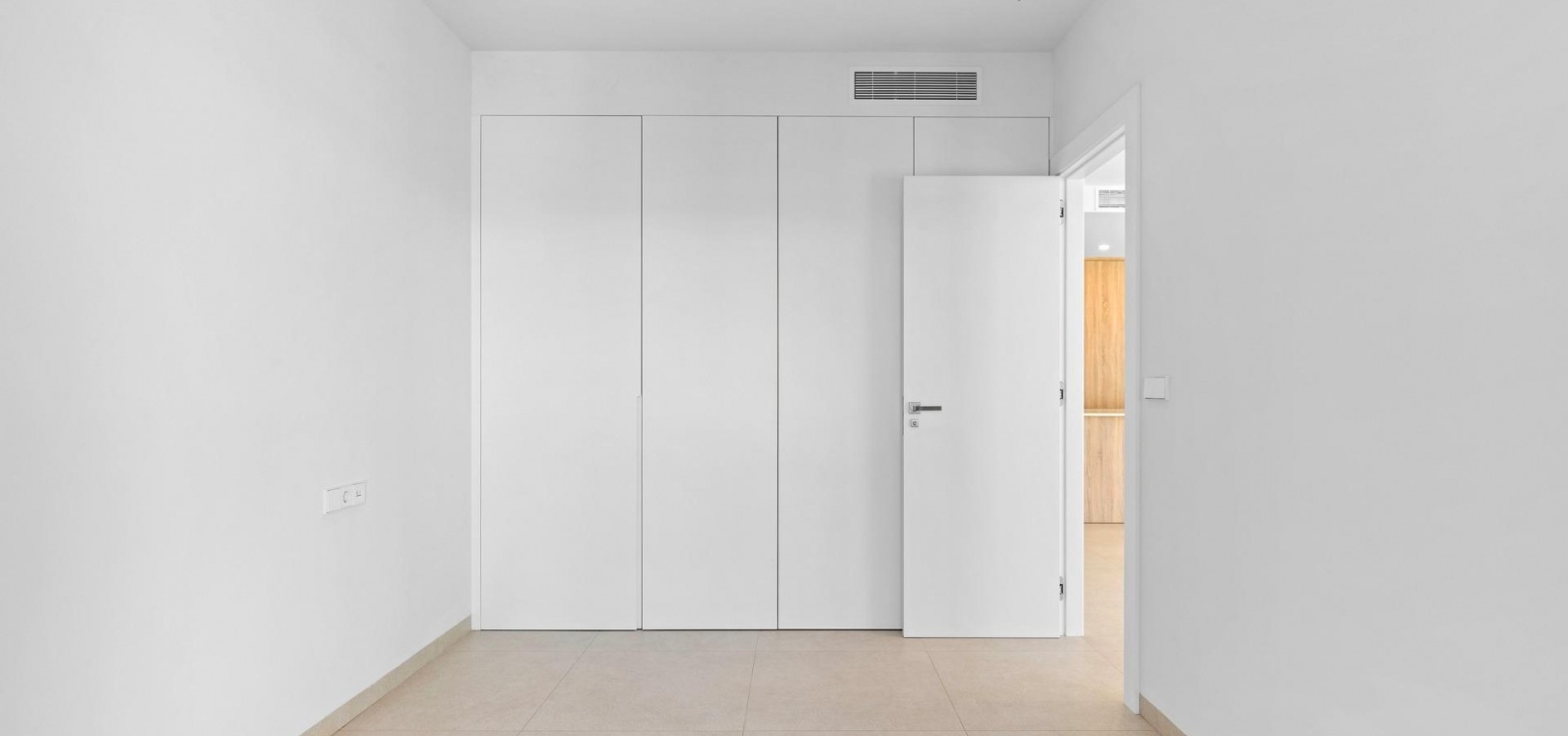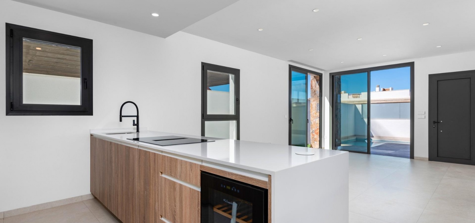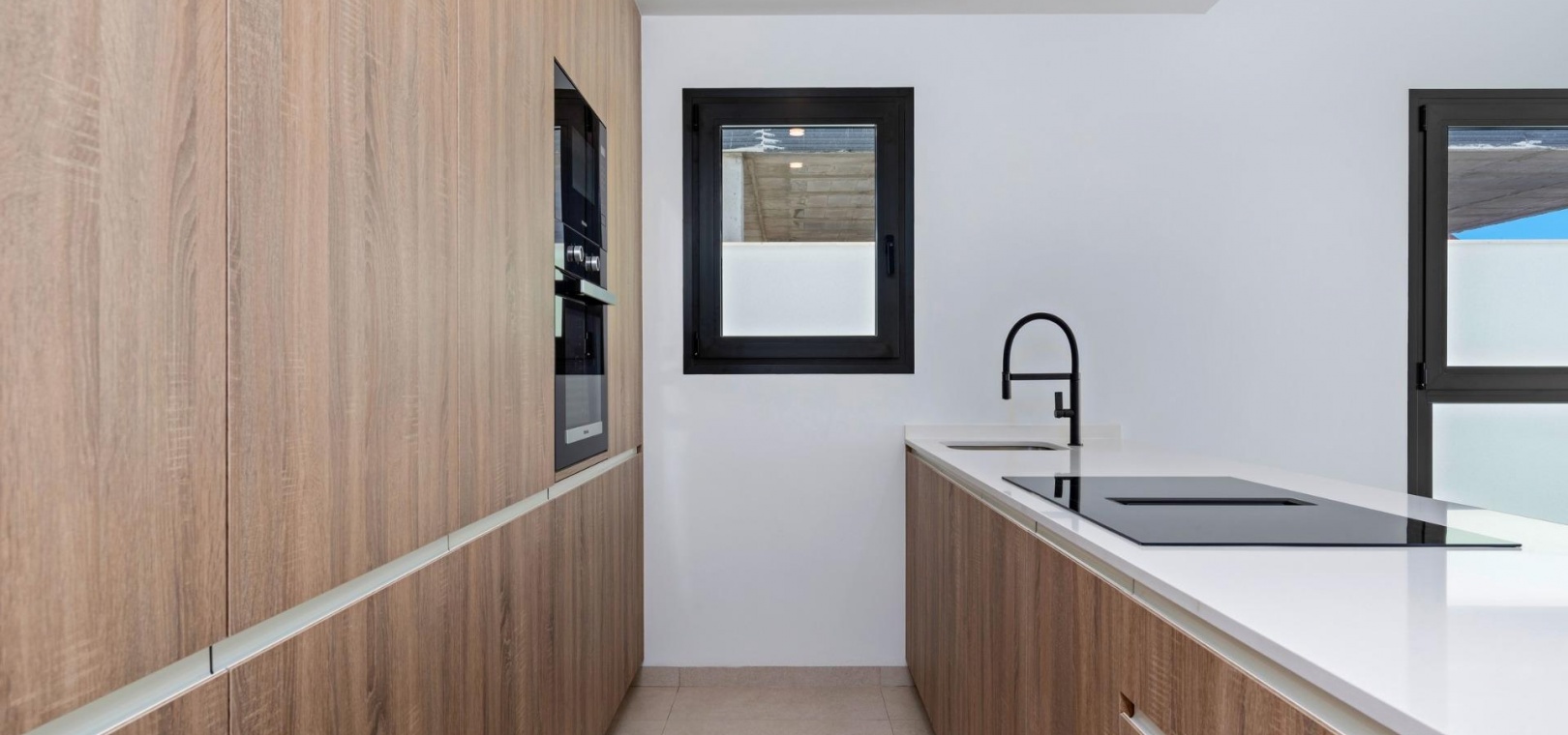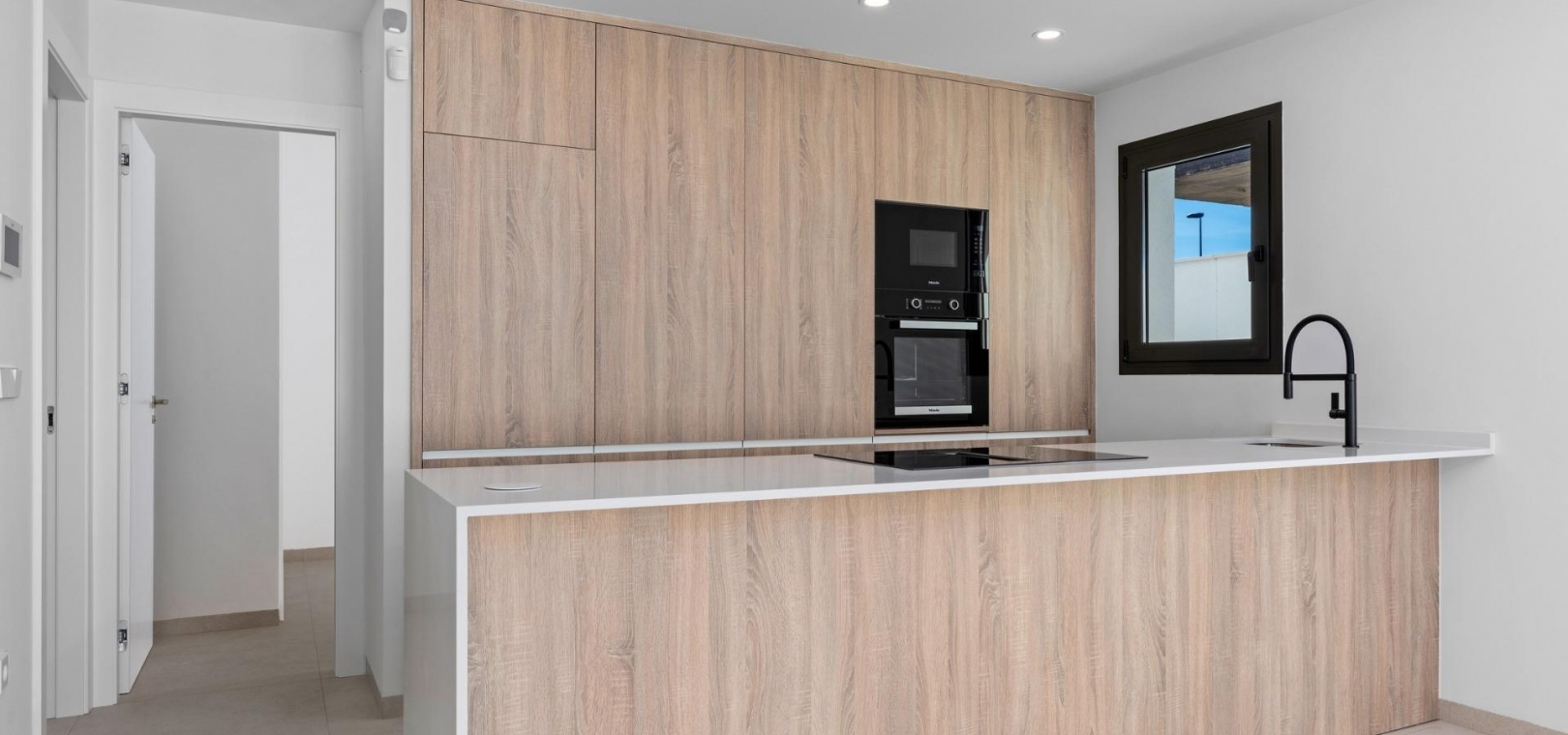 Fully furnished kitchen in white gloss or wood colour includes Induction hob with integrated extractor, oven, microwave, washing machine, integrated refrigerator, and integrated dishwasher.