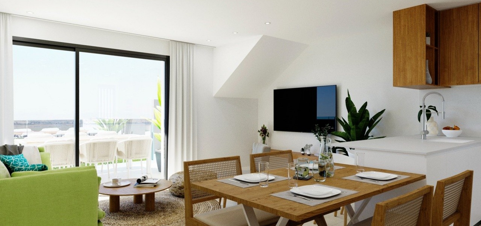 New Build top floor bungalows has 2 bedrooms, 2 bathrooms, open plan kitchen with spacious living room, fitted wardrobes, terrace, private solarium and underground parking space.