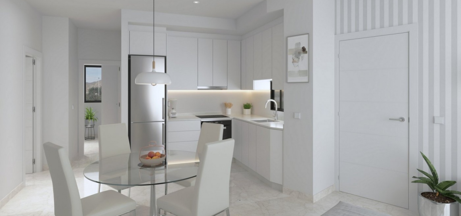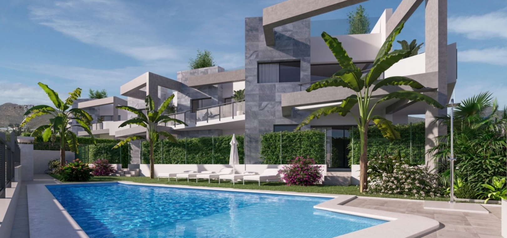 New Build residential with community pool of 12 bungalow apartments with 2 and 3 bedrooms, 2 bathrooms, open plan kitchen with the lounge area, fitted wardrobes. They are delivered furnished and with air conditioning!