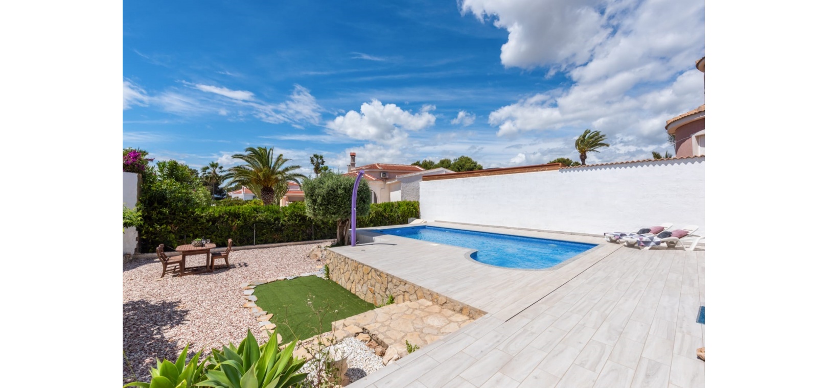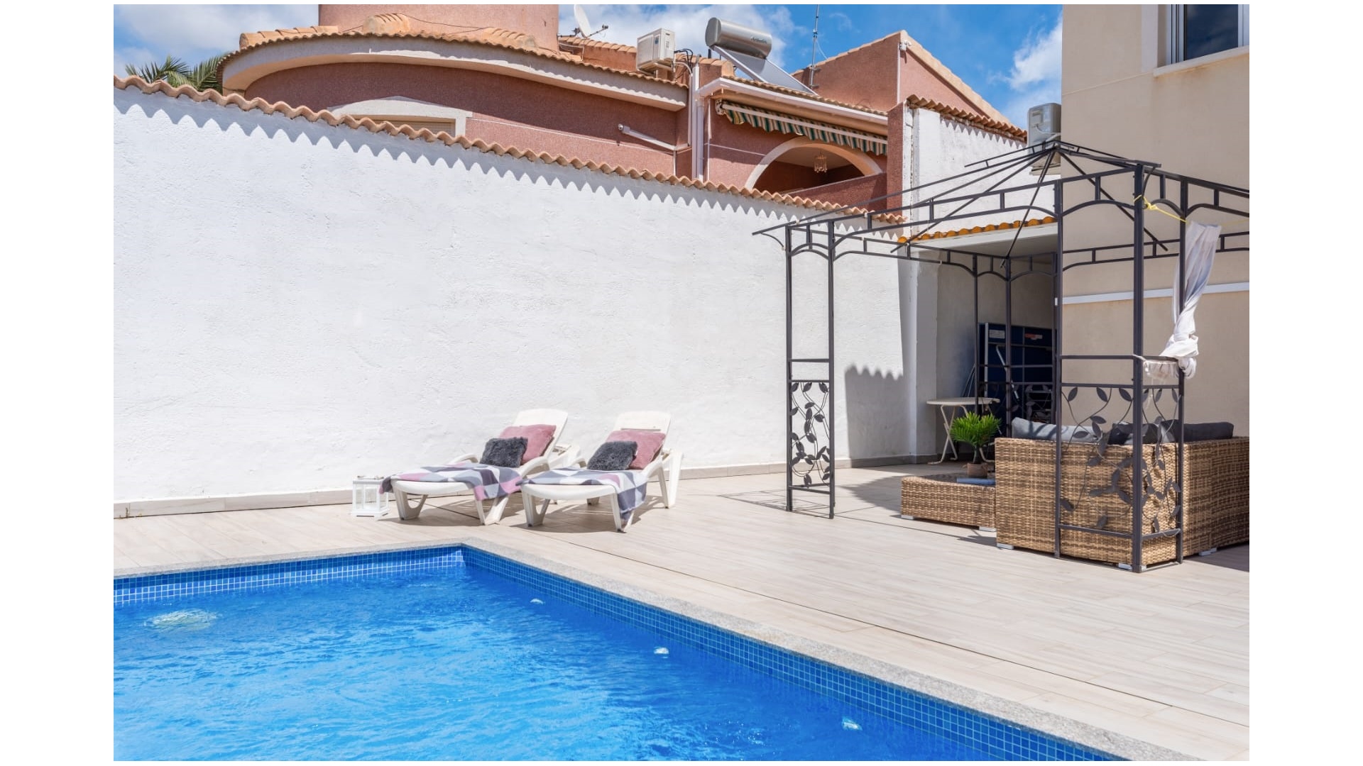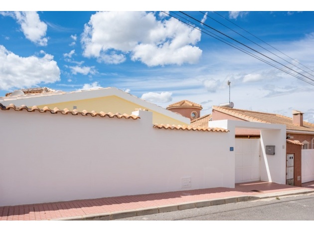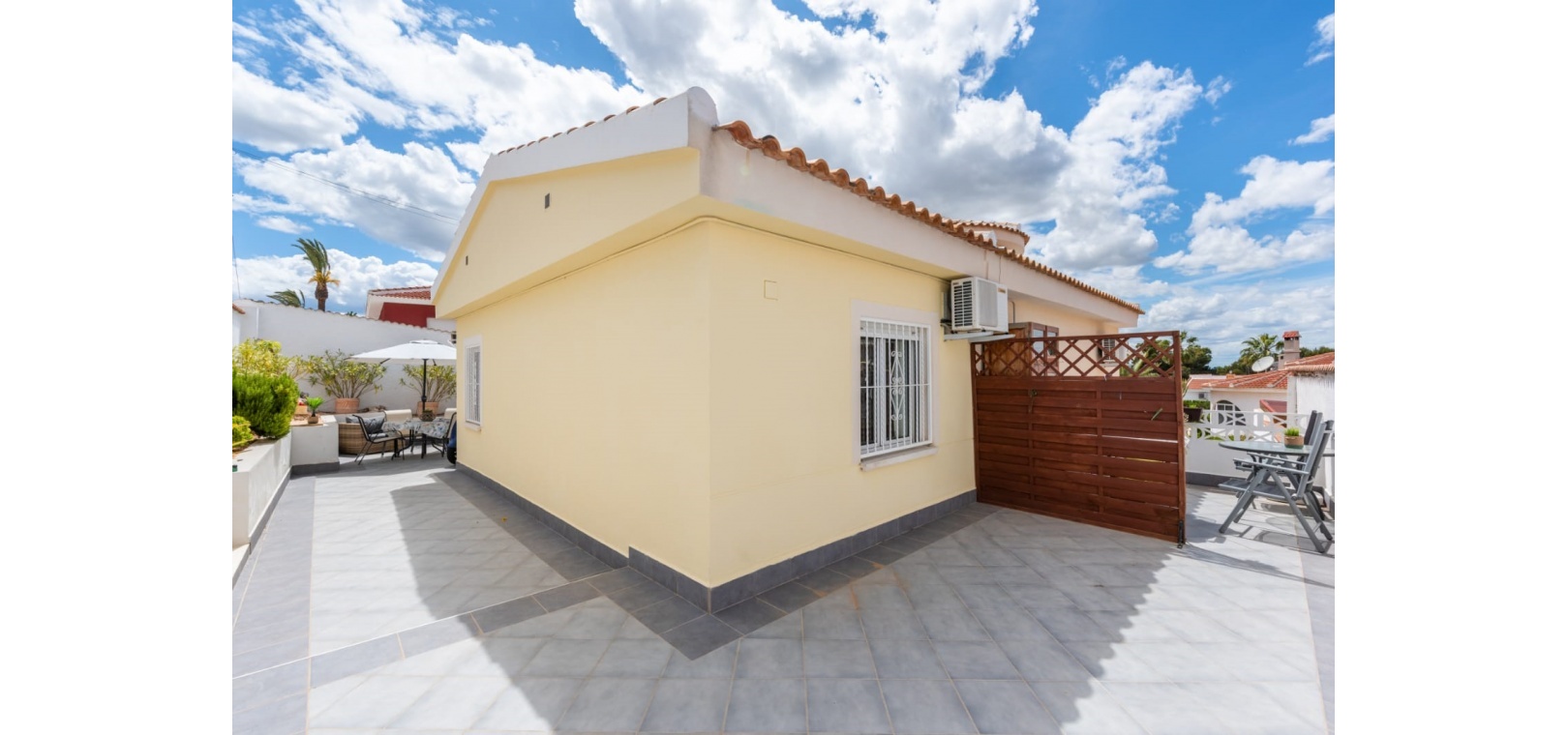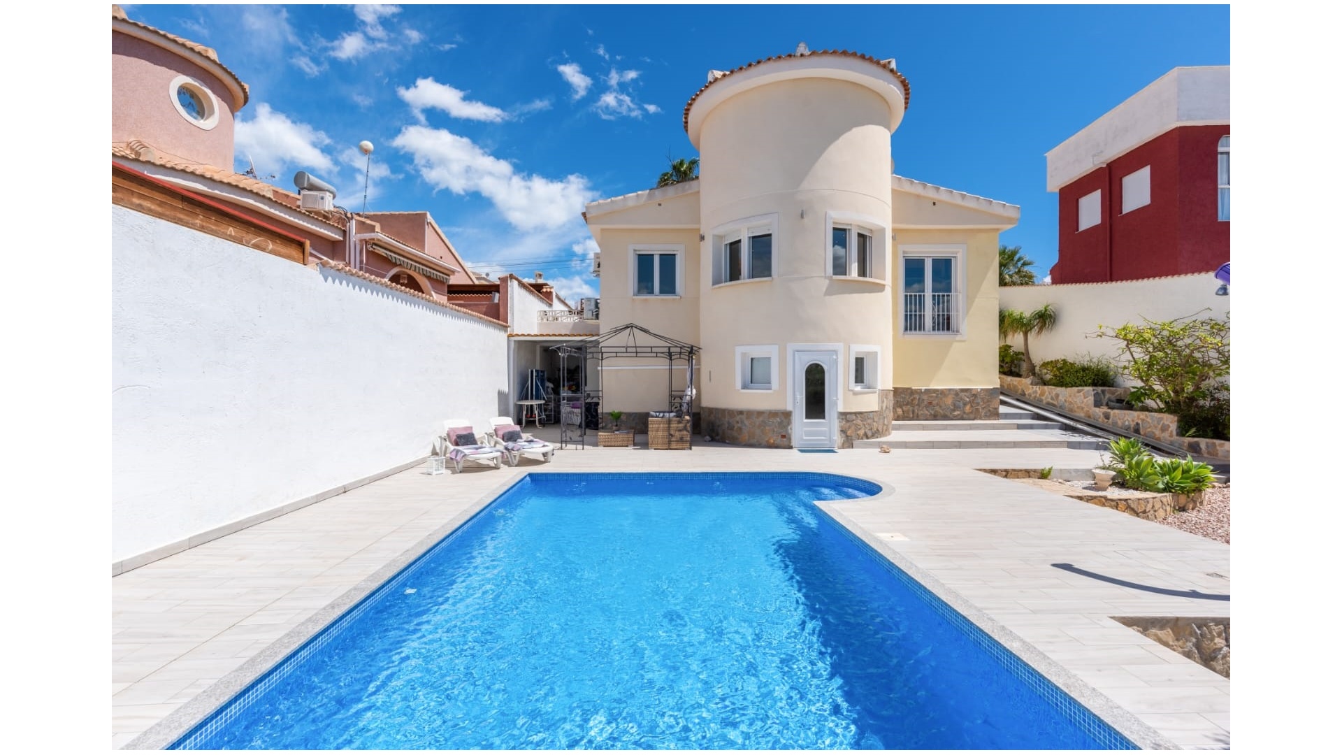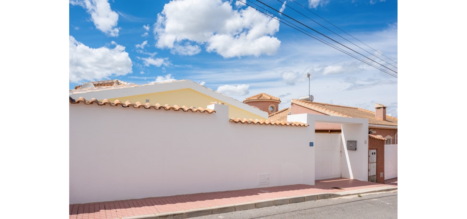 The villa is distributed over two levels. The main house is on the upper level and consists of two double bedrooms and one single sleeping alcove. The master bedroom has a large en-suite bathroom and this floor also has a shared bathroom. The main level also consists of an entrance area, a living room, a dining room and a kitchen.In the semi-basement you can find a flat with separate entrance, consisting of a living room with sleeping space, kitchen and a bathroom.The house has new doors, portholes, double glazed windows, new kitchen and the main floor has a beautiful wooden floor. It has air conditioning throughout.Outdoor areaThe house is located on a plot of 500 m2 with south-east orientation. In the garden you can find a beautiful swimming pool with outdoor shower. The area around the pool is tiled and is perfect for outdoor lounging areas and sun loungers. Next to the entrance there is also a seating area and an off road parking space.The rest of the garden is laid to gravel, also with space for outdoor seating areas.AreaThe villa is located in Ciudad Quesada, within walking distance to the main street and all its amenities.