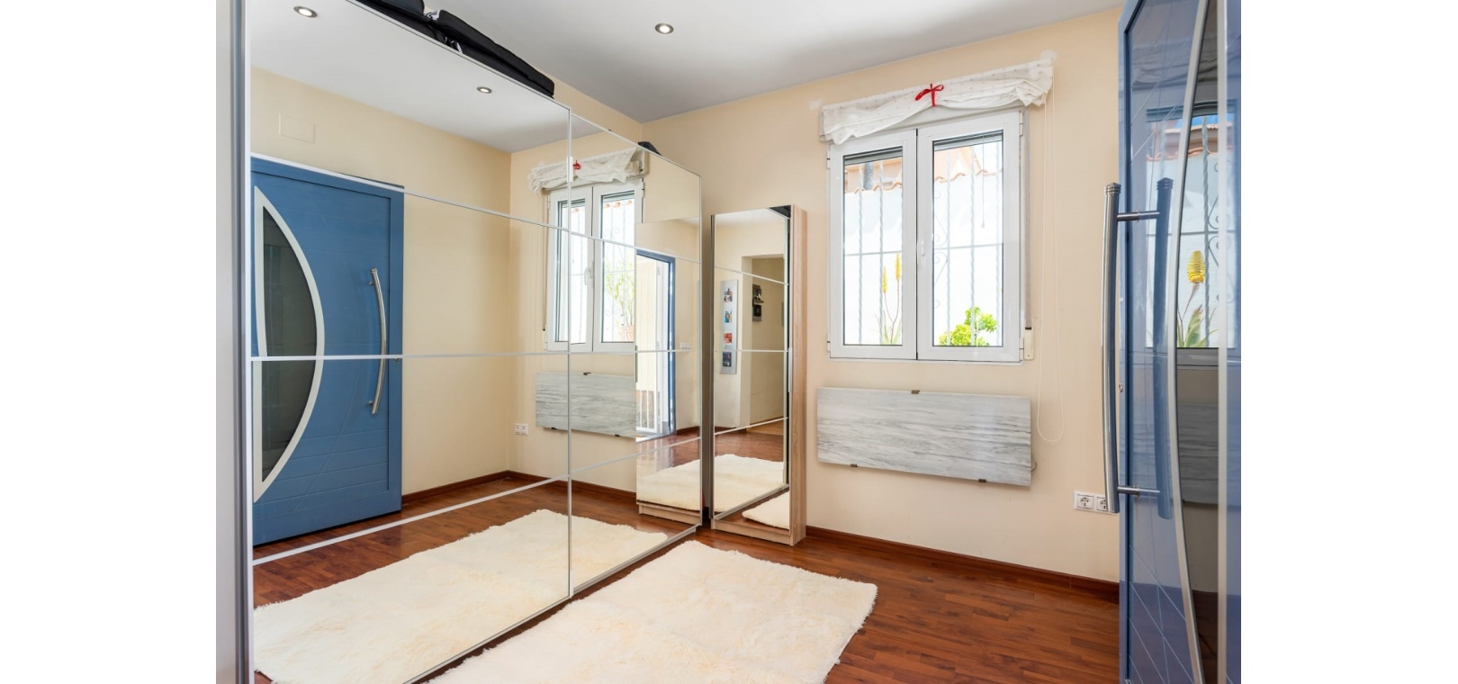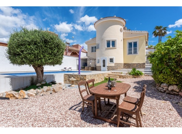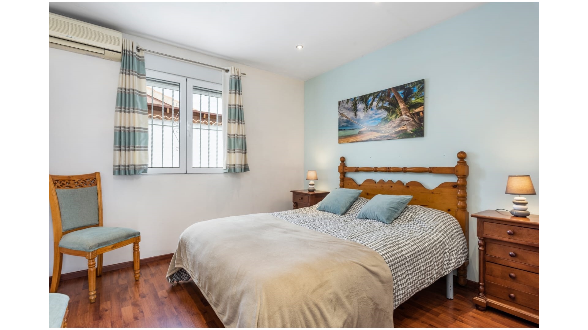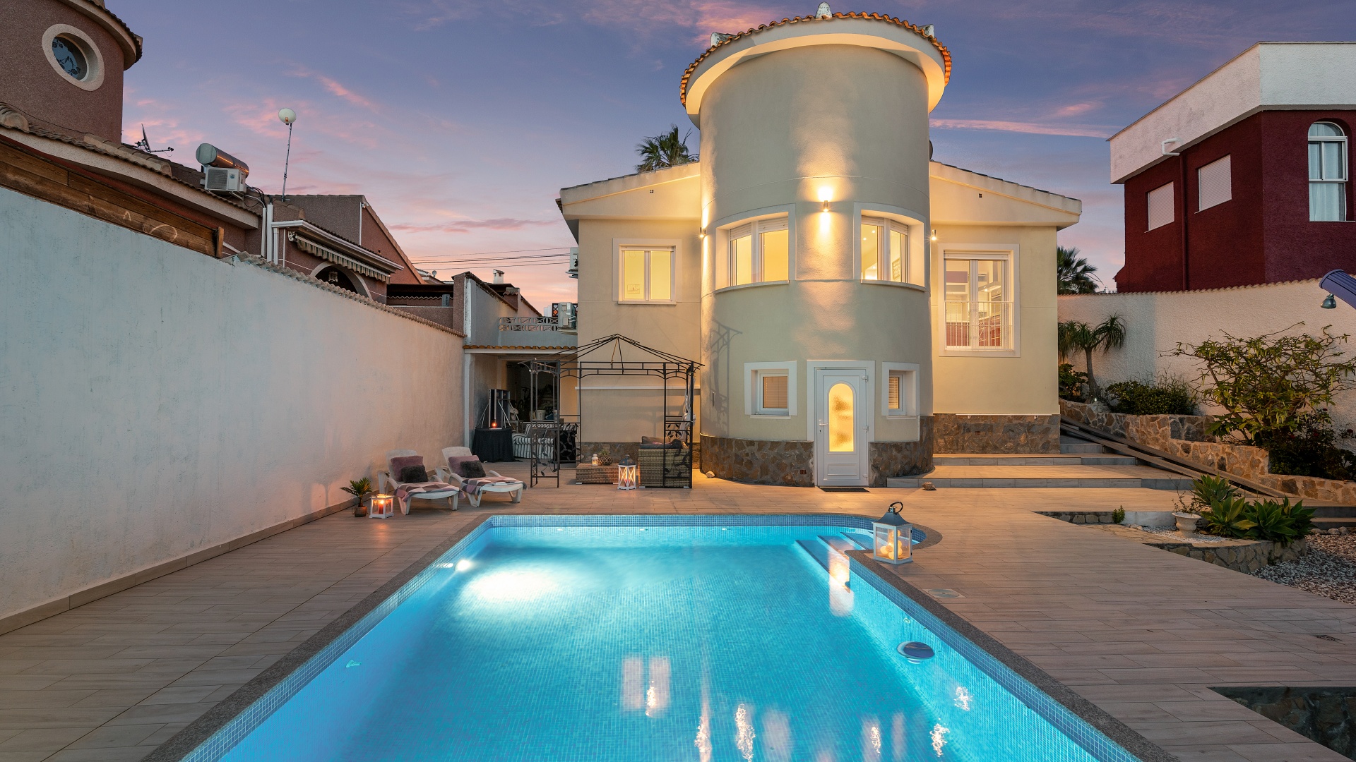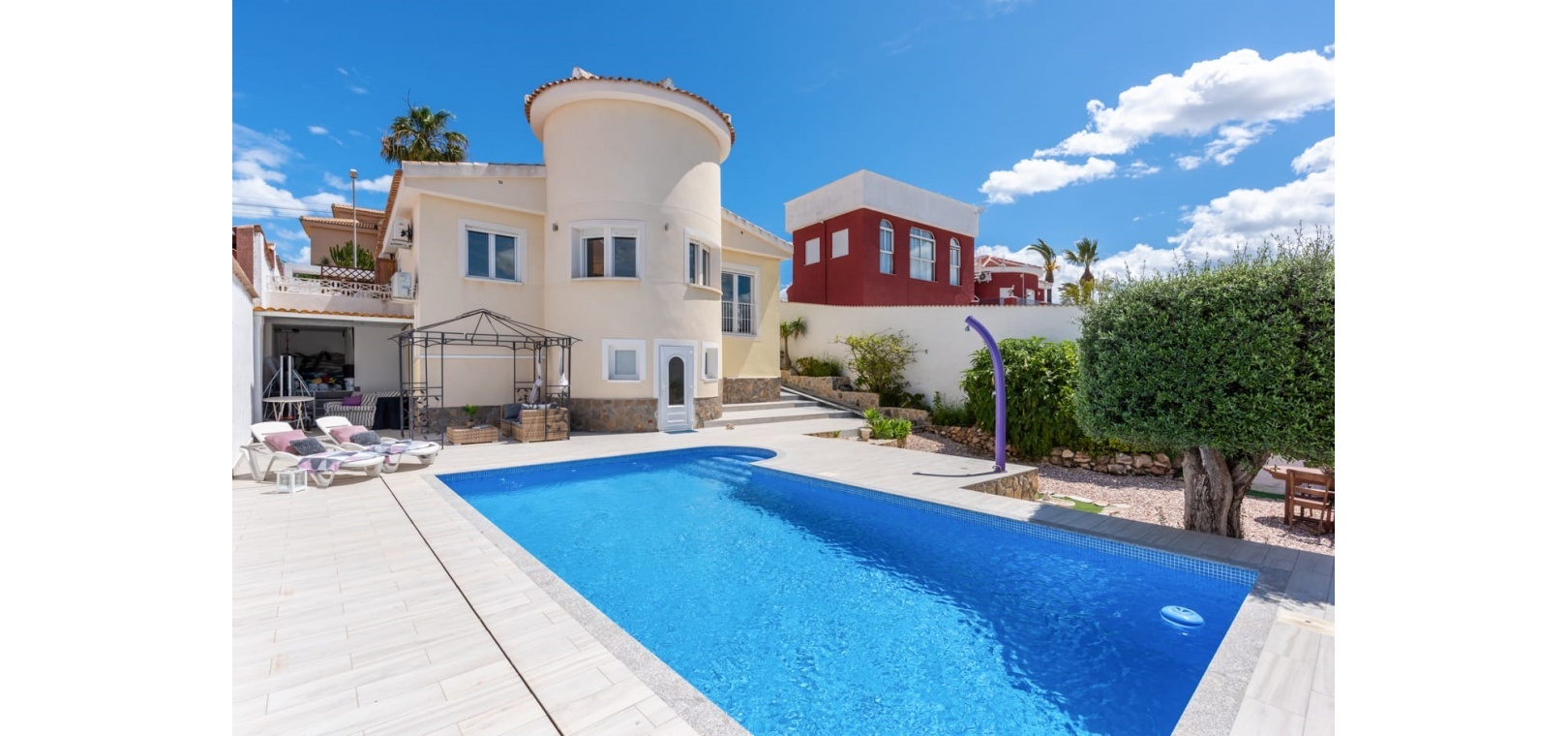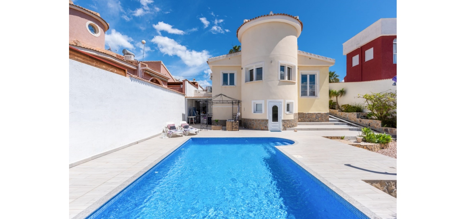 The villa is distributed over two levels. The main house is on the upper level and consists of two double bedrooms and one single sleeping alcove. The master bedroom has a large en-suite bathroom and this floor also has a shared bathroom. The main level also consists of an entrance area, a living room, a dining room and a kitchen.In the semi-basement you can find a flat with separate entrance, consisting of a living room with sleeping space, kitchen and a bathroom.The house has new doors, portholes, double glazed windows, new kitchen and the main floor has a beautiful wooden floor. It has air conditioning throughout.Outdoor areaThe house is located on a plot of 500 m2 with south-east orientation. In the garden you can find a beautiful swimming pool with outdoor shower. The area around the pool is tiled and is perfect for outdoor lounging areas and sun loungers. Next to the entrance there is also a seating area and an off road parking space.The rest of the garden is laid to gravel, also with space for outdoor seating areas.AreaThe villa is located in Ciudad Quesada, within walking distance to the main street and all its amenities.